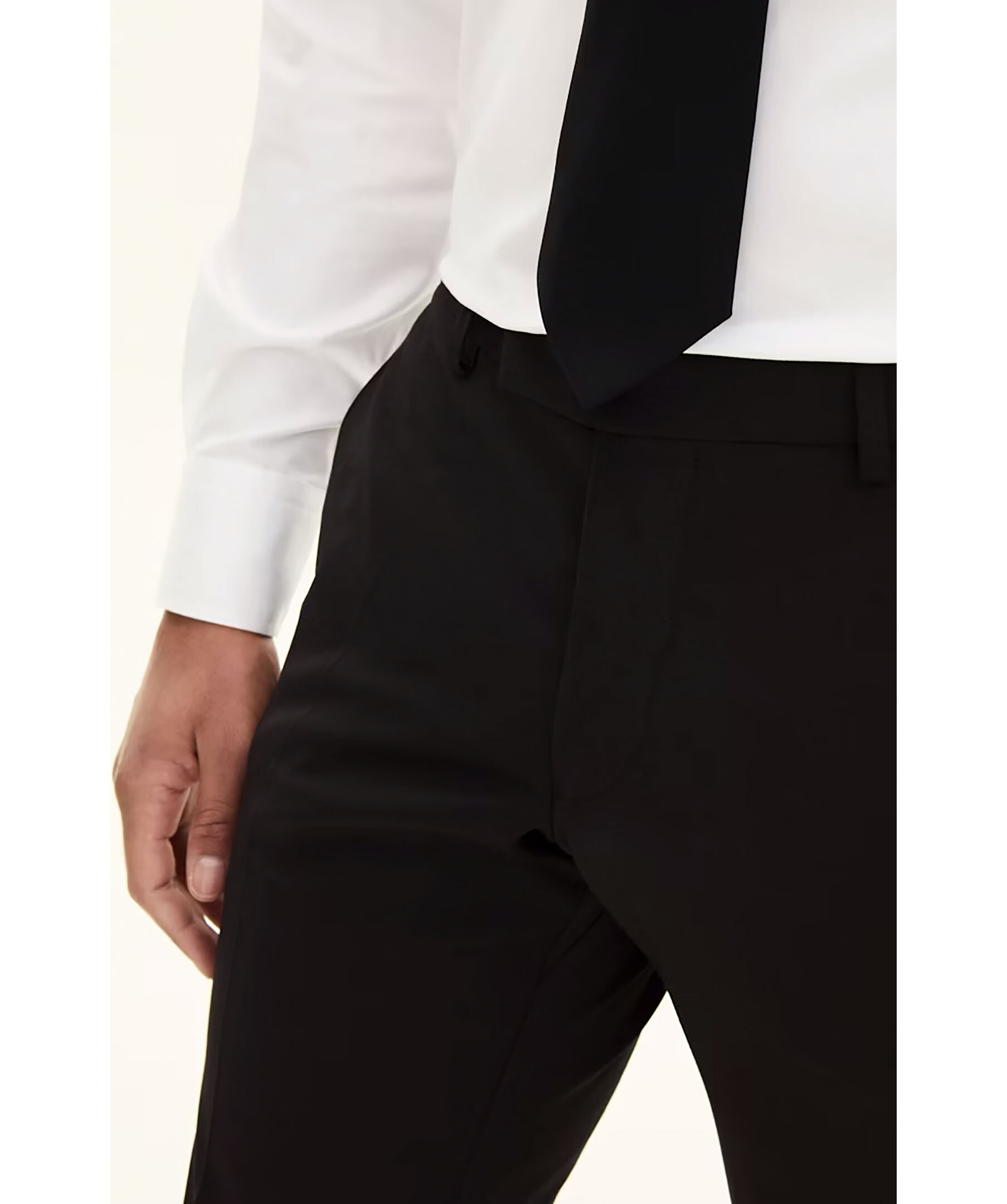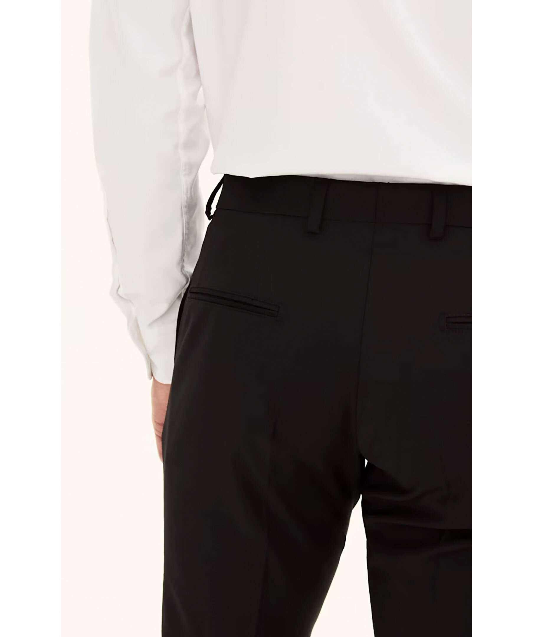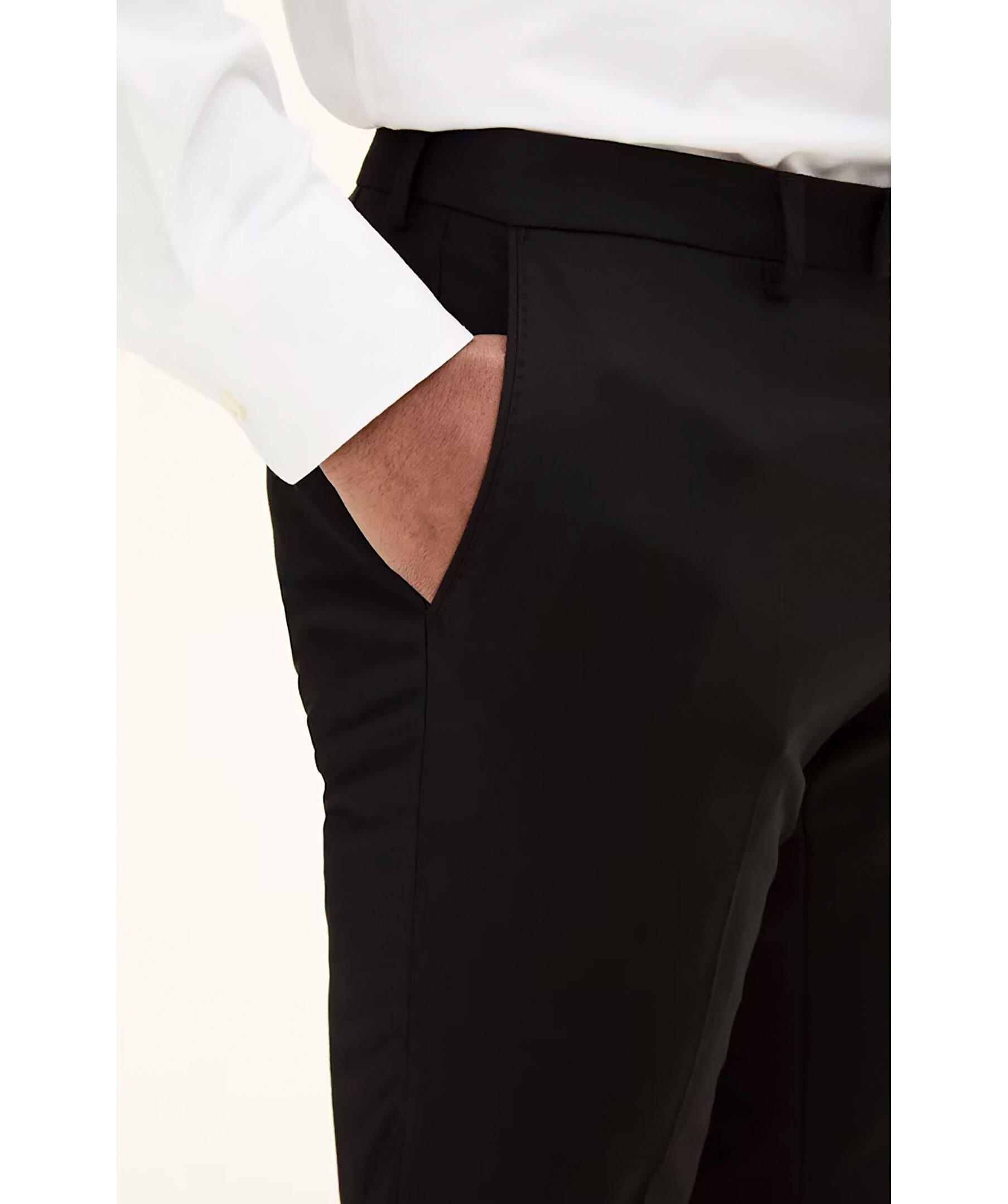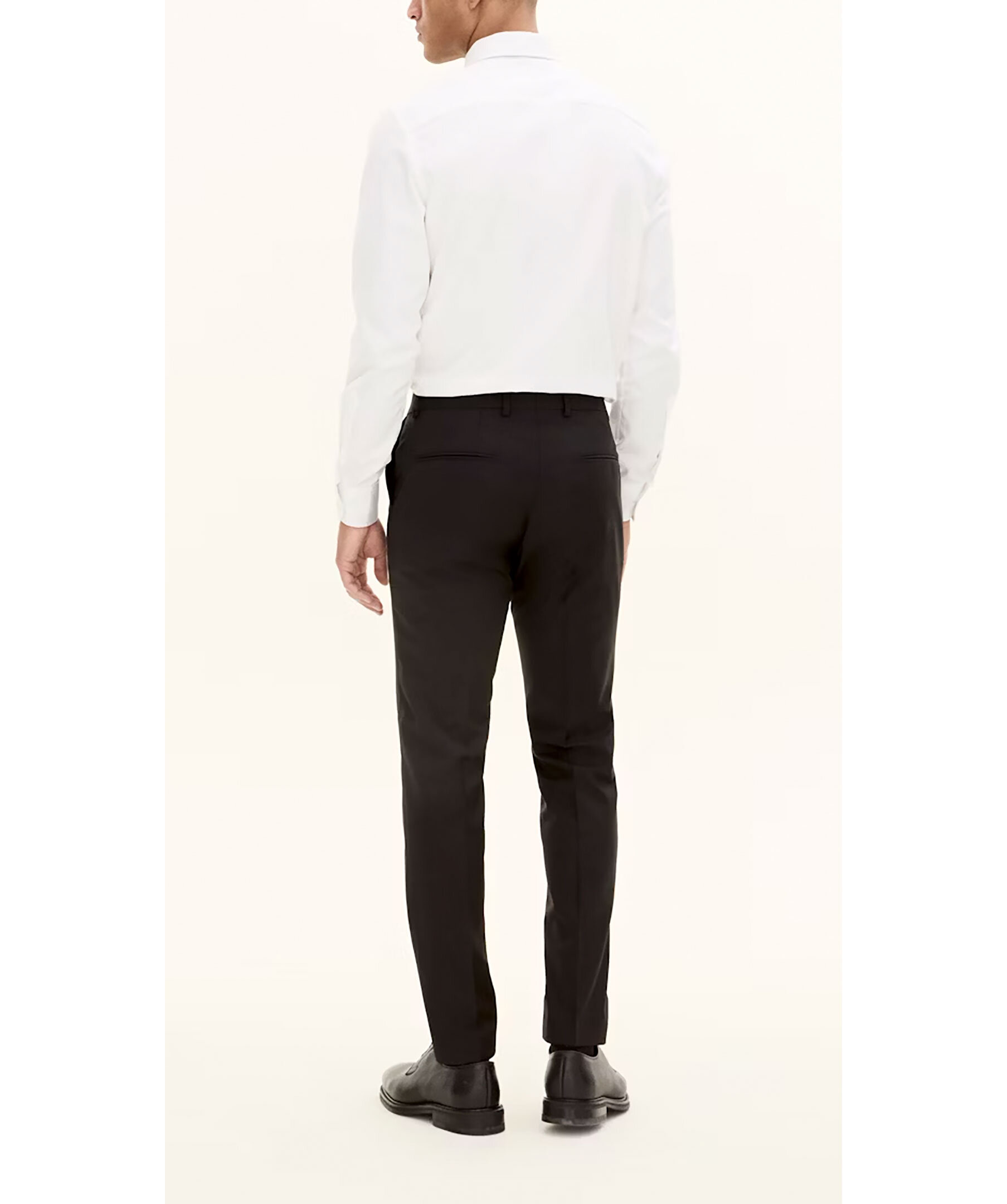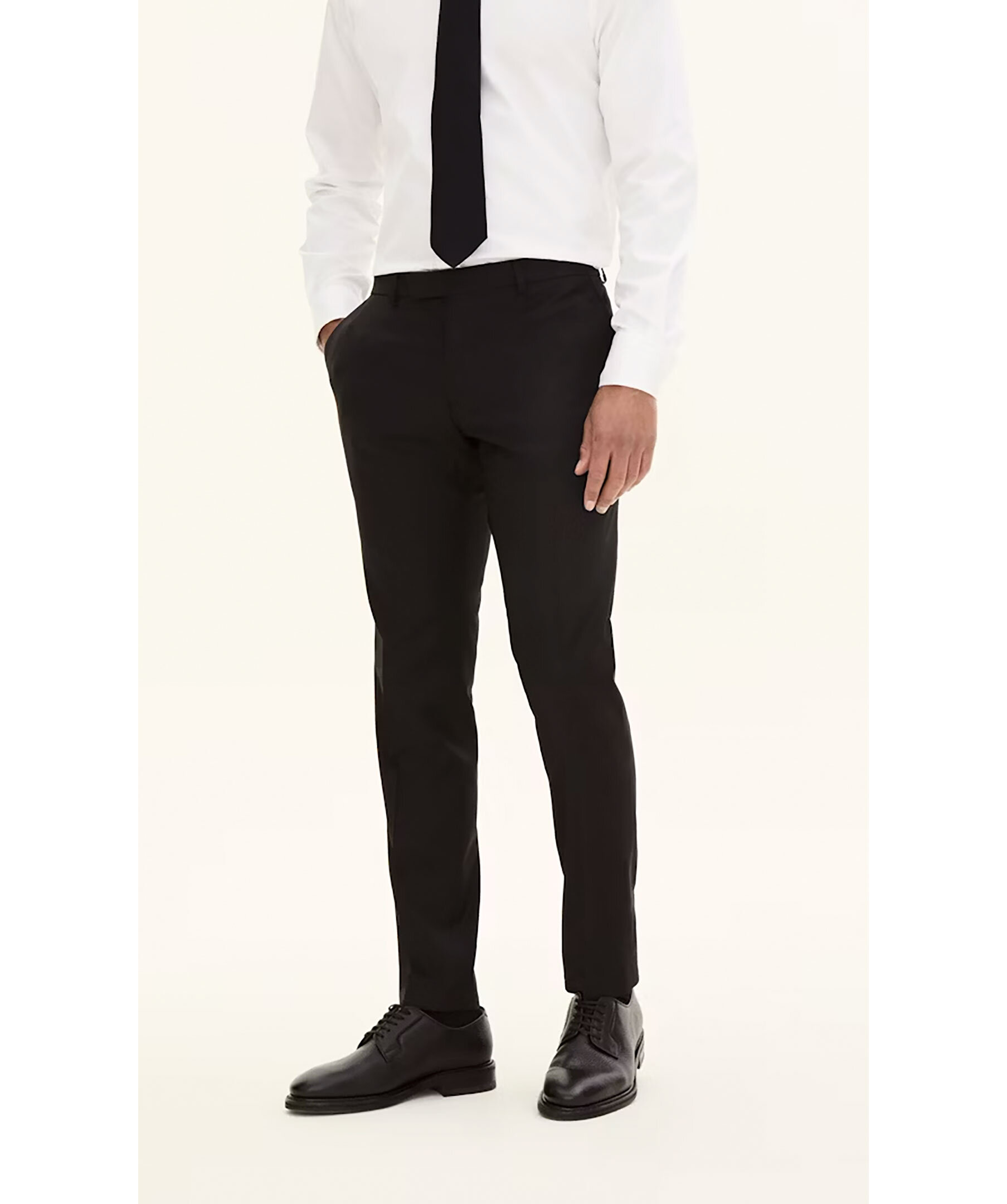 Svarta kostymbyxor från Oscar Jacobson. Hällor för bälte. Gylfen stängs med hakar och dragkedja. Tillverkad i 100% Ull. Slim fit modell.