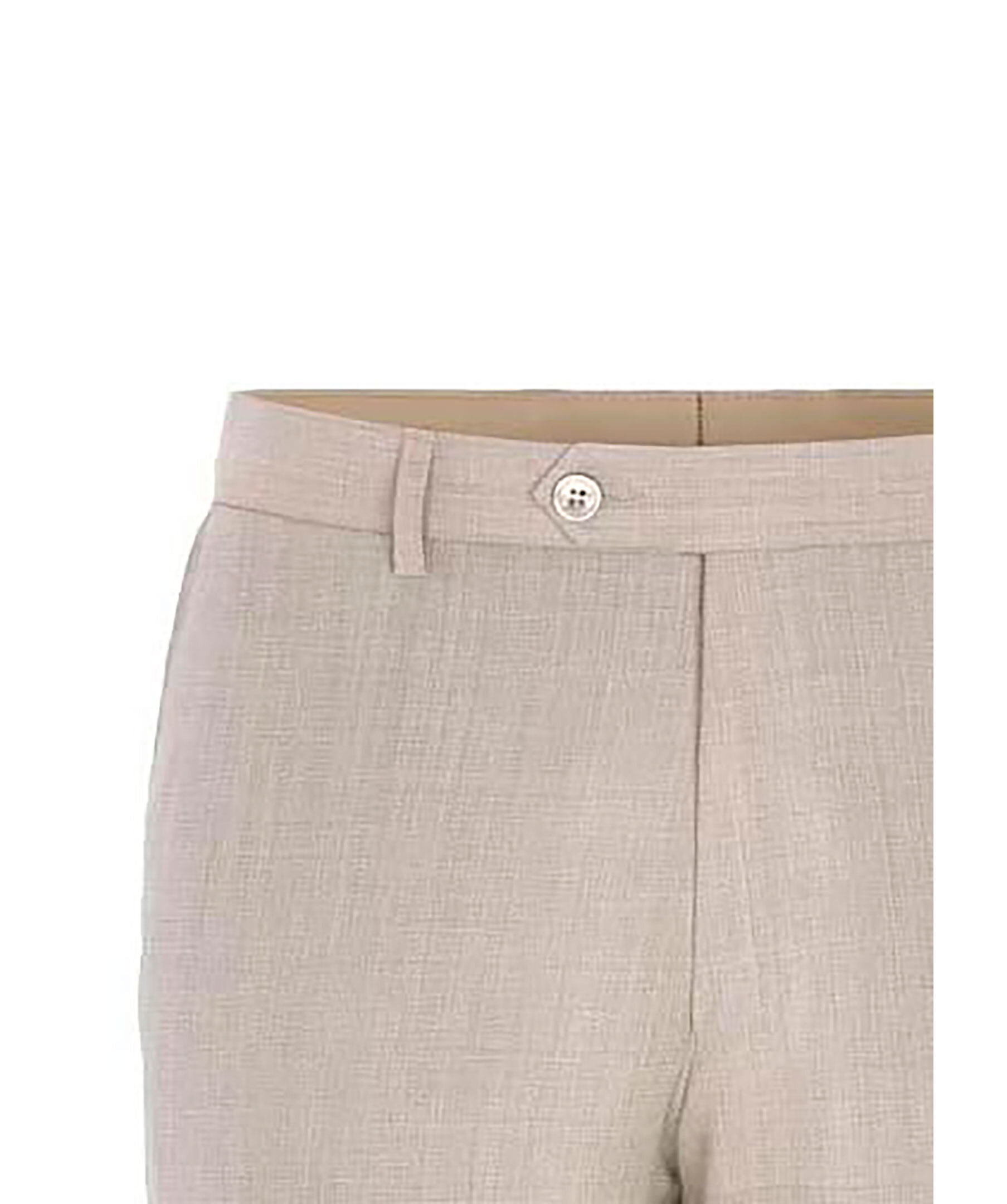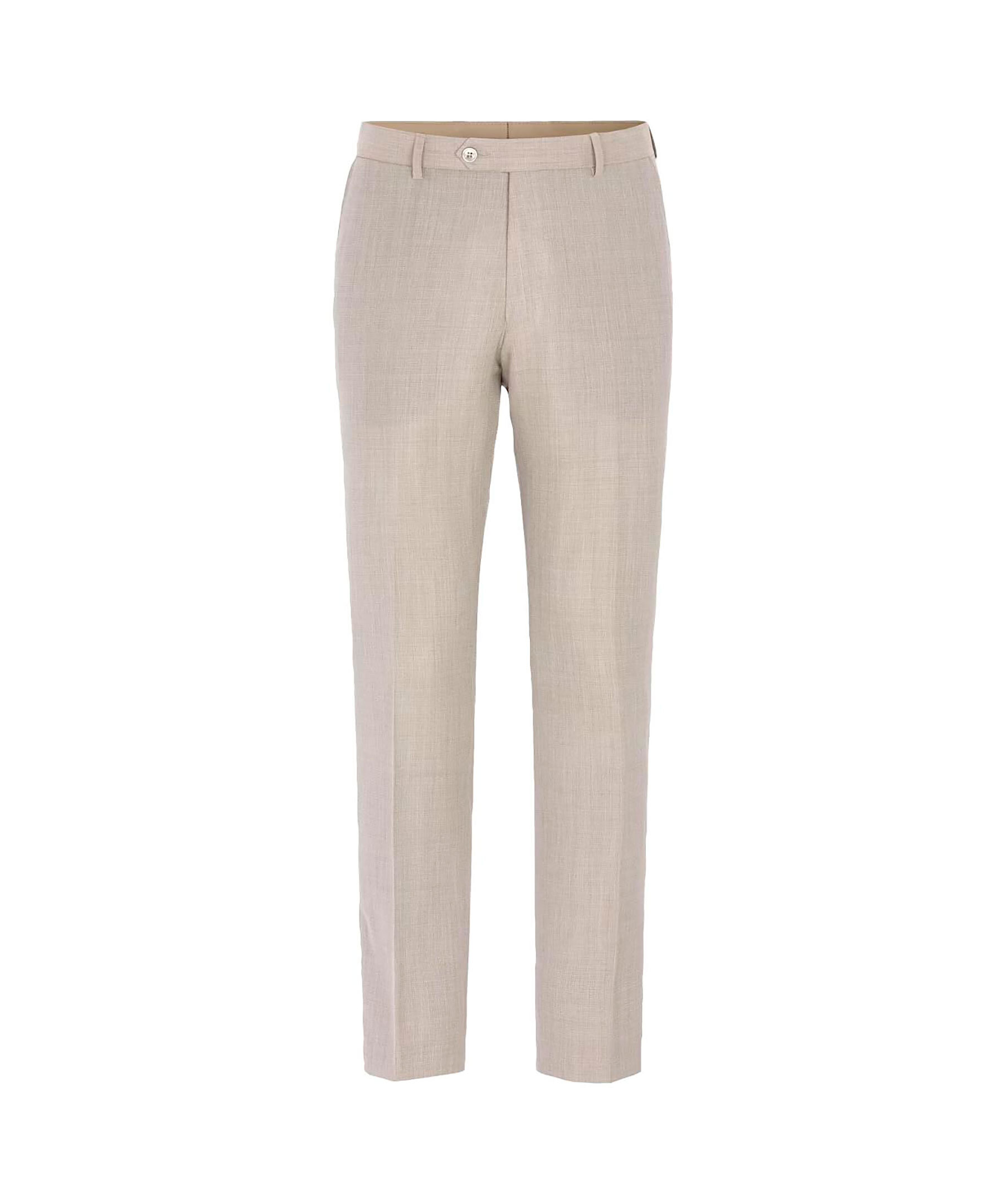 Beiga kostymbyxor från Oscar Jacobson. Byxorna stängs med dragkedja och knapp fram, har bälteshällor, sidofickor och bakfickor med passpoal. Tillverkade av ull.