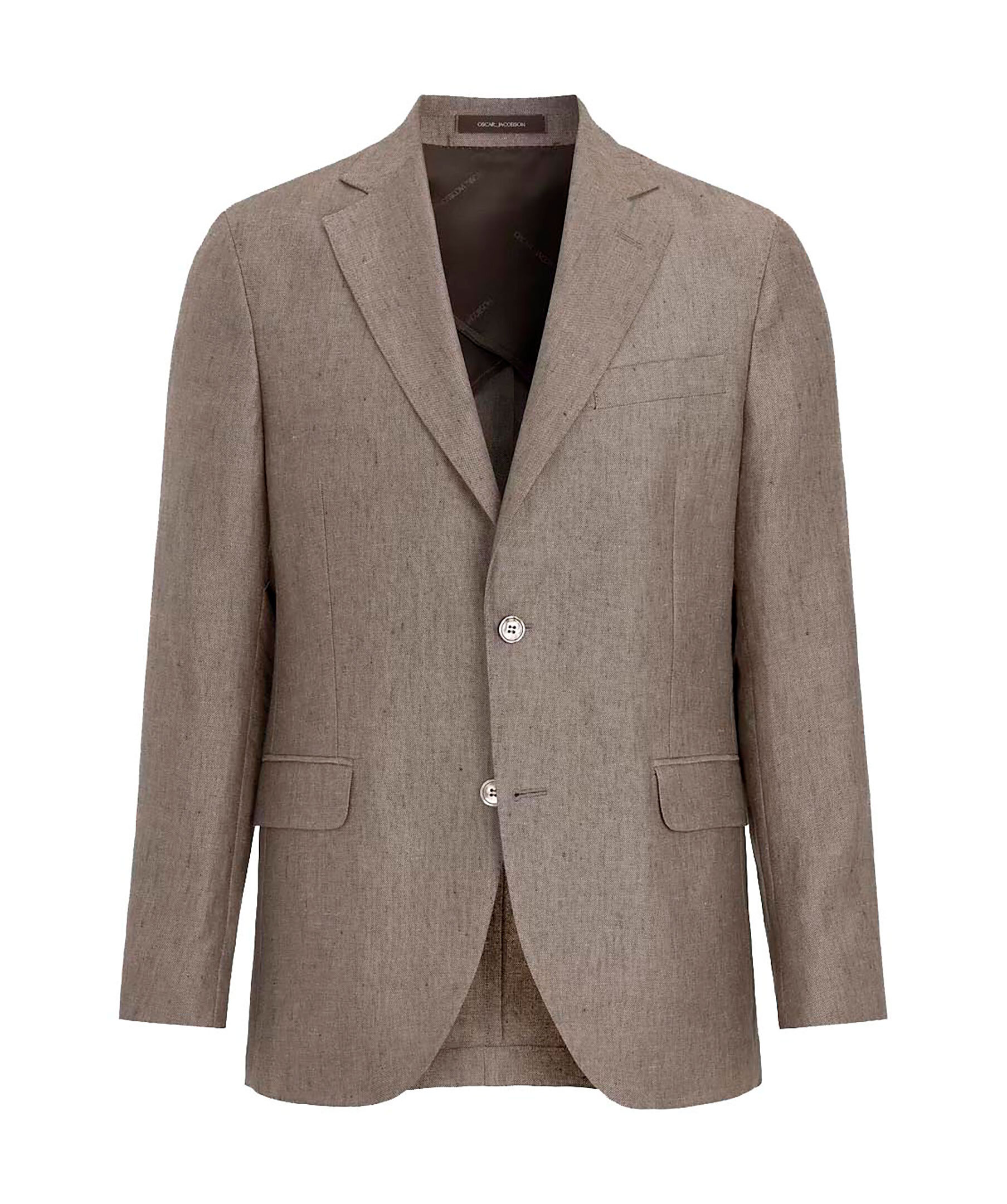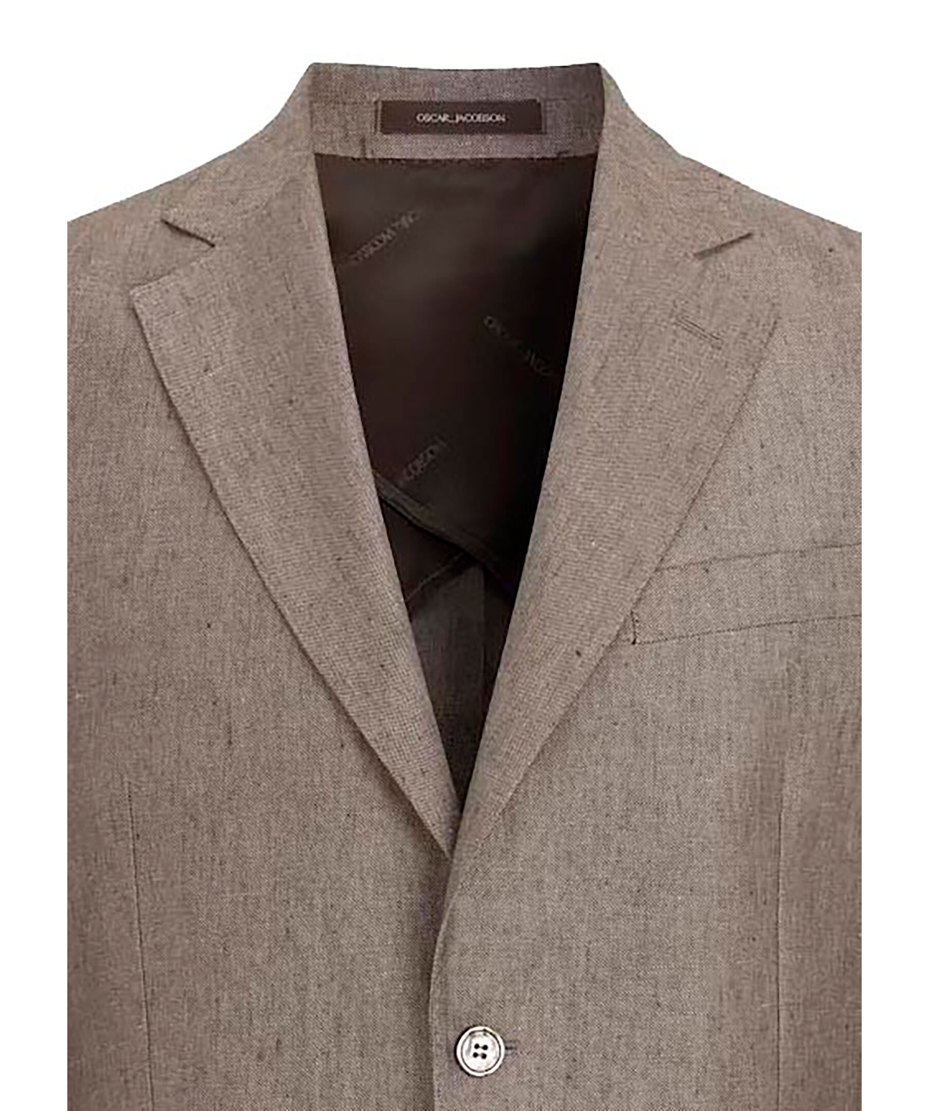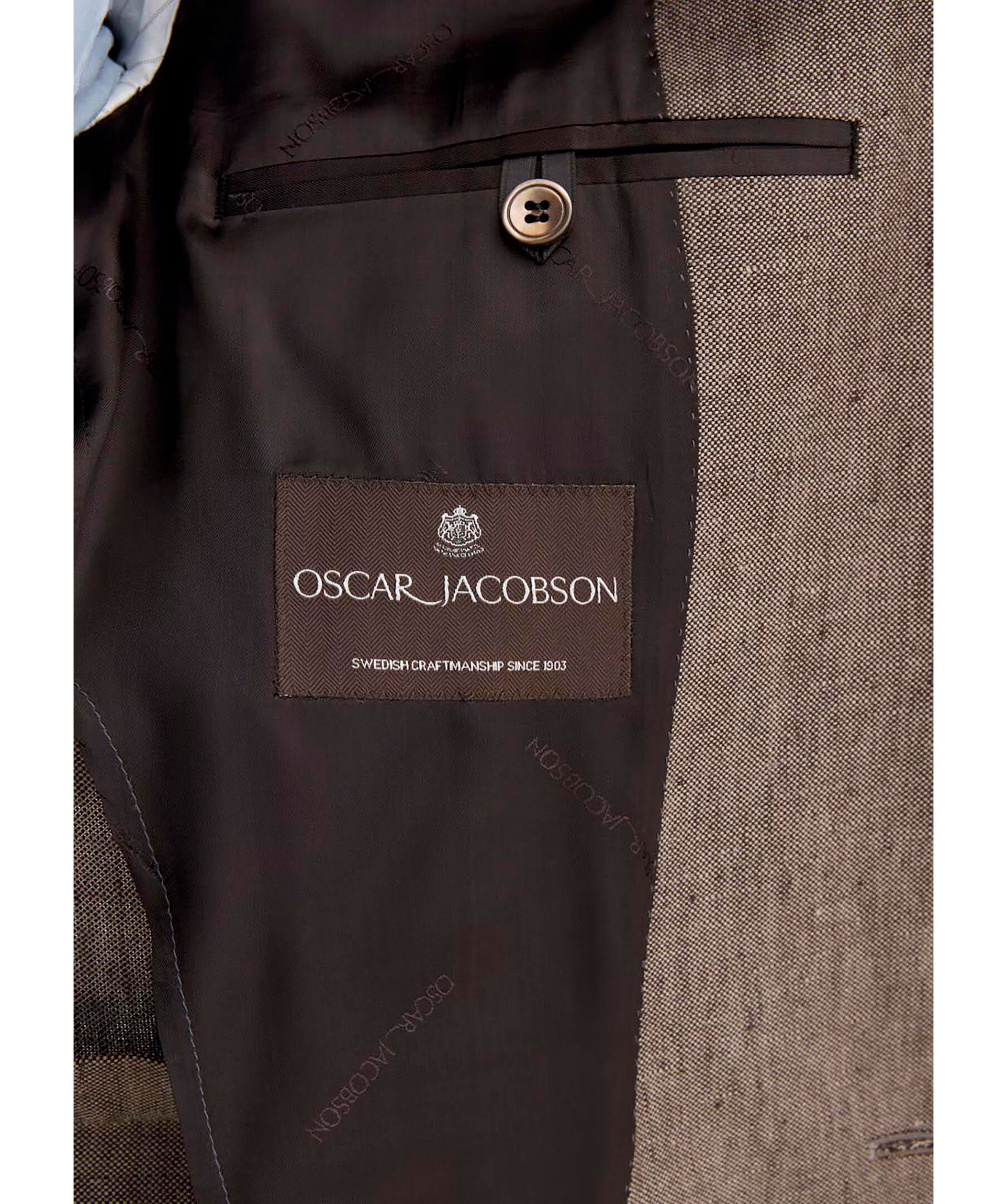 Brun linnekavaj från Oscar Jacobson. Kavajen har enkelknäppning fram, fickor med lock, innerfickor samt en bröstficka. Tillverkad av linne.
