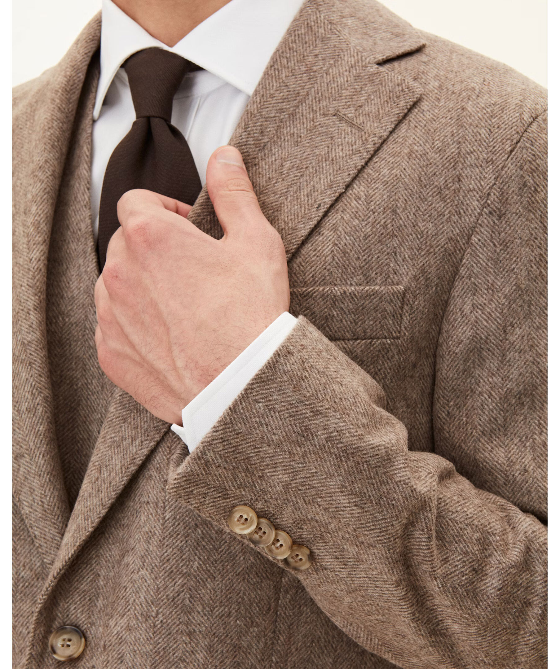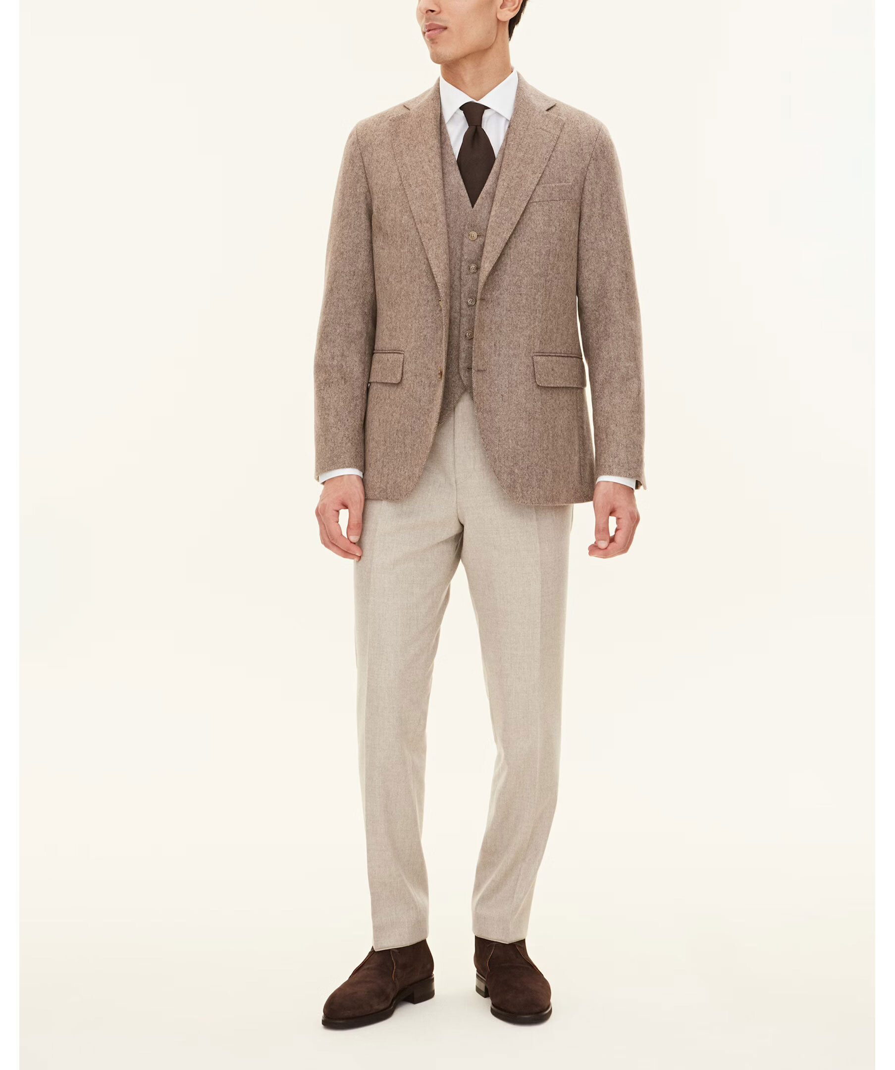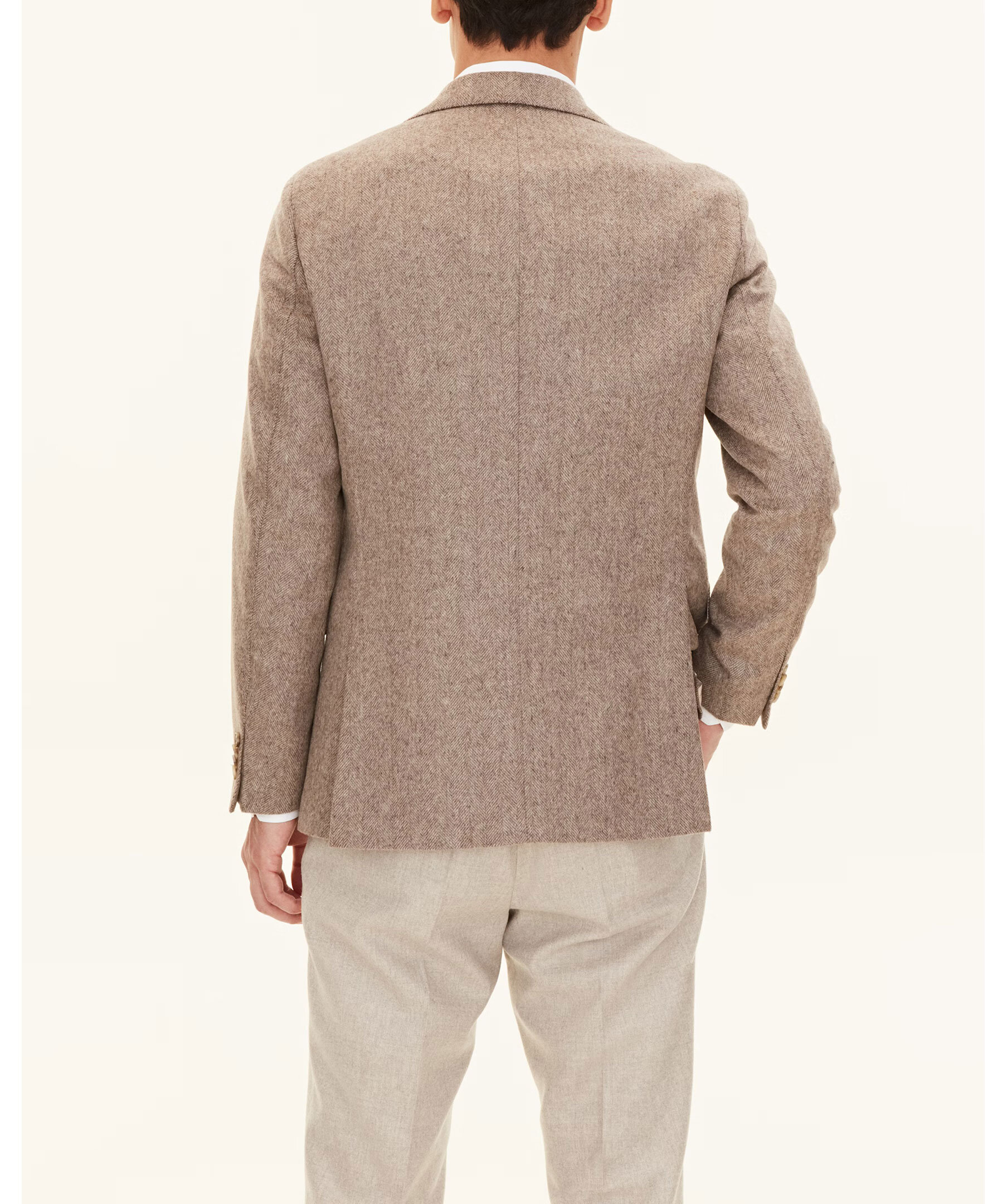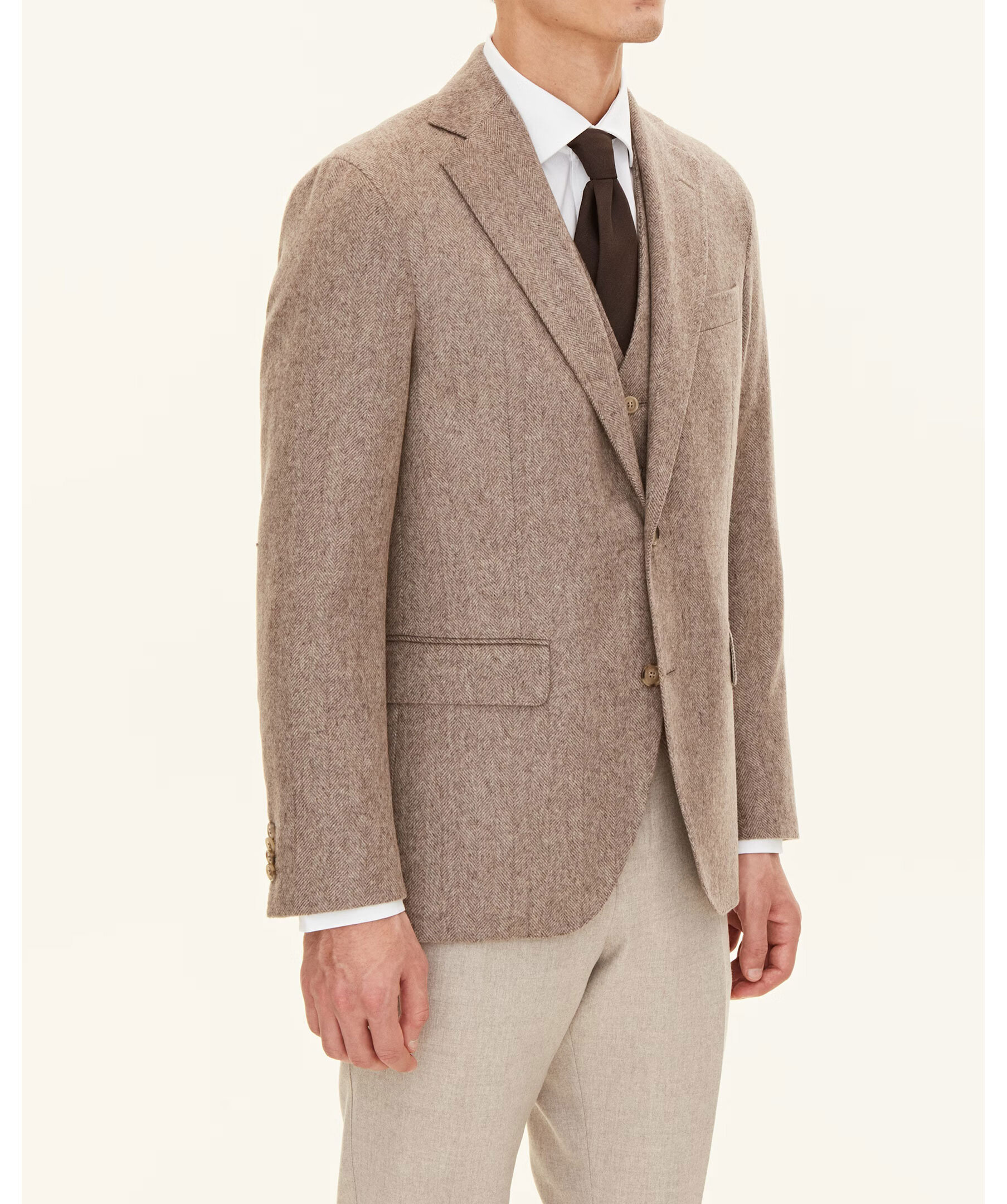 Elegant kavaj från Oscar Jacobson i en lyxig ullblandning med klassiskt fiskbensmönster i beige ton. Den extra mjukt konstruerade axeln och fodrade insidan ger en sofistikerad men avslappnad silhuett.