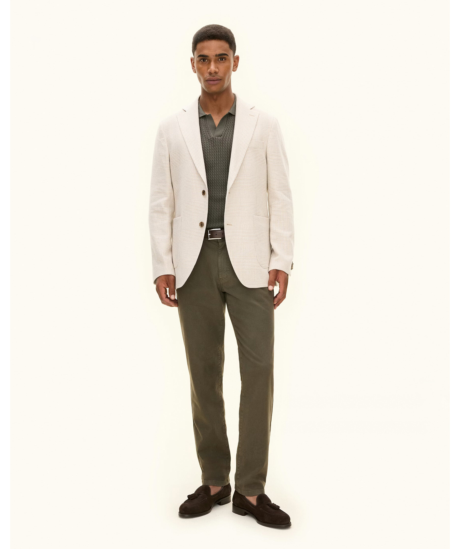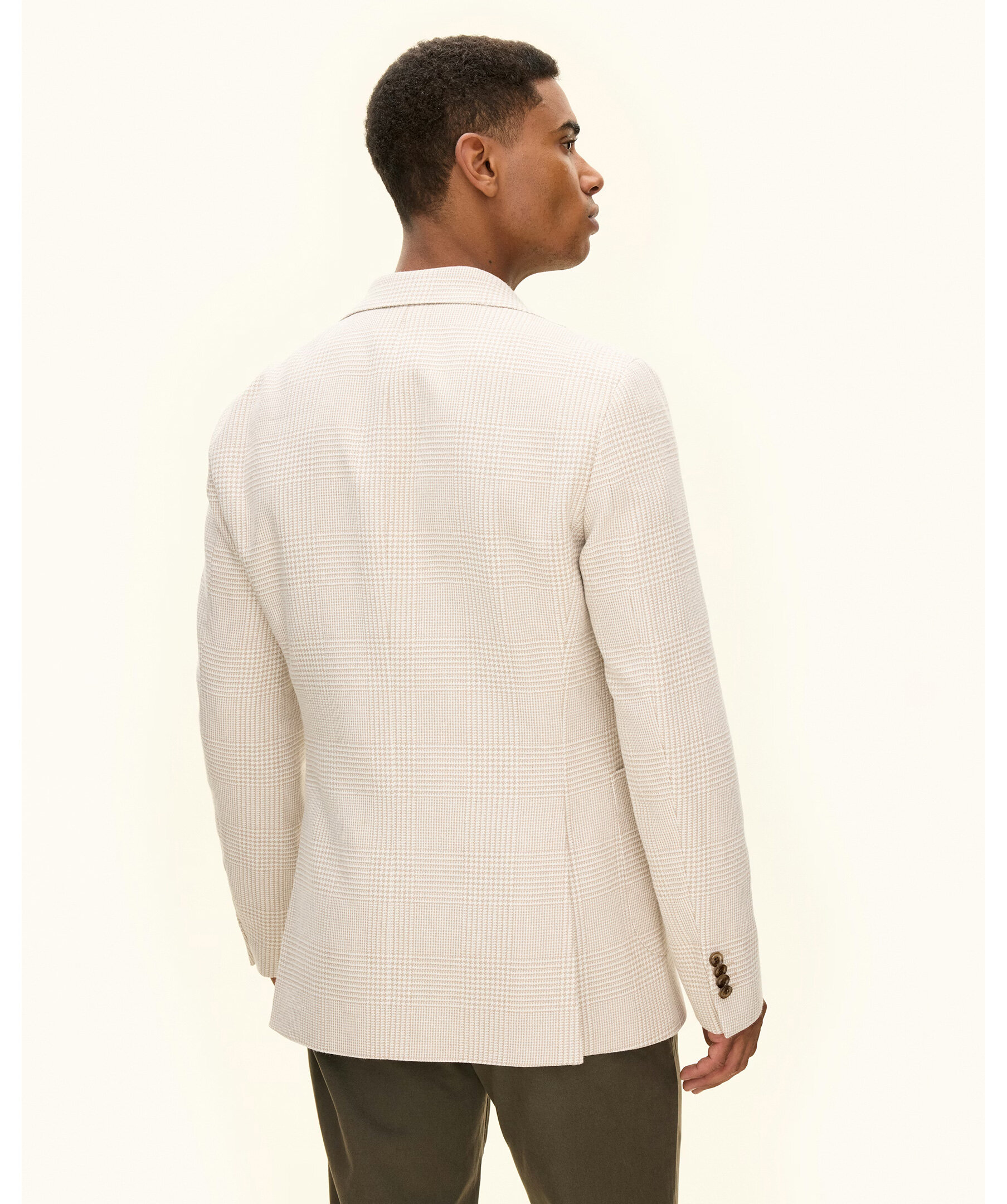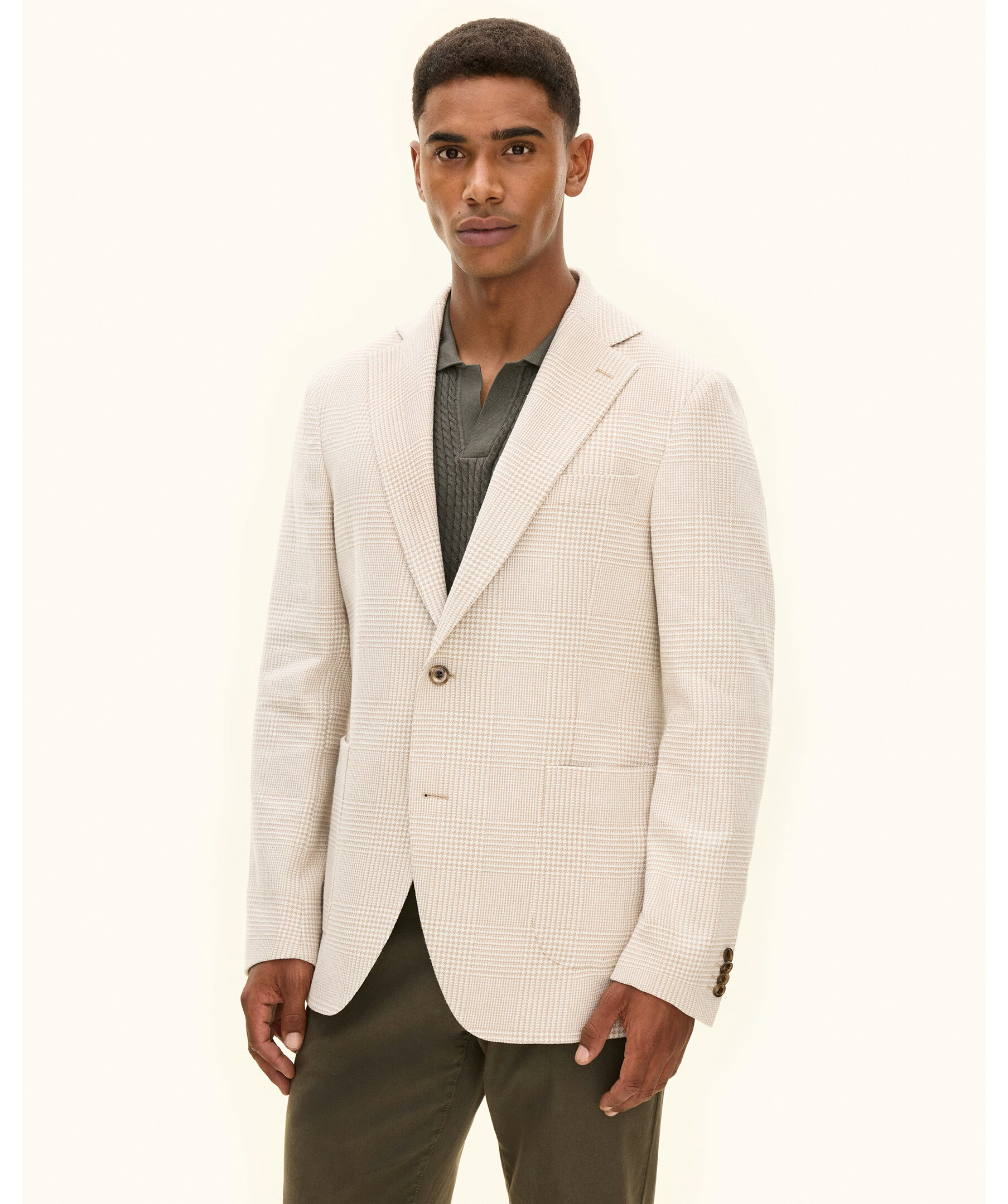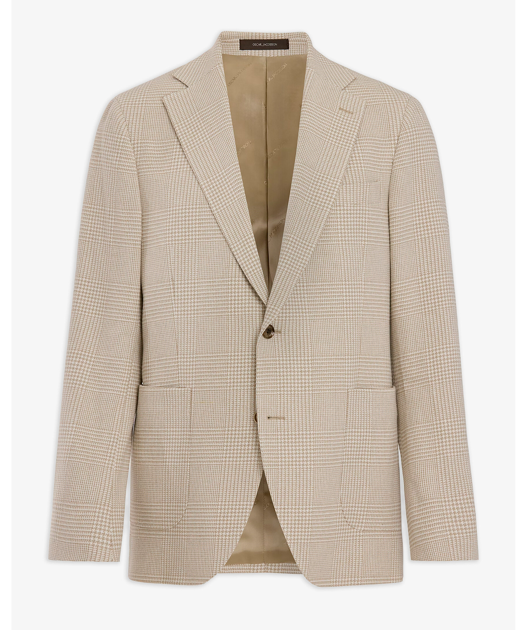 Beige regular fit rutig kavaj från Oscar Jacobson. Kavajen har ett klassiskt rutigt mönster, enkelknäppt design och mjukt konstruerade axlar för en elegant och lättskött stil. Den är fodrad och har ficklock som ger en sofistikerad finish – perfekt för både kontoret och sociala tillfällen.