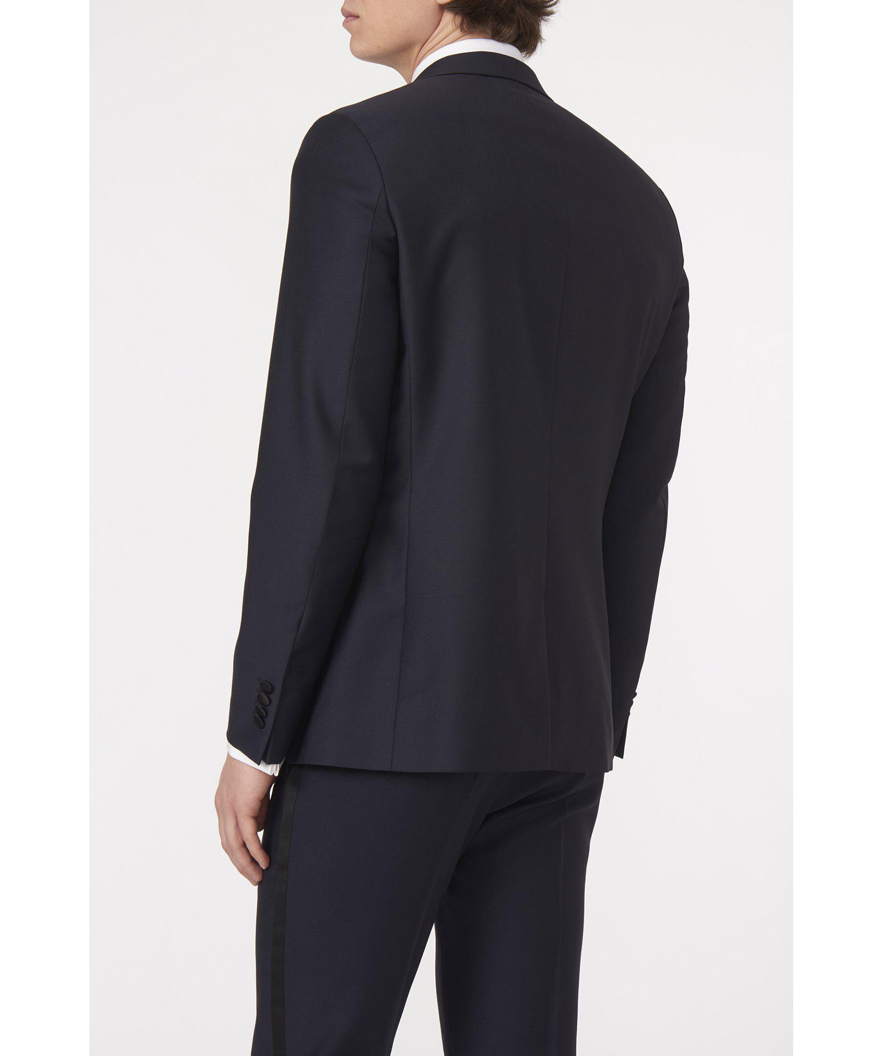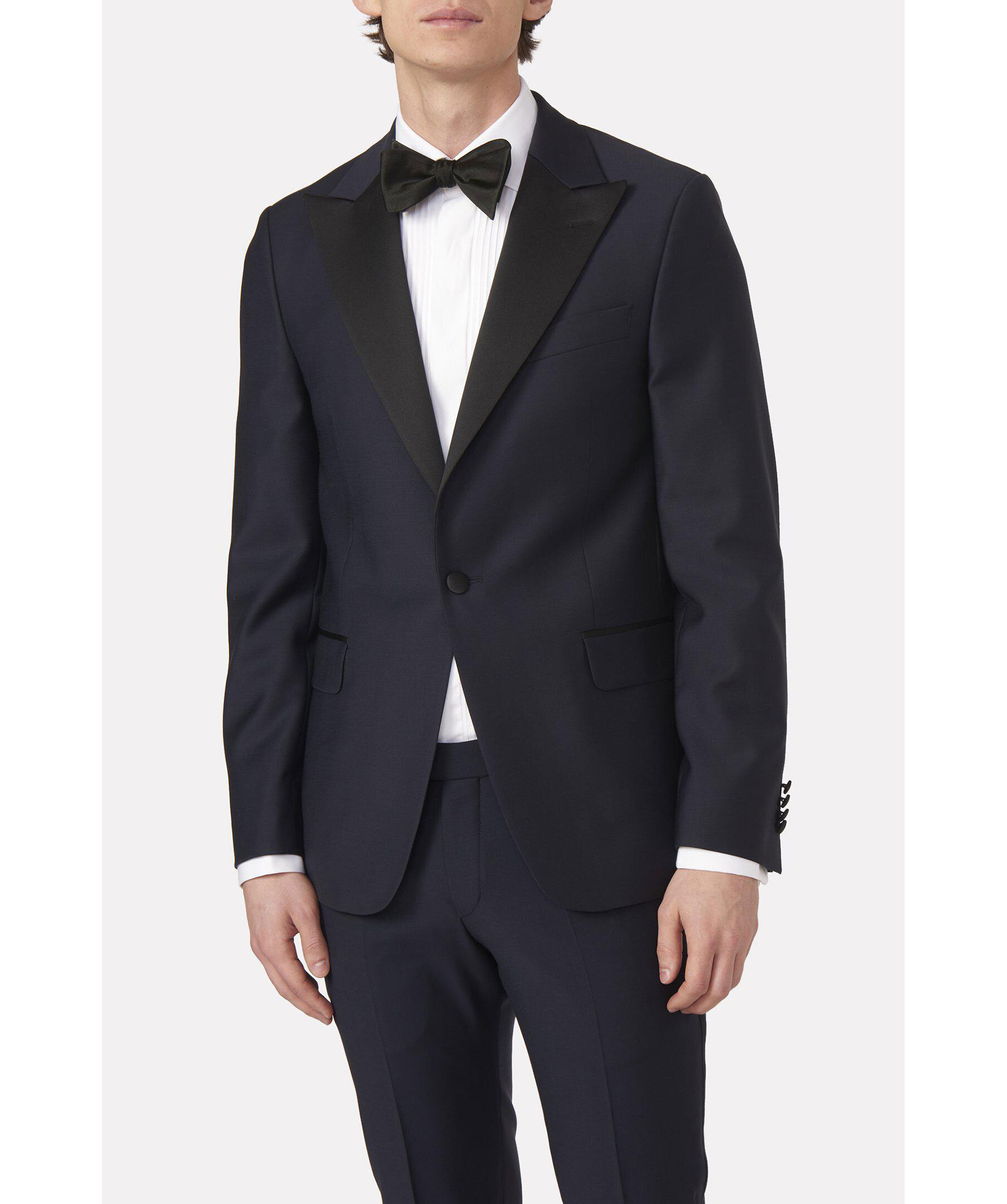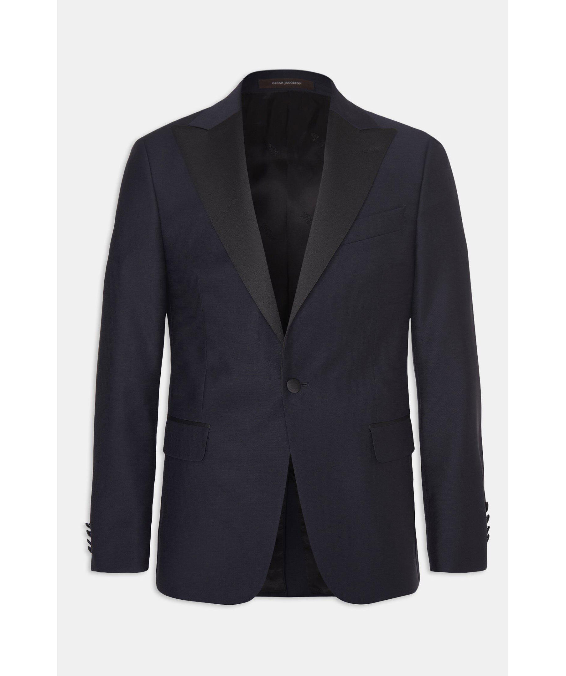 Klassisk smoking med spetsiga sidenslag. Normal passform - figursydd med lite mer utrymme. Klassisk konstruktion med väldefinierade linjer. Helfodrad insida i viskos för komfort och känsla. Sidenpasspoalerade fickor - ett självklart val för extra festliga tillfällen. Längd från nacke till kavajslut i storlek 50: 75 cm. Kan matchas med följande byxor: - Duke smokingbyxor - Devon smokingbyxor