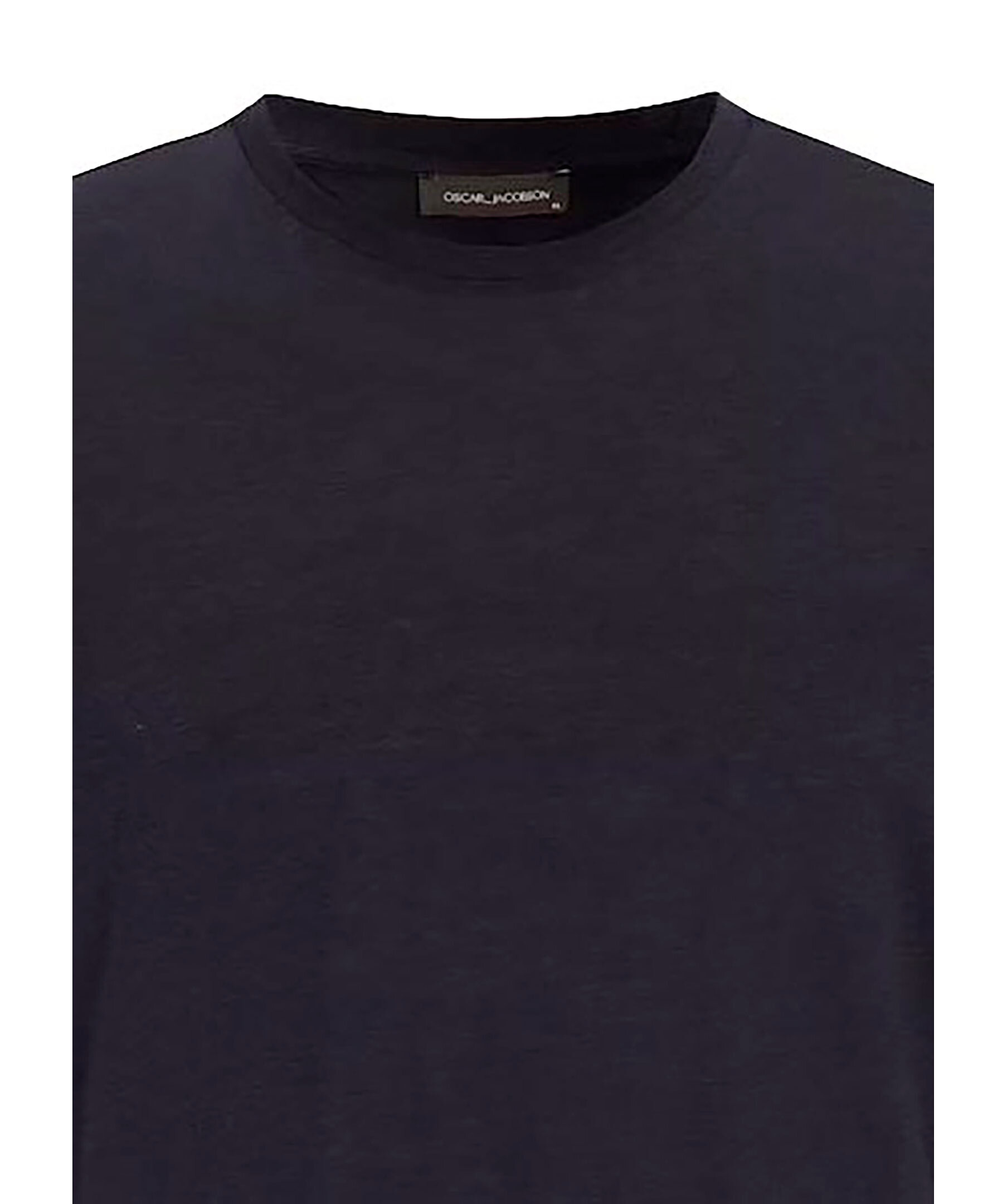 Marinblå t-shirt från Oscar Jacobson. T-shirten har rundad halsringning och korta ärmar och en lätt glans. Är tillverkad av bomull-tencel.