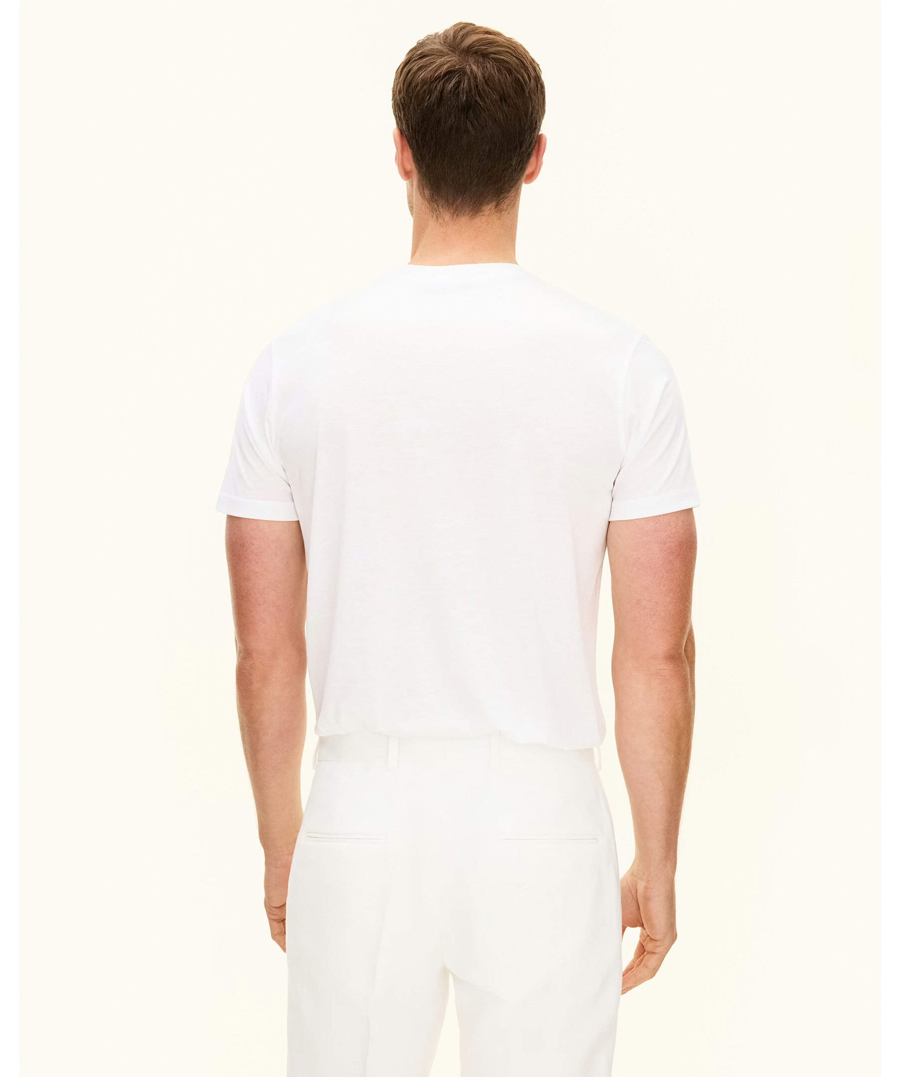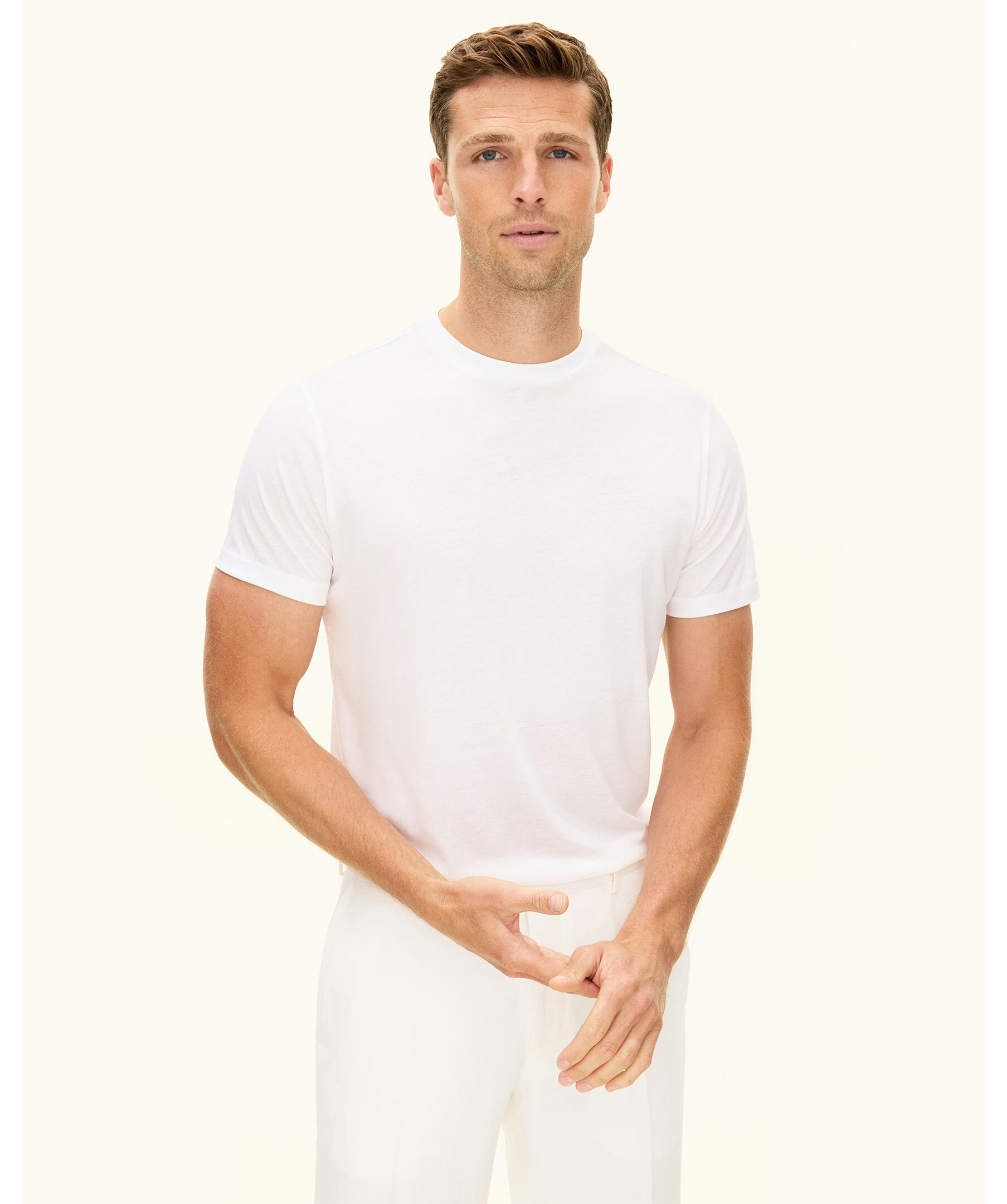 Vit T‑shirt i Tencel‑bomull från Oscar Jacobson. T‑shirten är mjuk och bekväm med rund halsringning och har en subtil lätt glans i tyget som ger en stilren och modern bas – perfekt för både avslappnade vardagsoutfits och lager‑på‑lager‑stil under kavaj. Tyget kombinerar lyocell och bomull för skön komfort och elegant känsla.