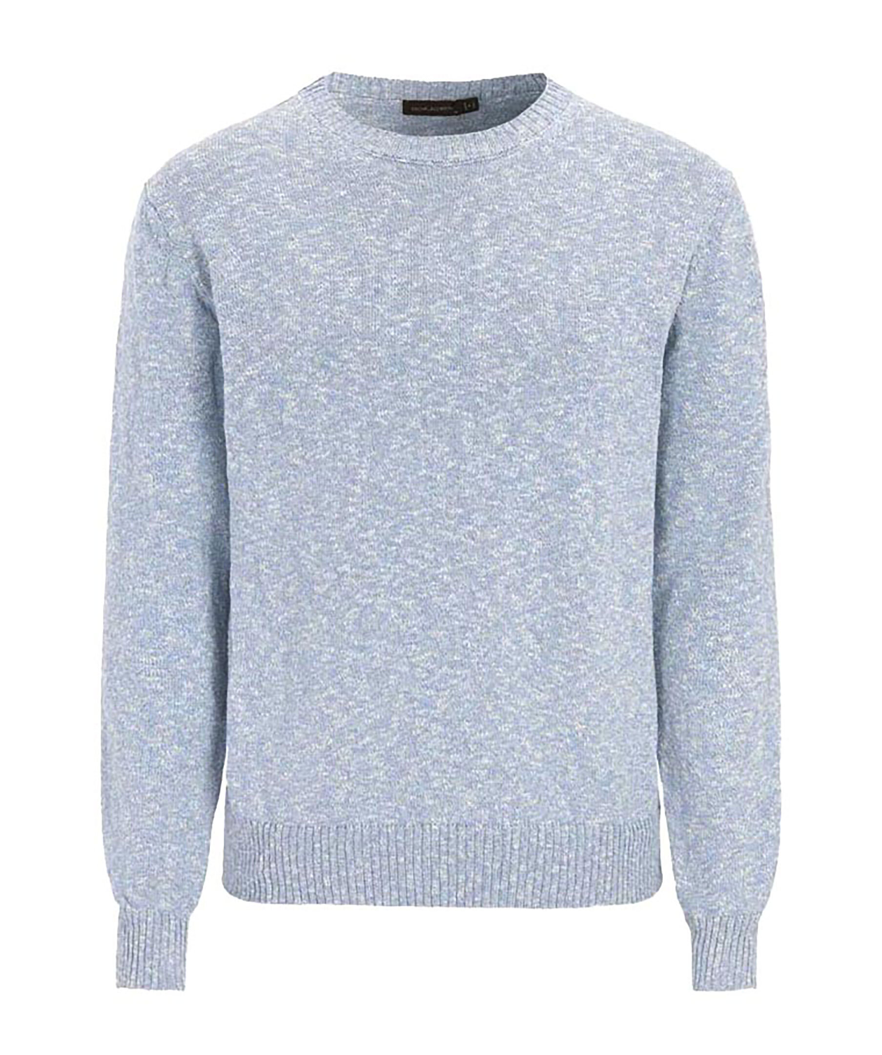 Ljusblå stickad pullover från Oscar Jacobson. Pullovern har en rundad halsringning och mudd vid ärm- och tröjslut. Tillverkad av en bomullsblandning.