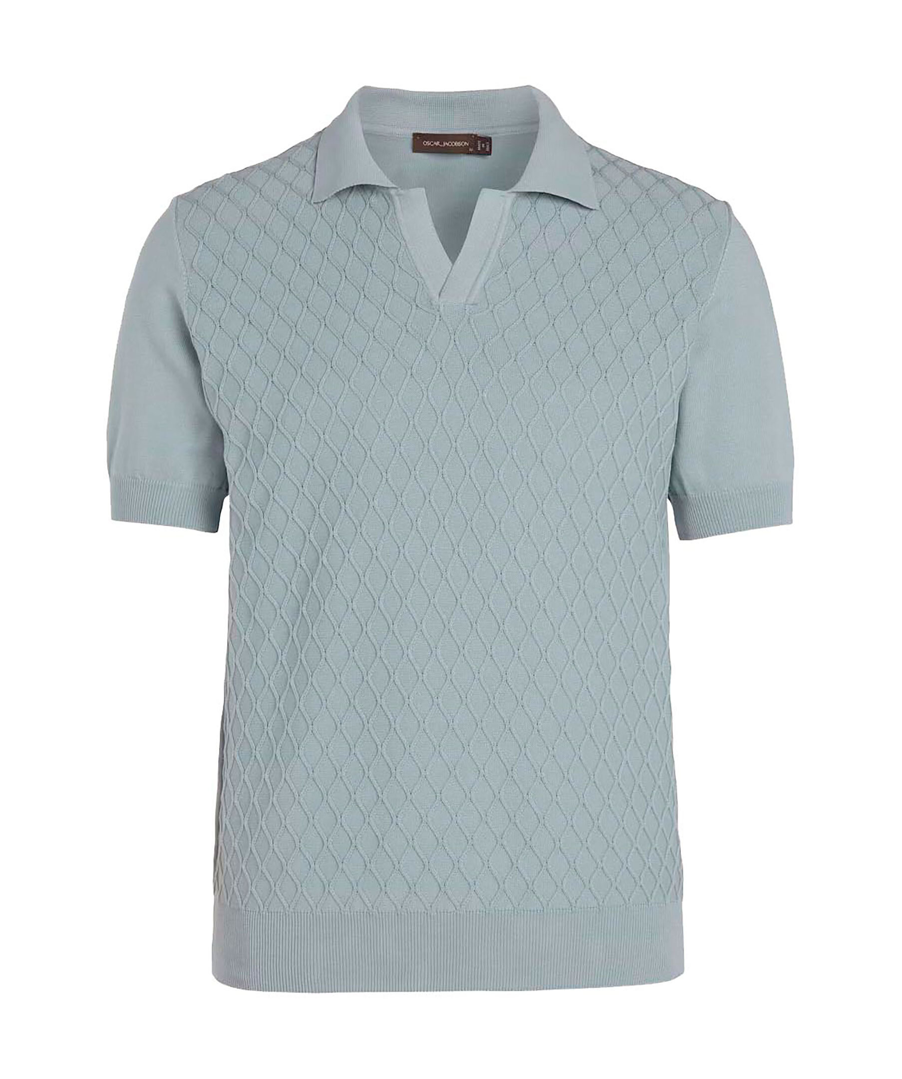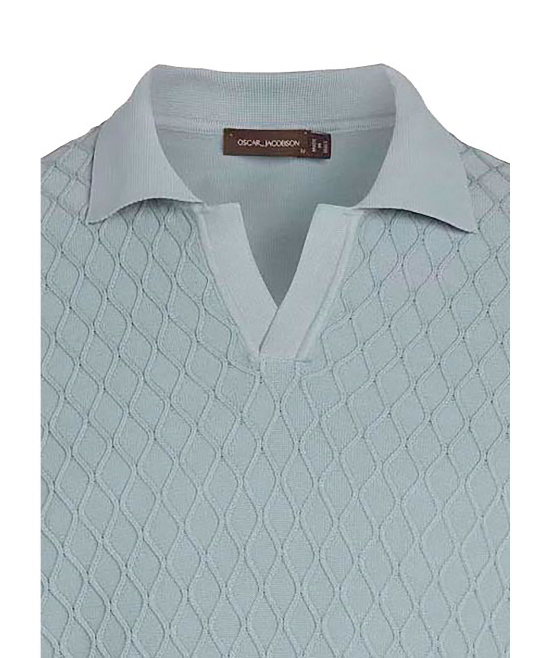 Duvblå piké från Oscar Jacobson. Pikén är kabelstickad med ett vackert mönster och har en standard krage och korta ärmar. Tillverkad av bomull.