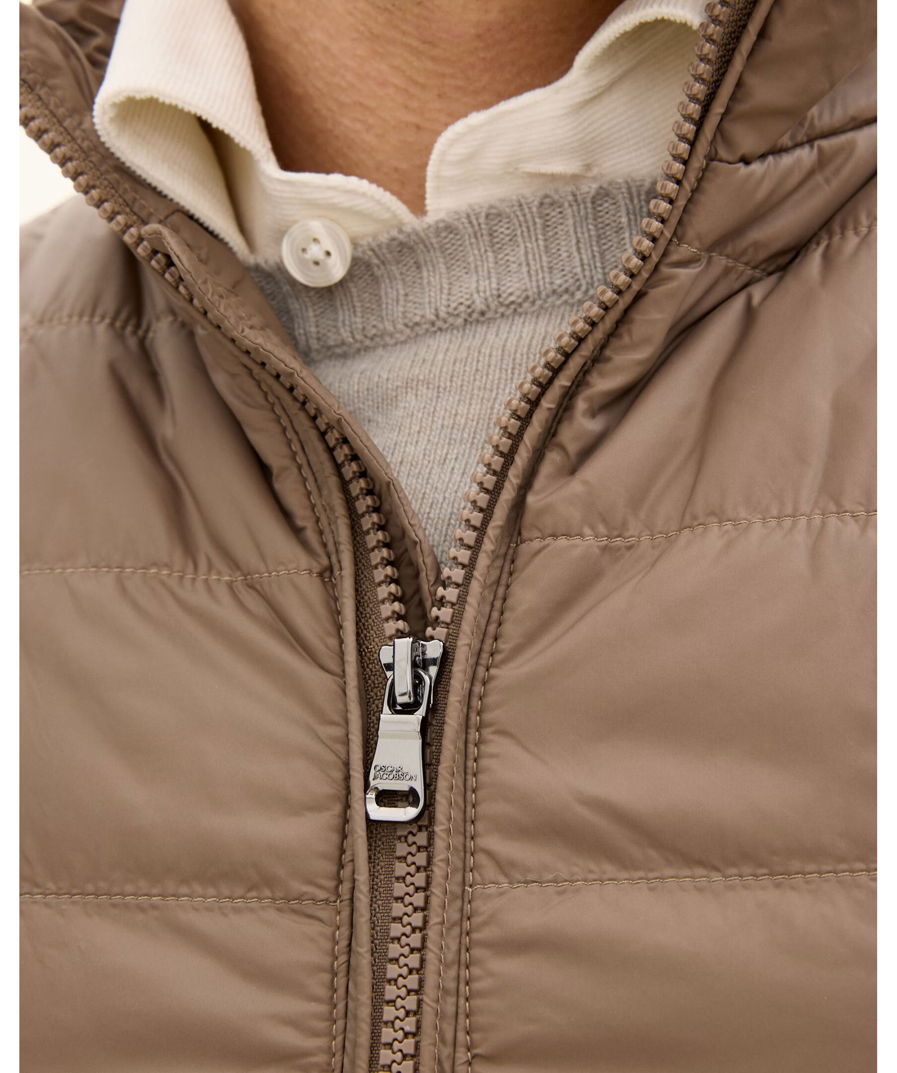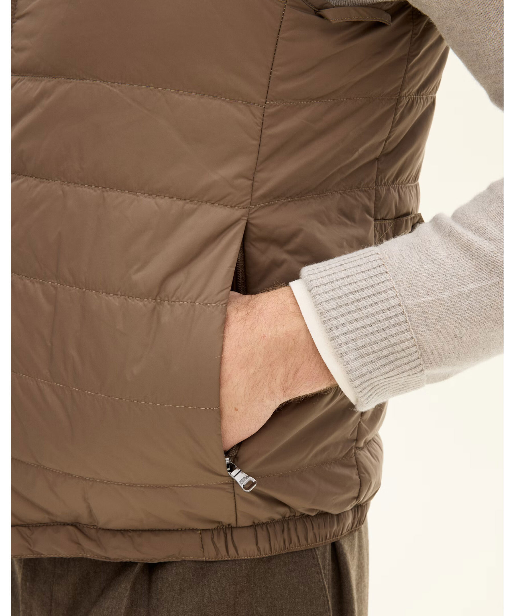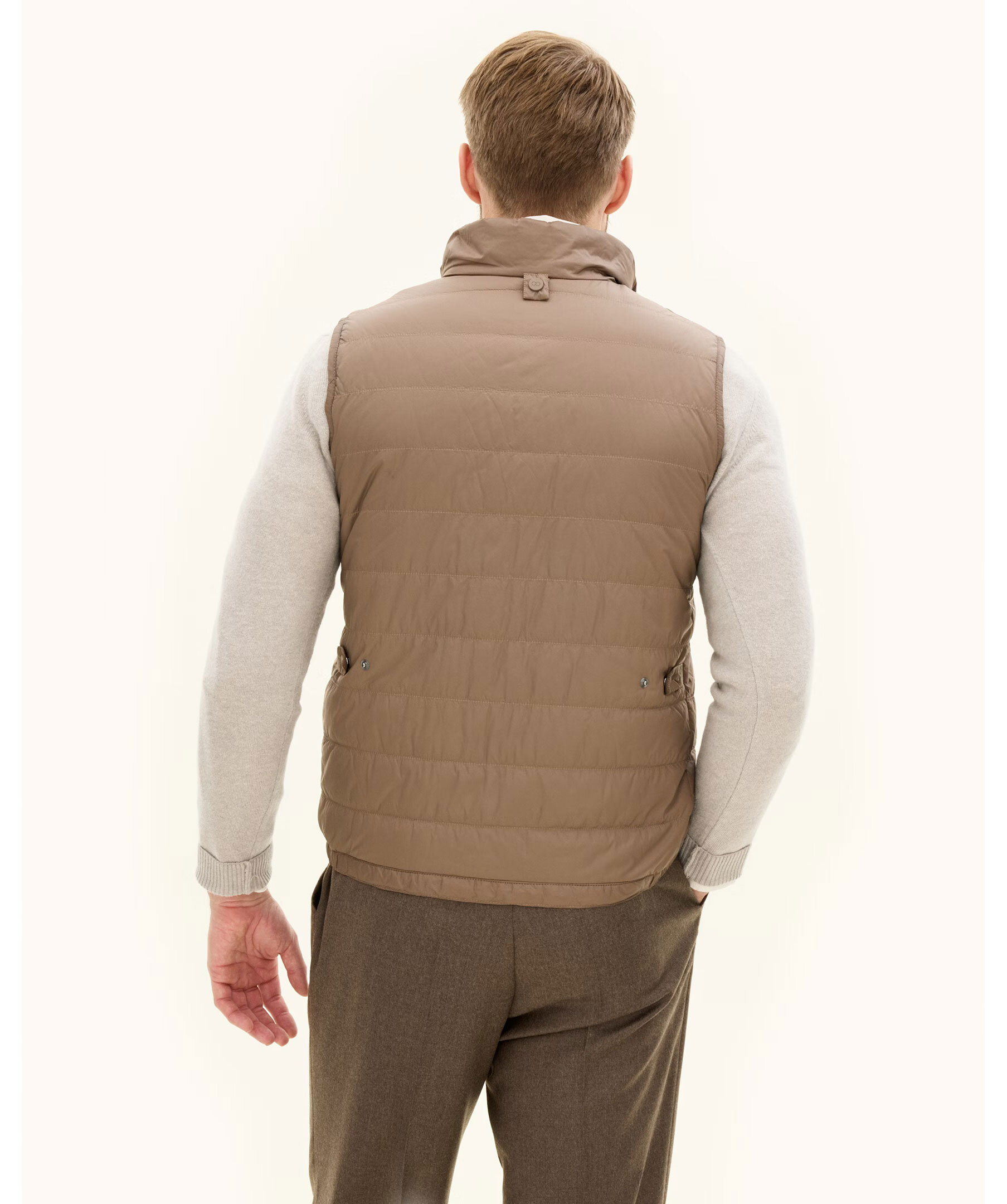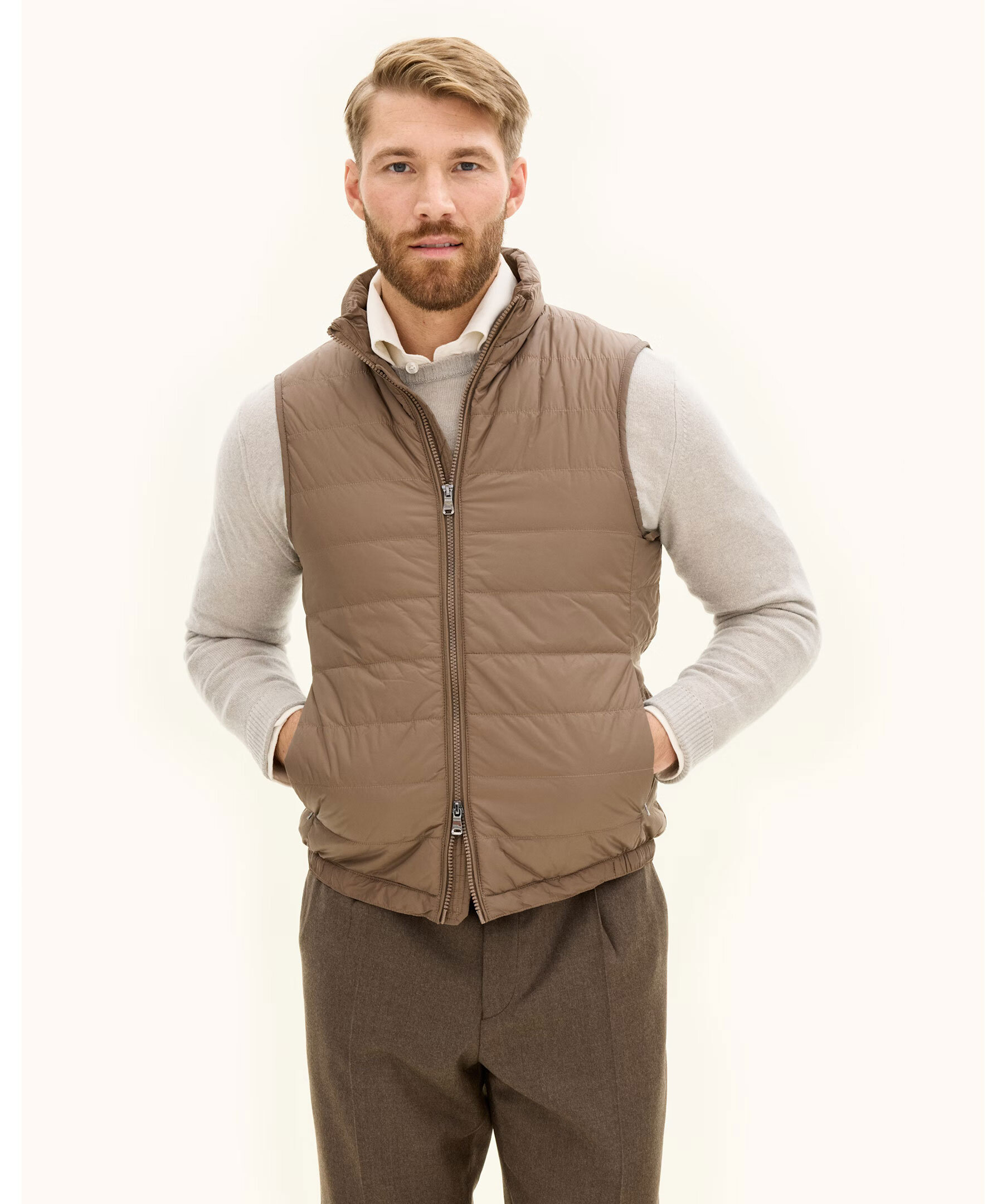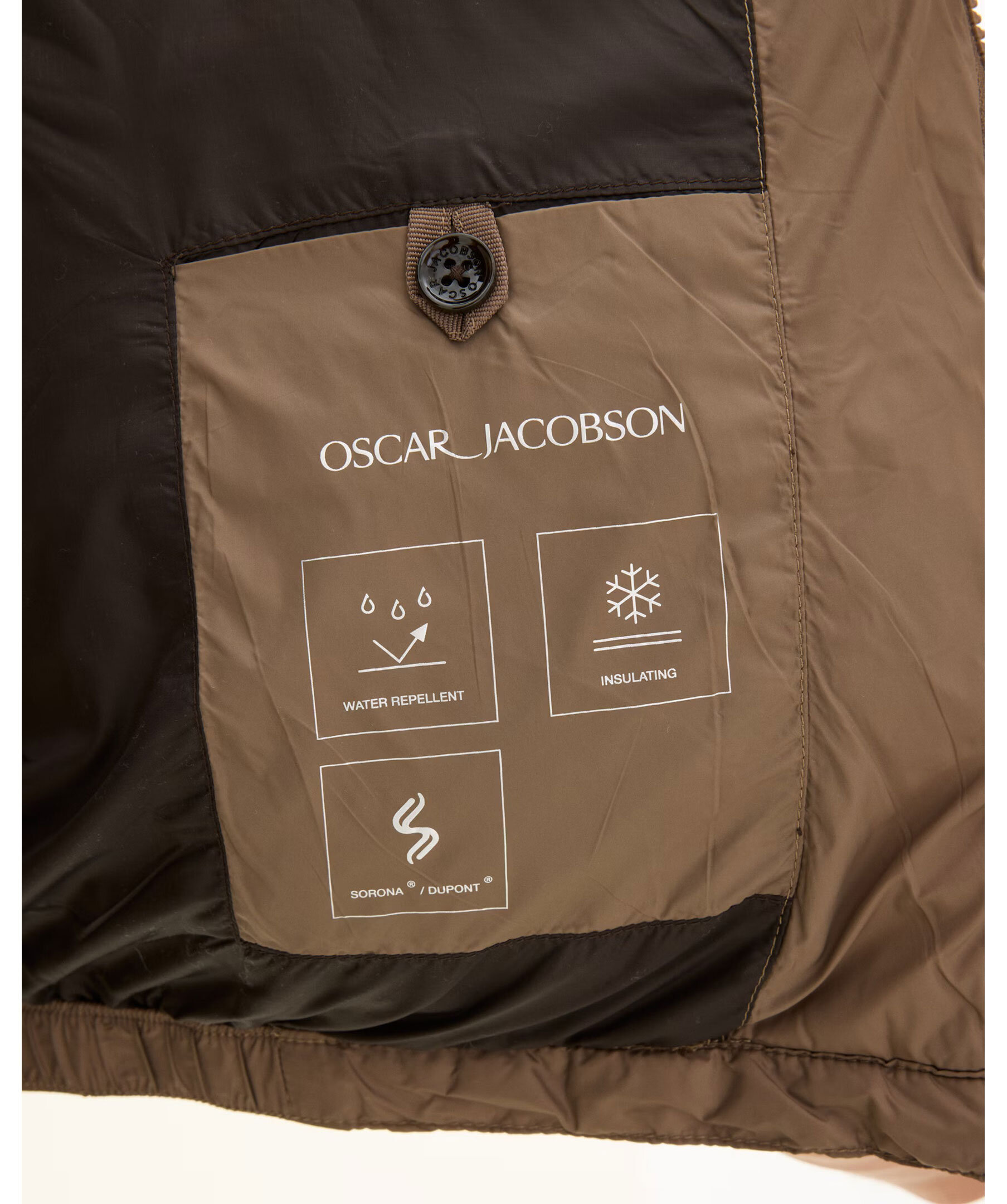 Lätt vadderad väst från Oscar Jacobson i vattenavvisande nylon, designad för maximal mångsidighet och komfort. Med växtbaserad Sorona-vaddering, slitstarkt ripstop-foder och smarta detaljer som fleecefodrade fickor erbjuder den ett stilrent och funktionellt skydd under kyliga dagar.