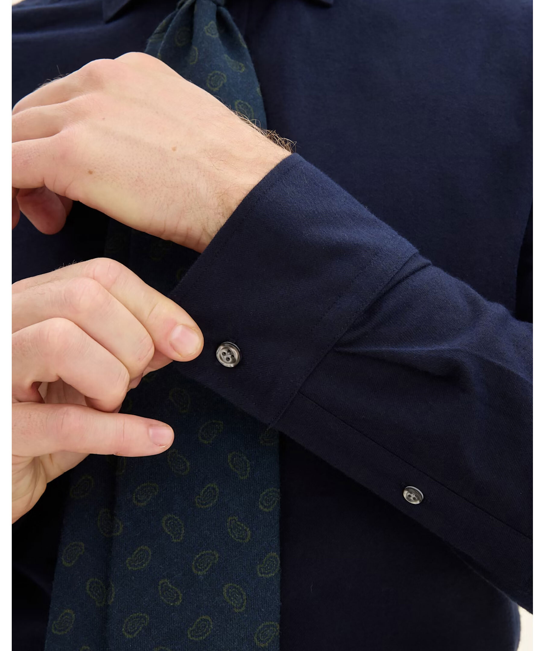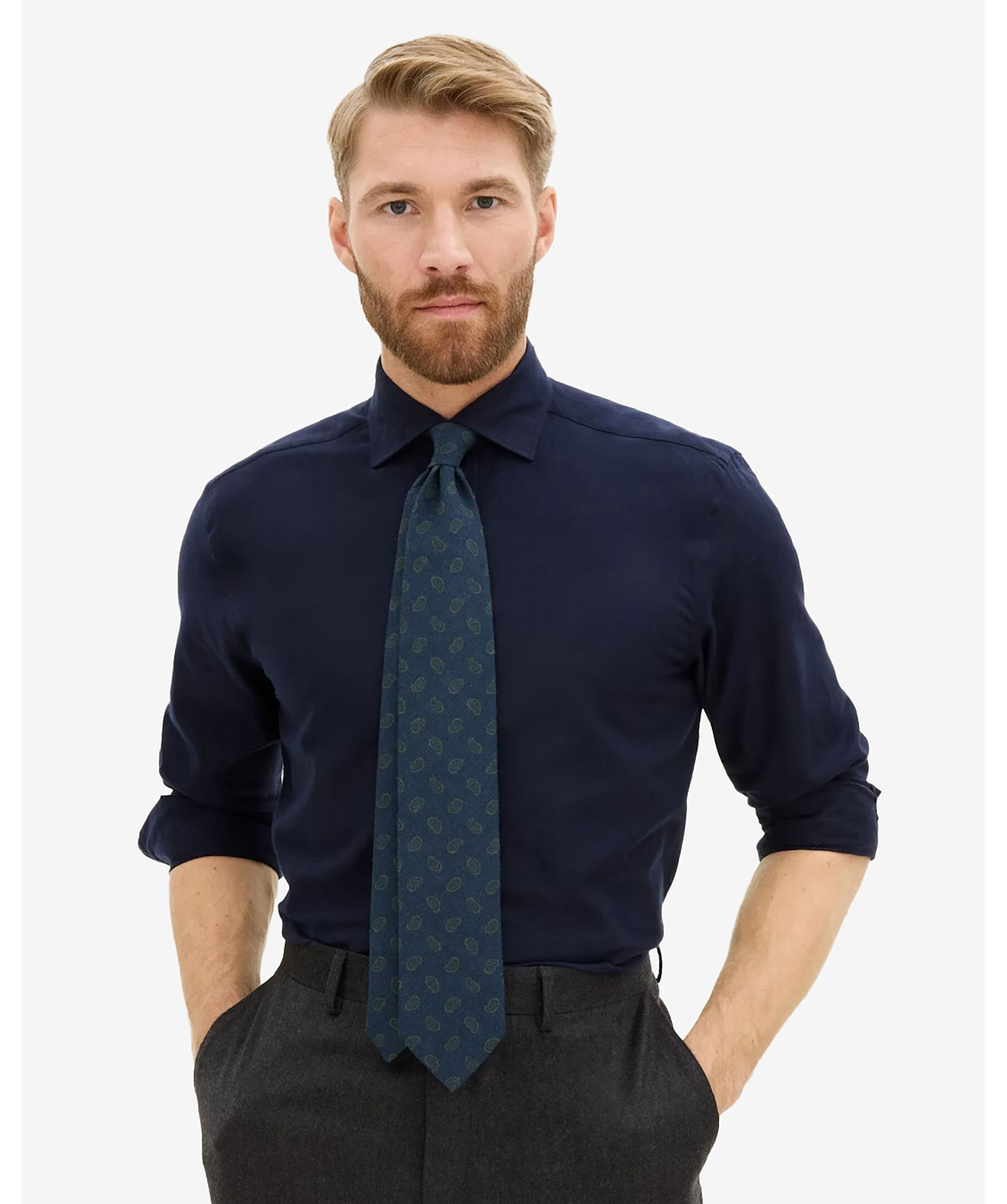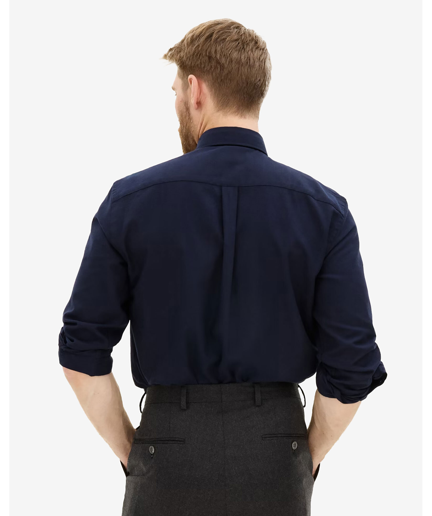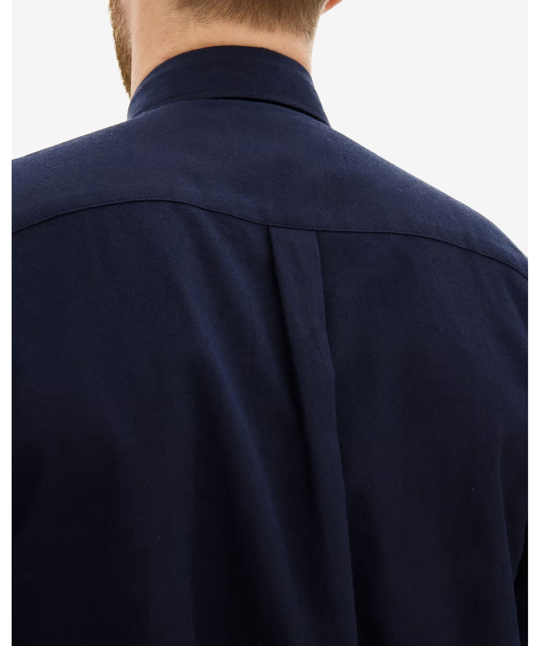 Mörkblå skjorta från Oscar Jacobson. Tillverkad i mjuk bomullsflanell och har en elegant regular fit-passform som smickrar utan att begränsa rörelsefriheten. Den är utrustad med en stilren cut away-krage och enkel manschett, vilket gör den till ett givet inslag i den sofistikerade vardagsstilen.