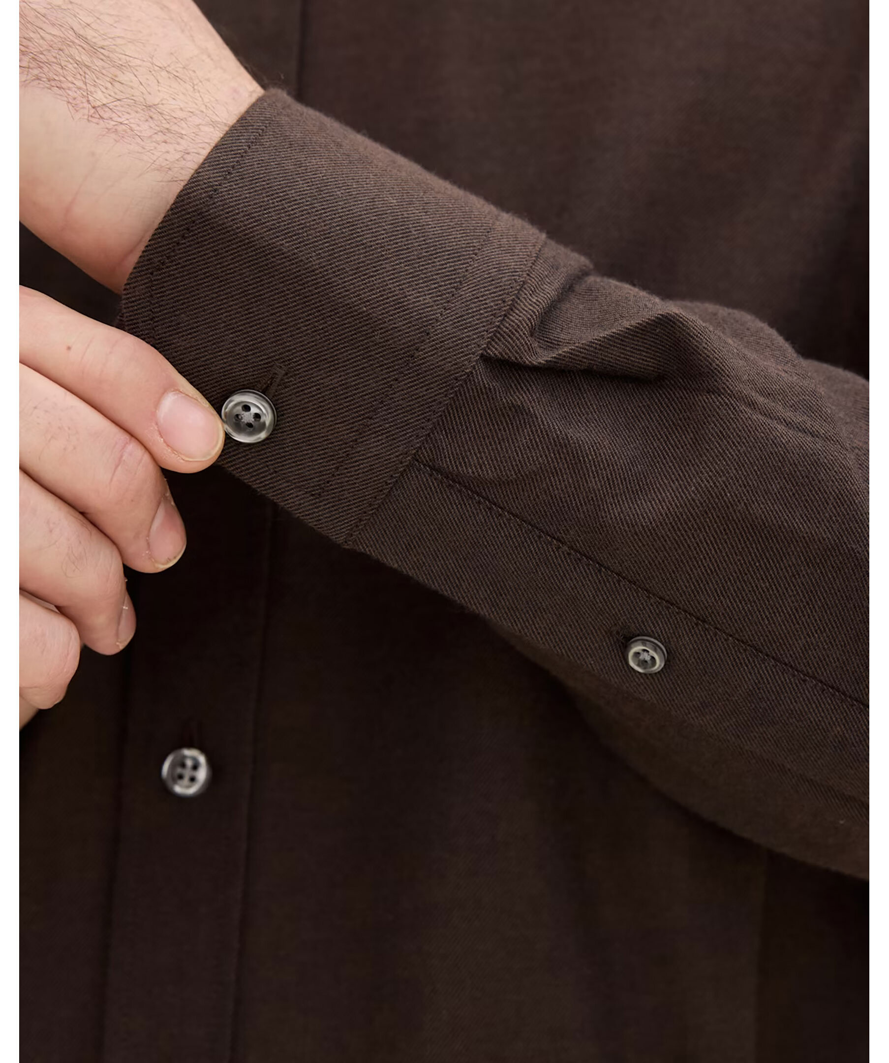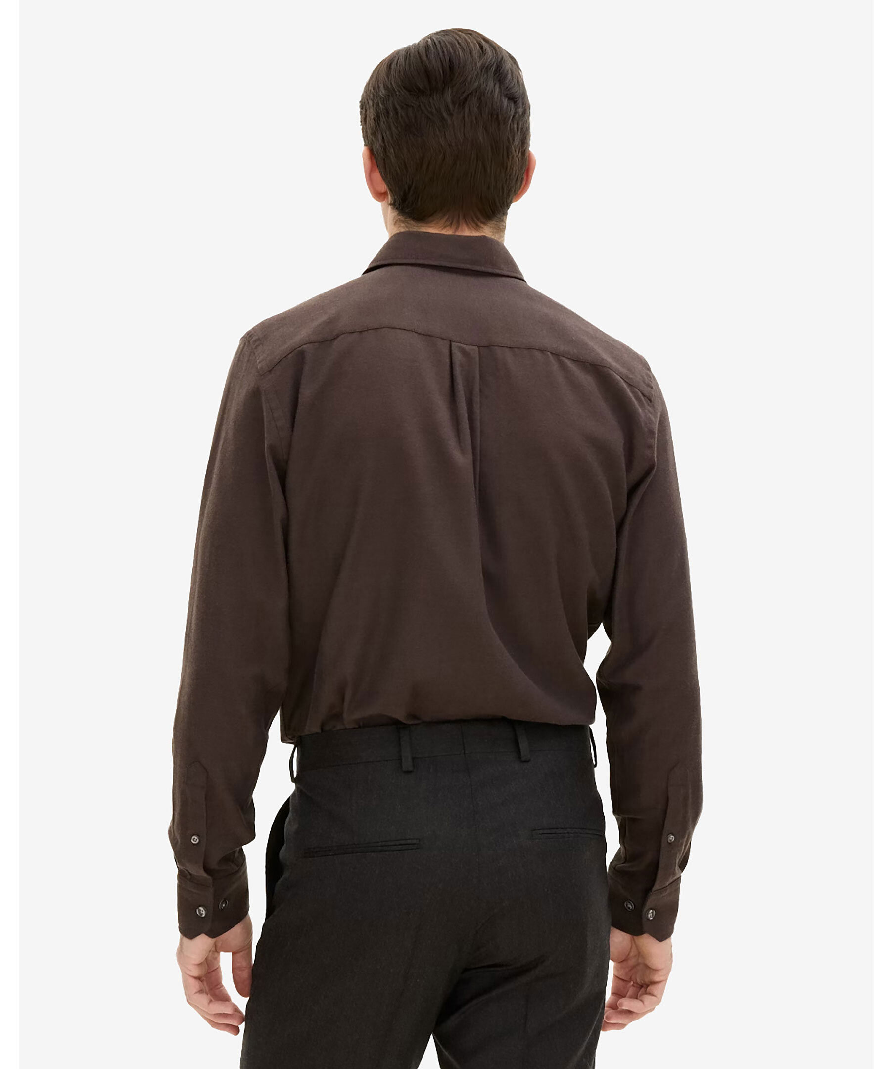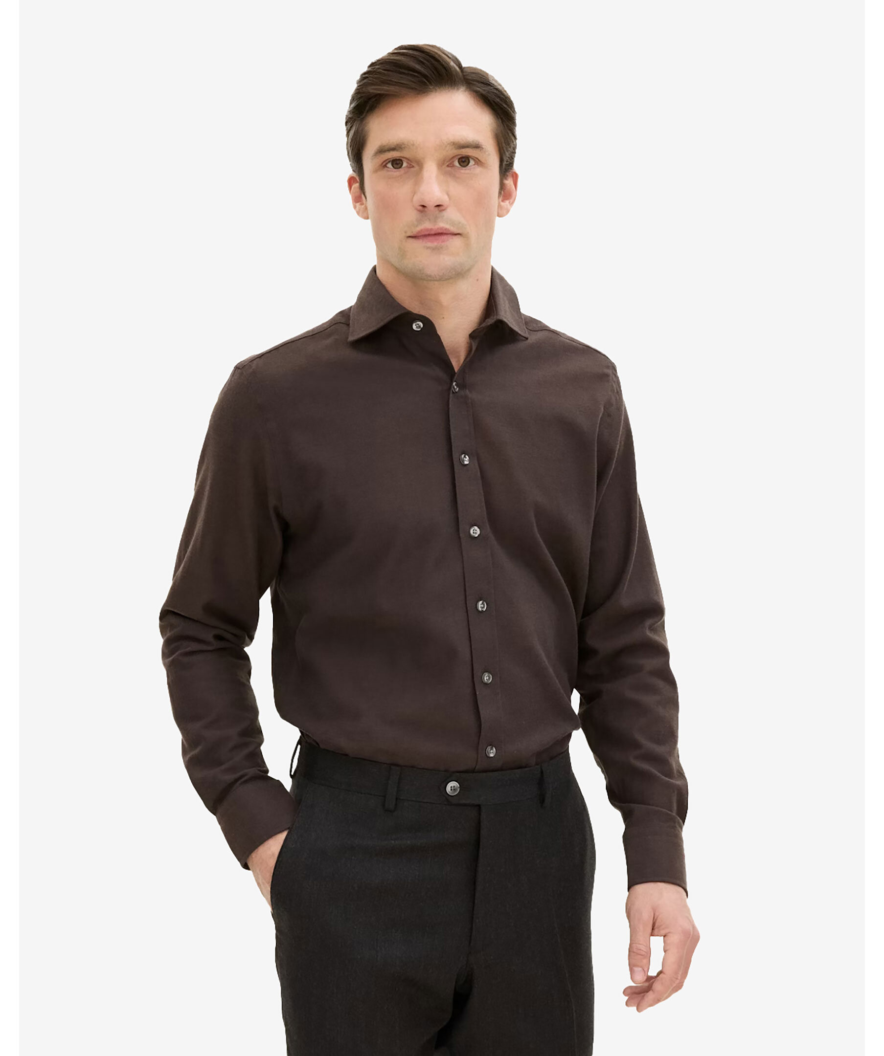 Brun skjorta från Oscar Jacobson. Tillverkad i mjuk bomullsflanell och har en elegant regular fit-passform som smickrar utan att begränsa rörelsefriheten. Den är utrustad med en stilren cut away-krage och enkel manschett, vilket gör den till ett givet inslag i den sofistikerade vardagsstilen.