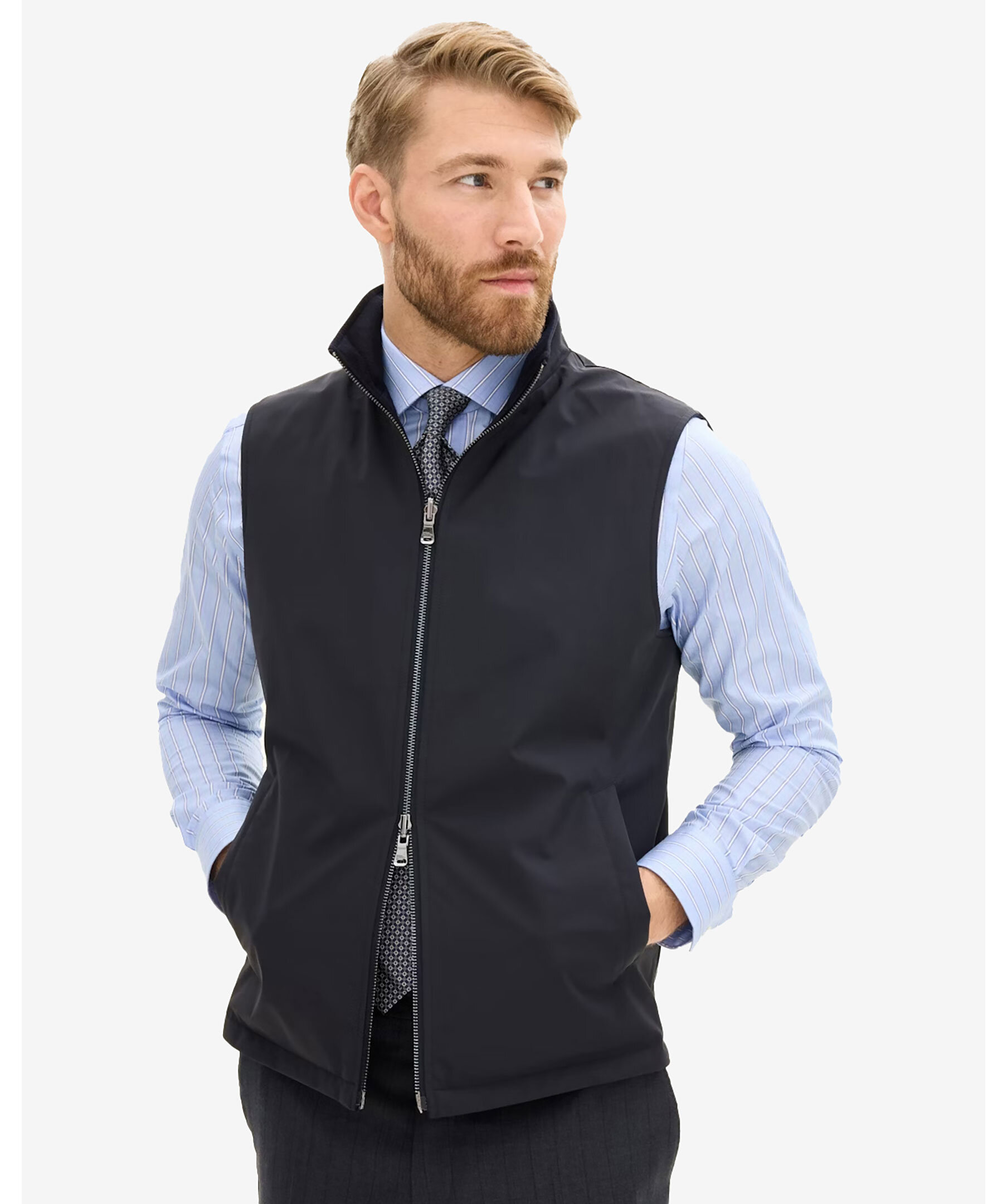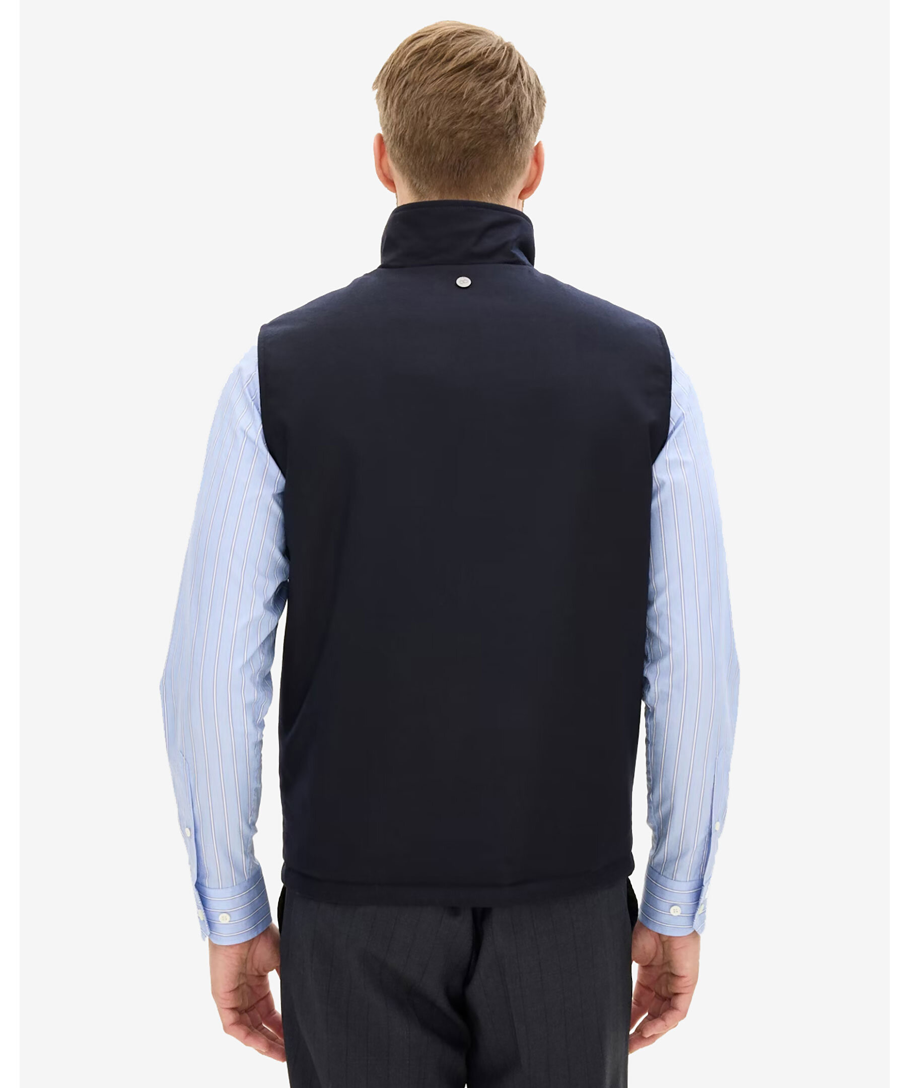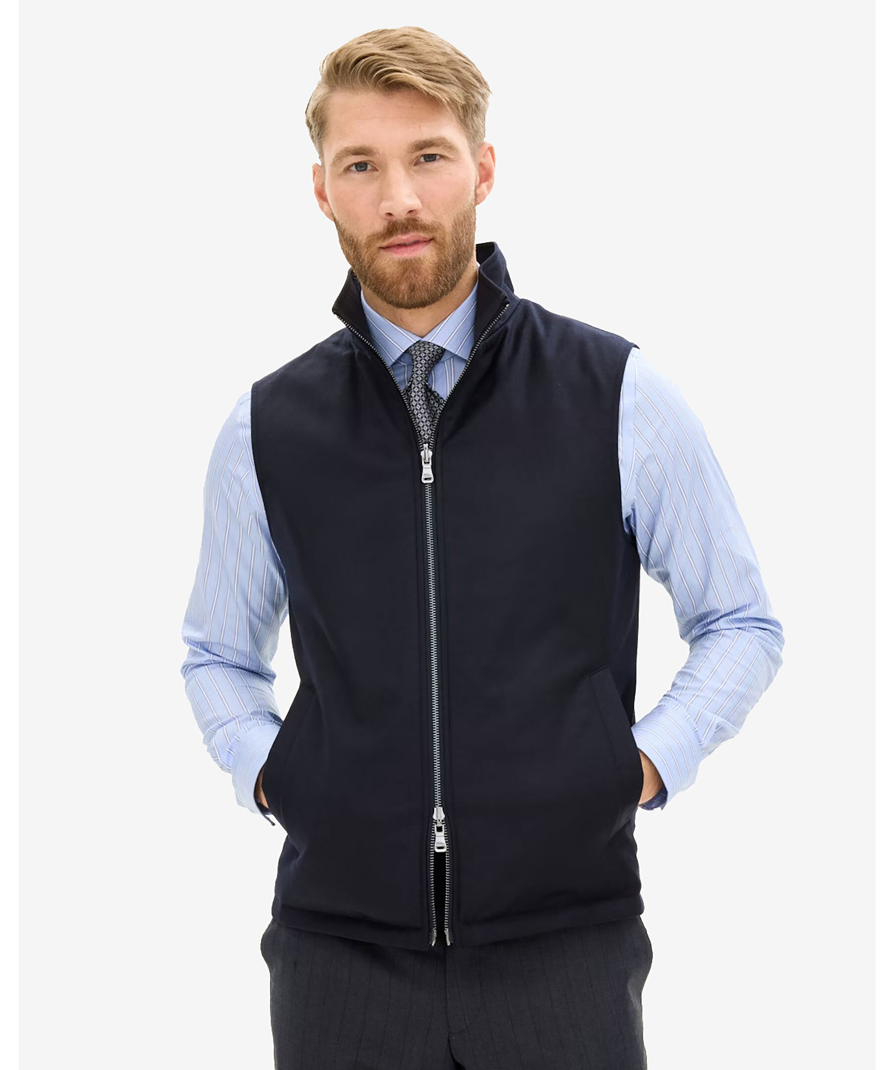 Vändbar vadderad flanellväst från Oscar Jacobson. Västen är gjord i en ullblandning på ena sidan och i polyester på andra sidan. Regular fit som ger en tidlös silhuett, vilket förenar stilren estetik med praktisk funktion. Perfekt för både formella och lediga tillfällen.