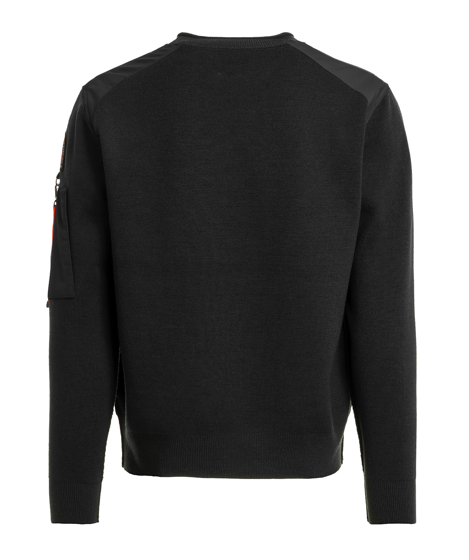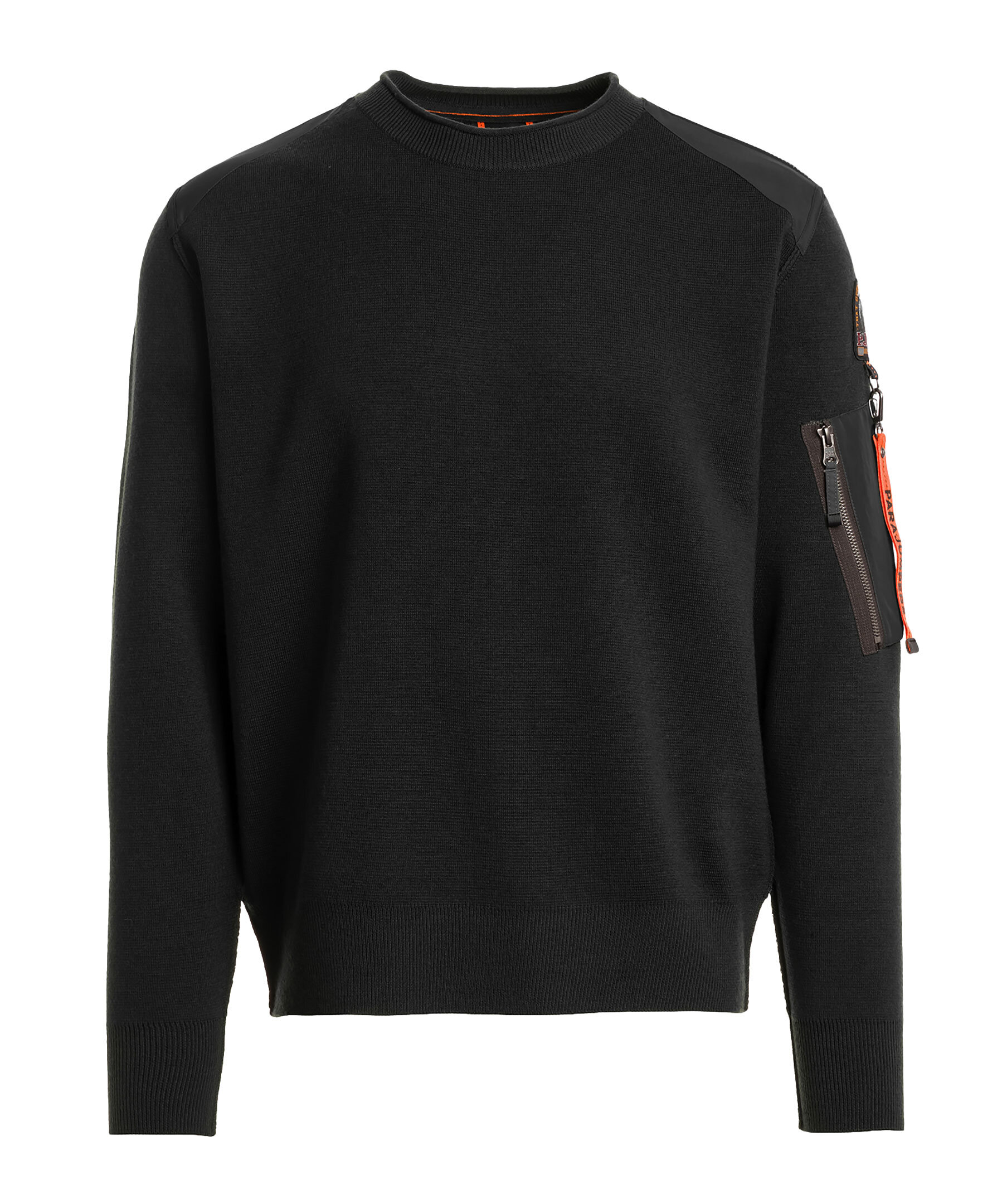Svart, stickad sweatshirt med struktur från Parajumpers. Sweatshirten har rund, ribbstickad halsringning, ribbstickade muddar vid ärm- och plaggslut samt patch-logotyp med karbinhake och ficka med dragkedja på vänster ärm. Tillverkad i en merinoullblandning.