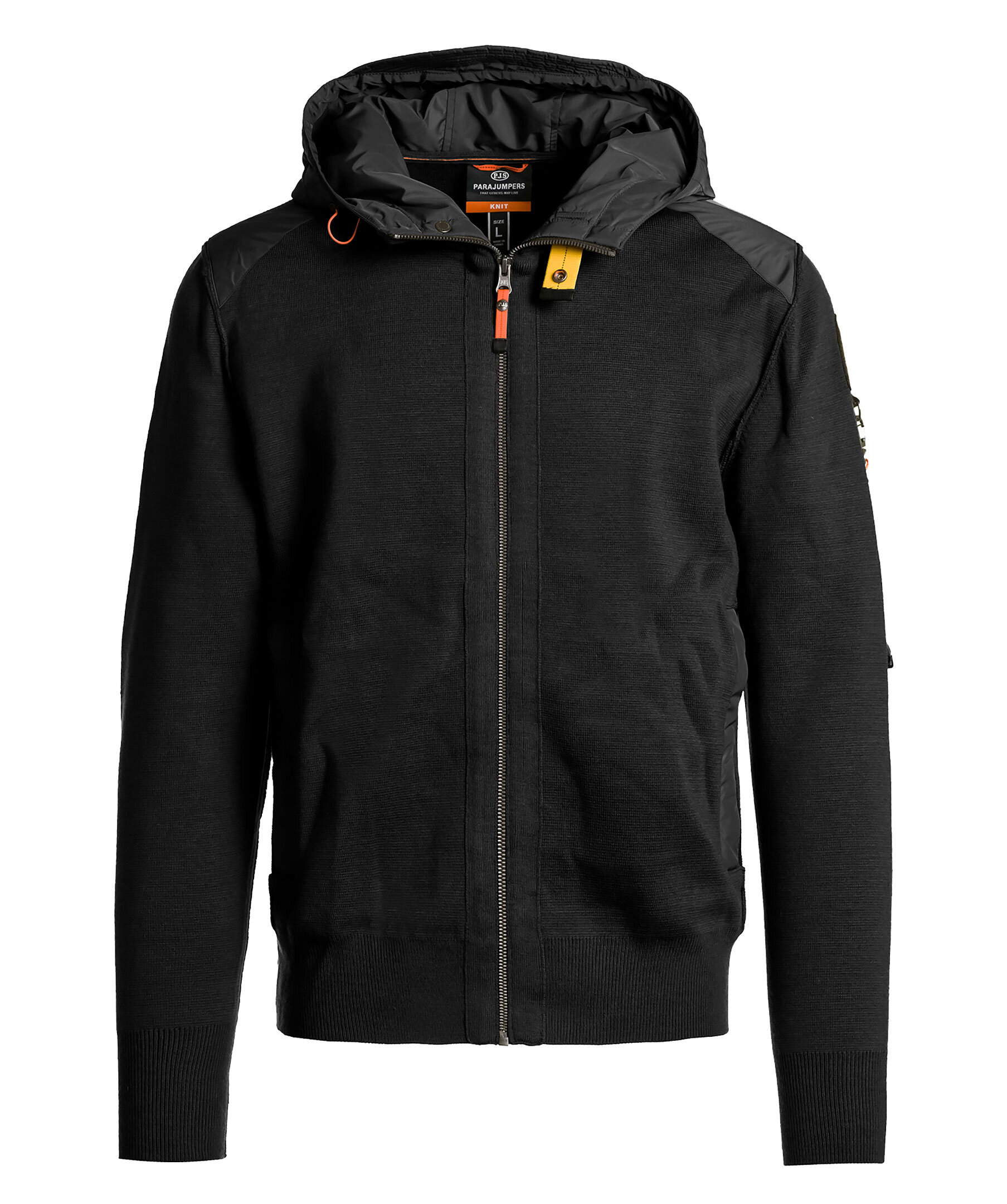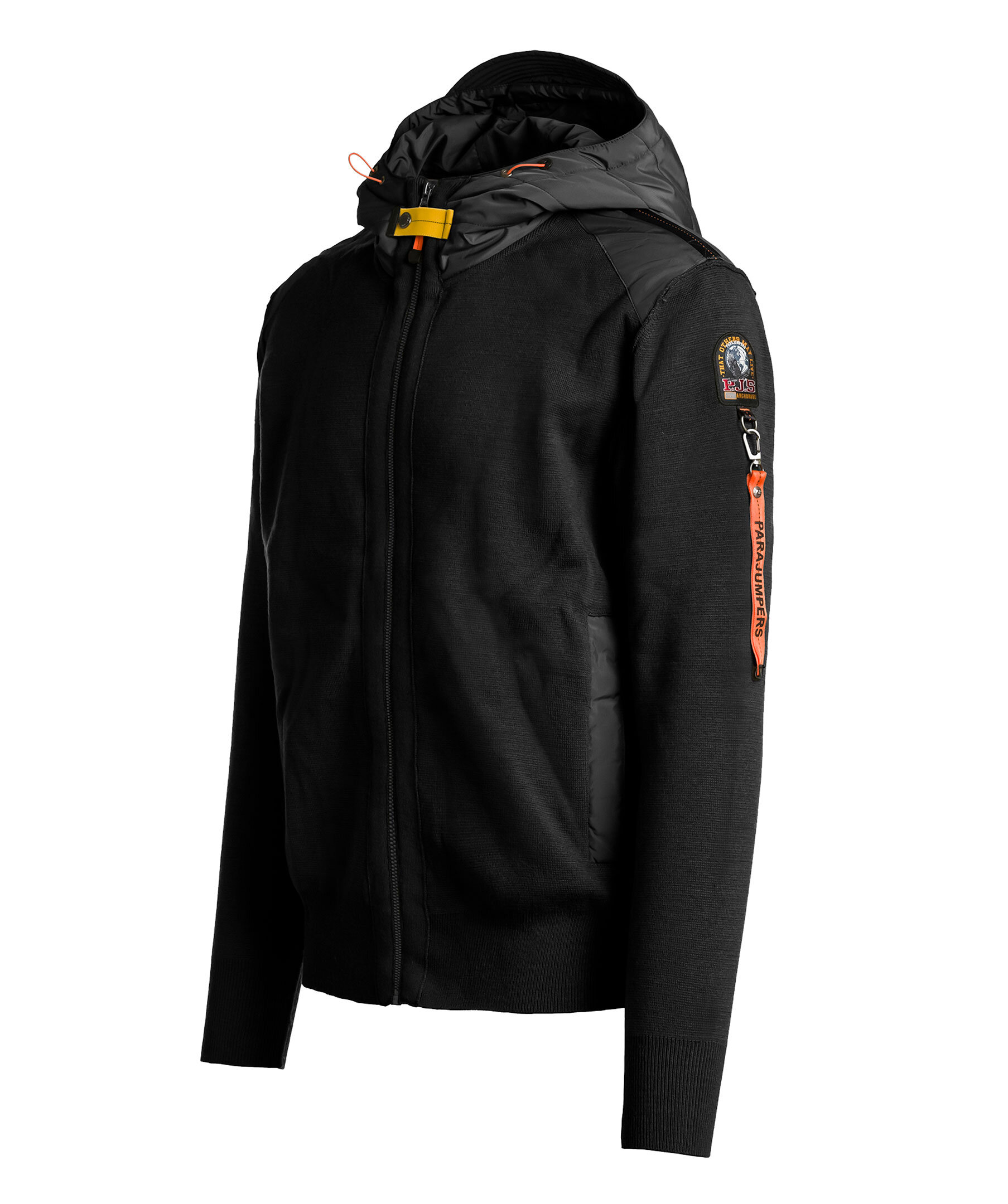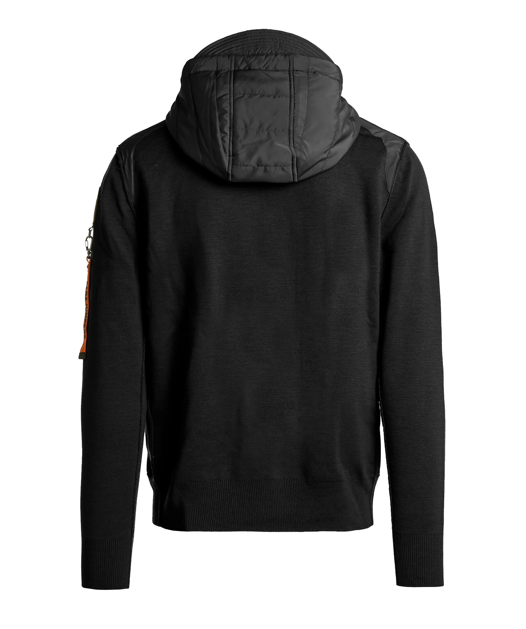 Svart, merinoullströja med luva i kontrastmaterial från Parajumers. Justerbar luva med hjälp av dragsko, dragkedja framtill och två framfickor. Ribbstickade ärmslut och nederkant. Den har ikoniska detaljer som den gula lappen vid kragen och orange avtagbar nyckelring på ärmen.