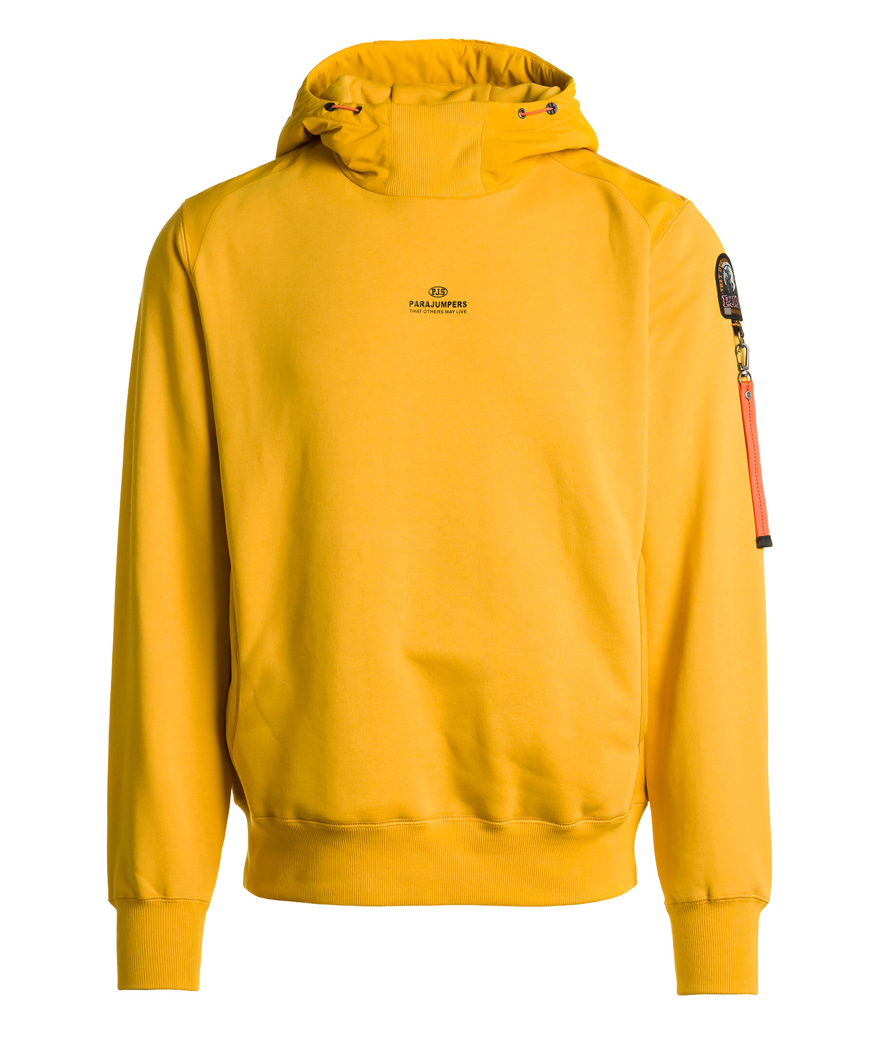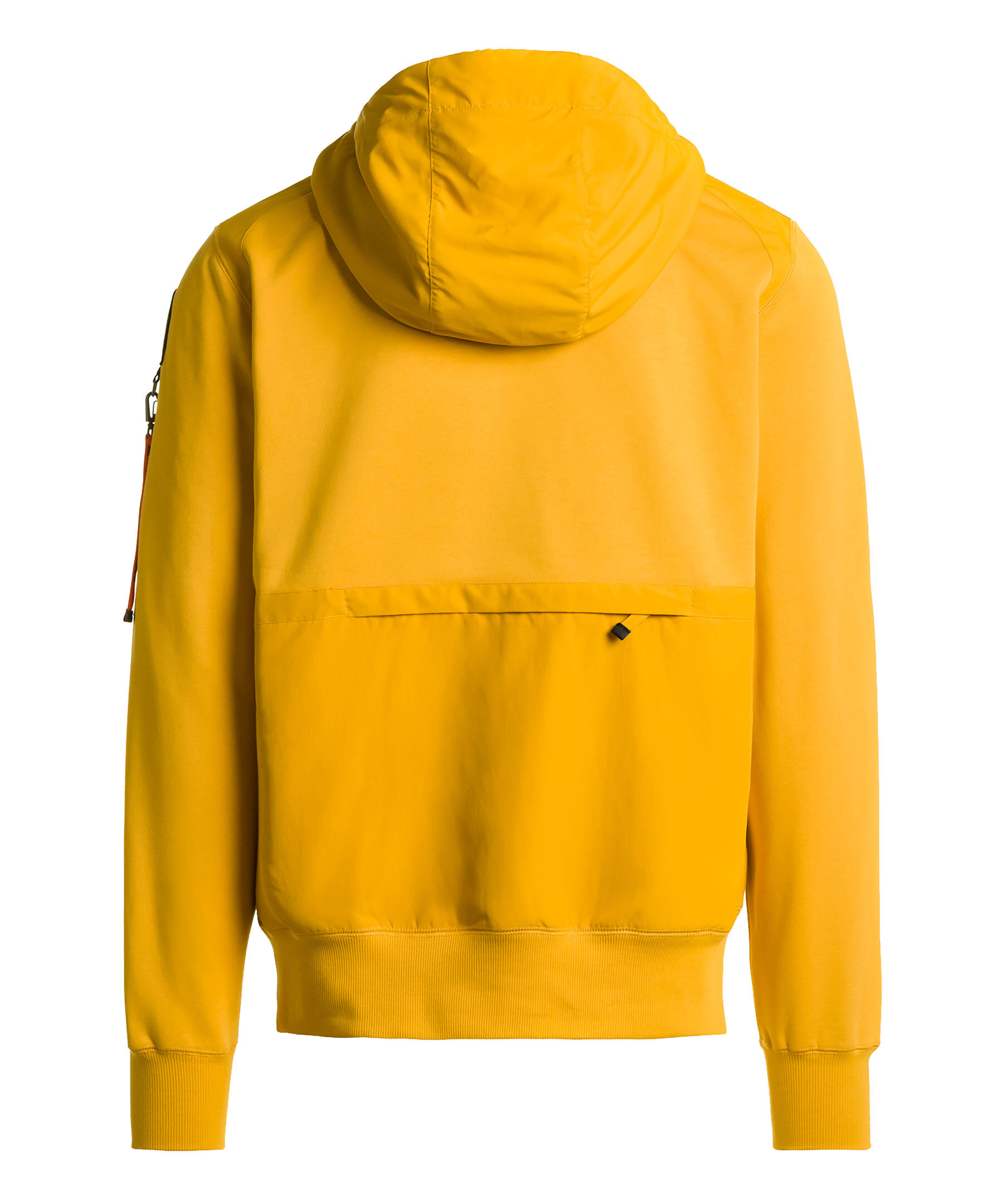 Gul hoodie från Parajumpers. Luva i vävt material med ribbstickad mudd och dragsko. Broderad patch med logotyp på vänster ärm. Gummerad logotyp mitt på bröstet. Två fickor framtill. Ficka baktill på ryggen i vävt material som stängs med dragkedja. Ribbstickad revär i sidan.