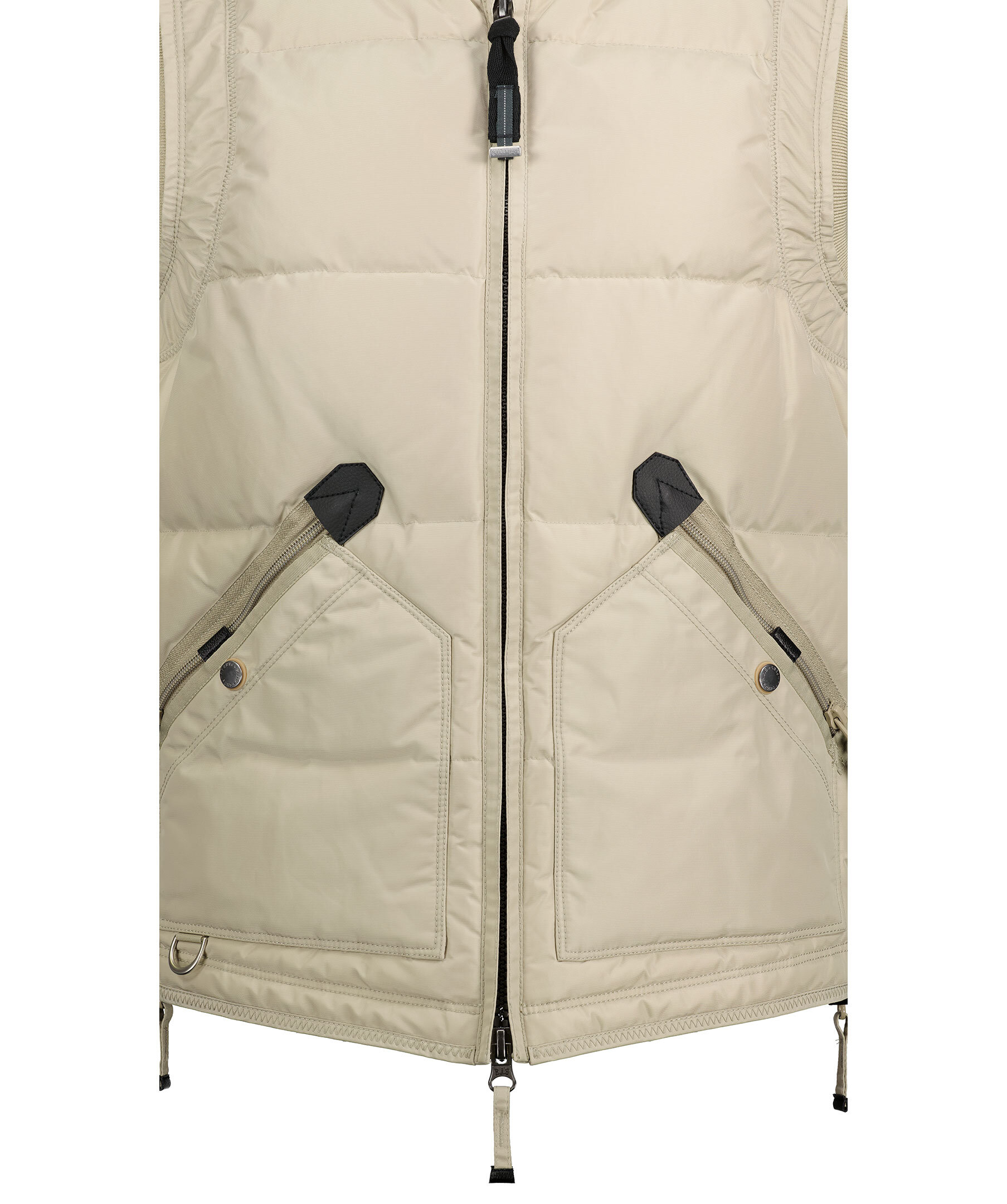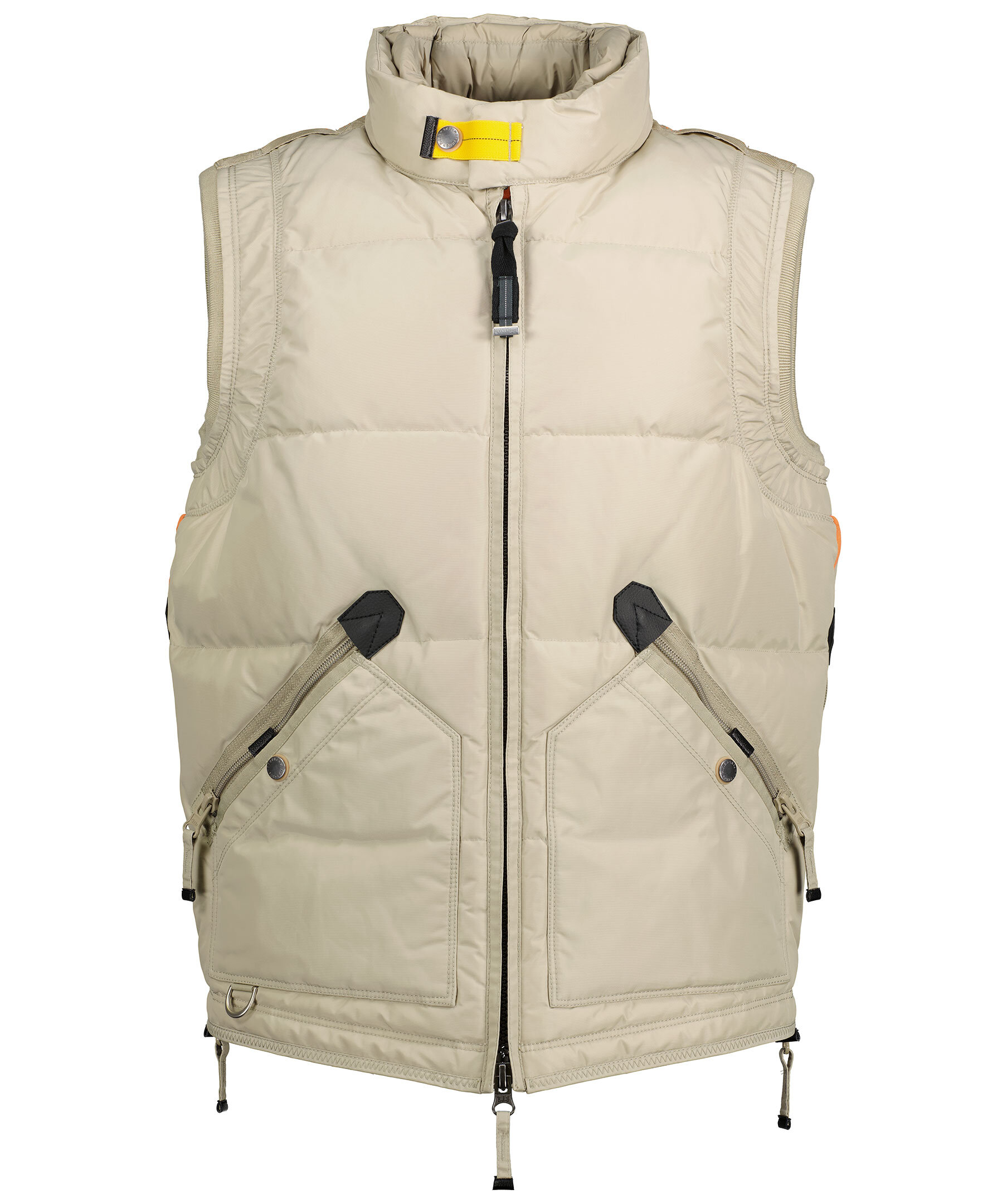 Beige dunväst från Parajumpers. Två dubbelfickor fram varav två med tryckknappar och två med dragkedja. Två innerfickor, spänne i kragen samt dragkedjor med vädringsnät i sidorna.