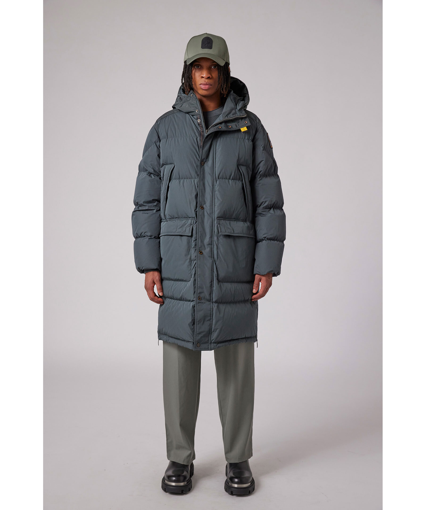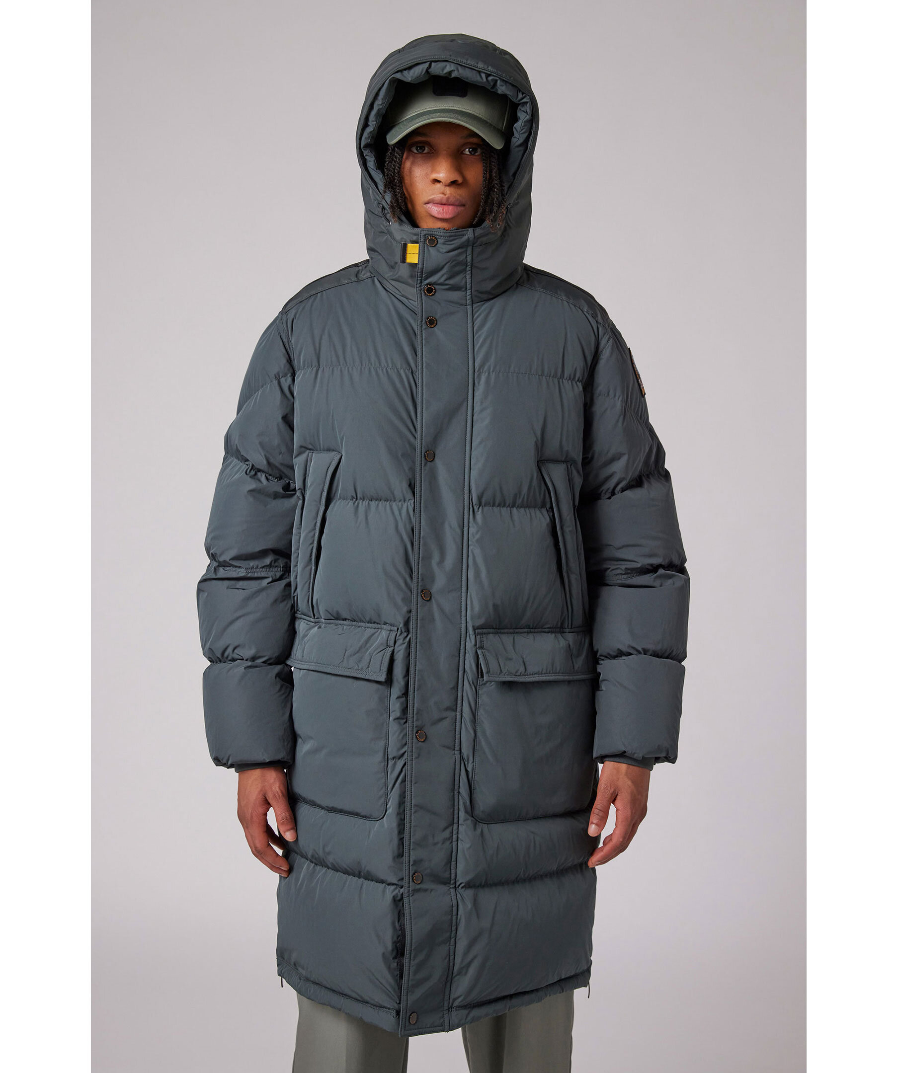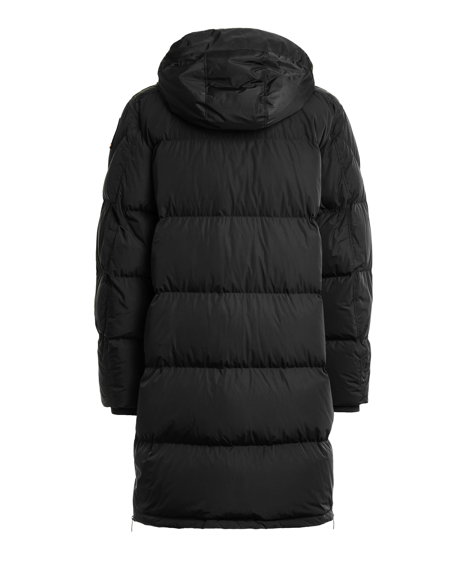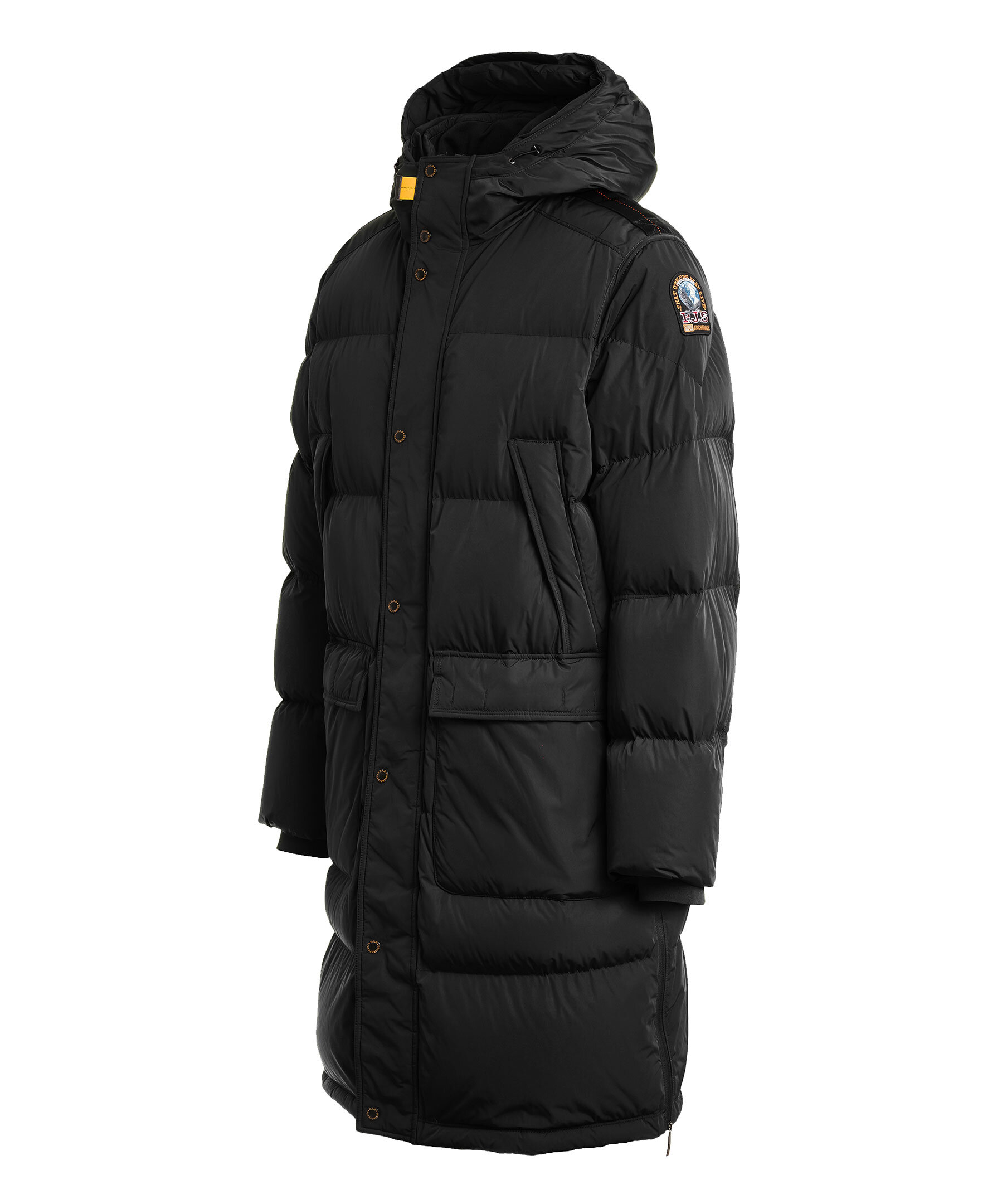 Svart, lång vinterjacka från Parajumpers. Jackan stängs med dold tvåvägsdragkedja och tryckknappar och har huva med dragsko, två stora fickor med lock samt två sneda bröstfickor med lock och knapp. Patch-logotyp på vänster ärm. Tillverkad i en polyester- och polyamidblandning med dunfyllning. ■ OBS! Modellbilderna visar endast passform