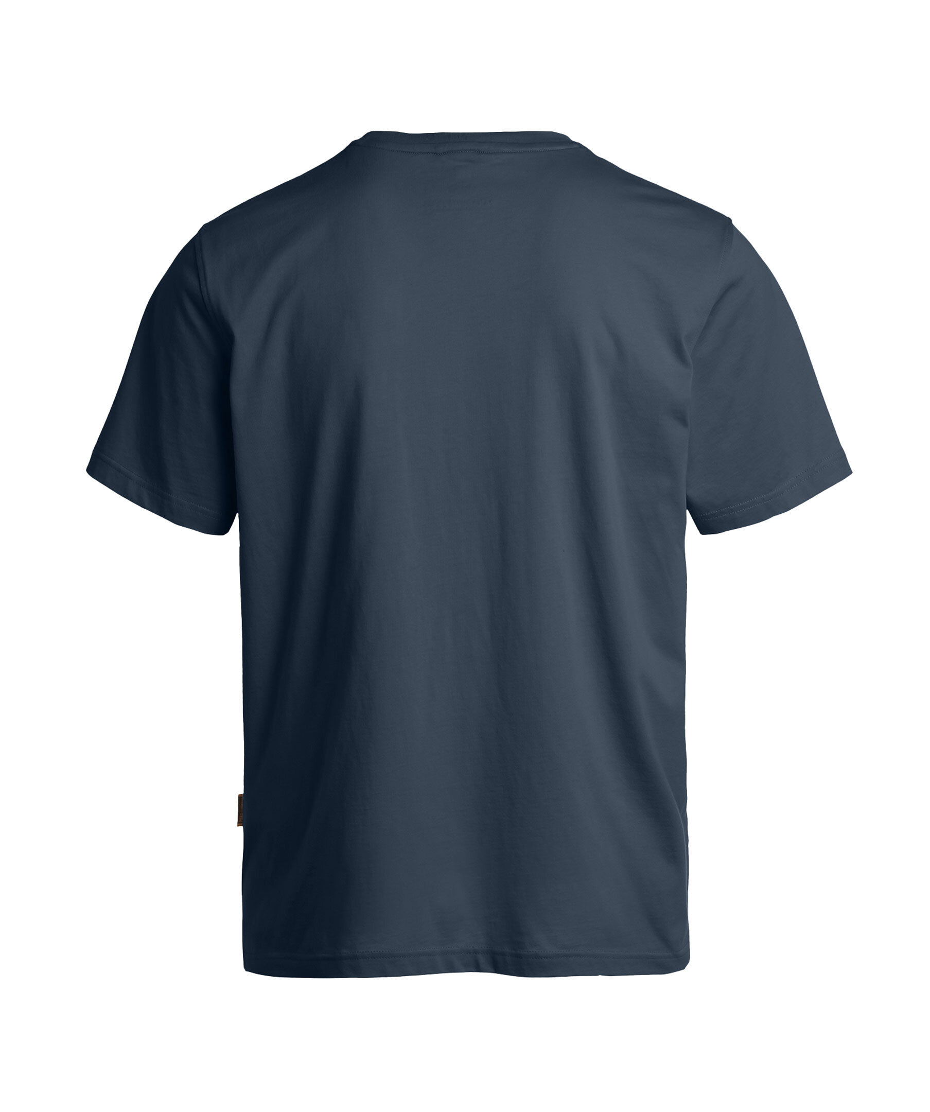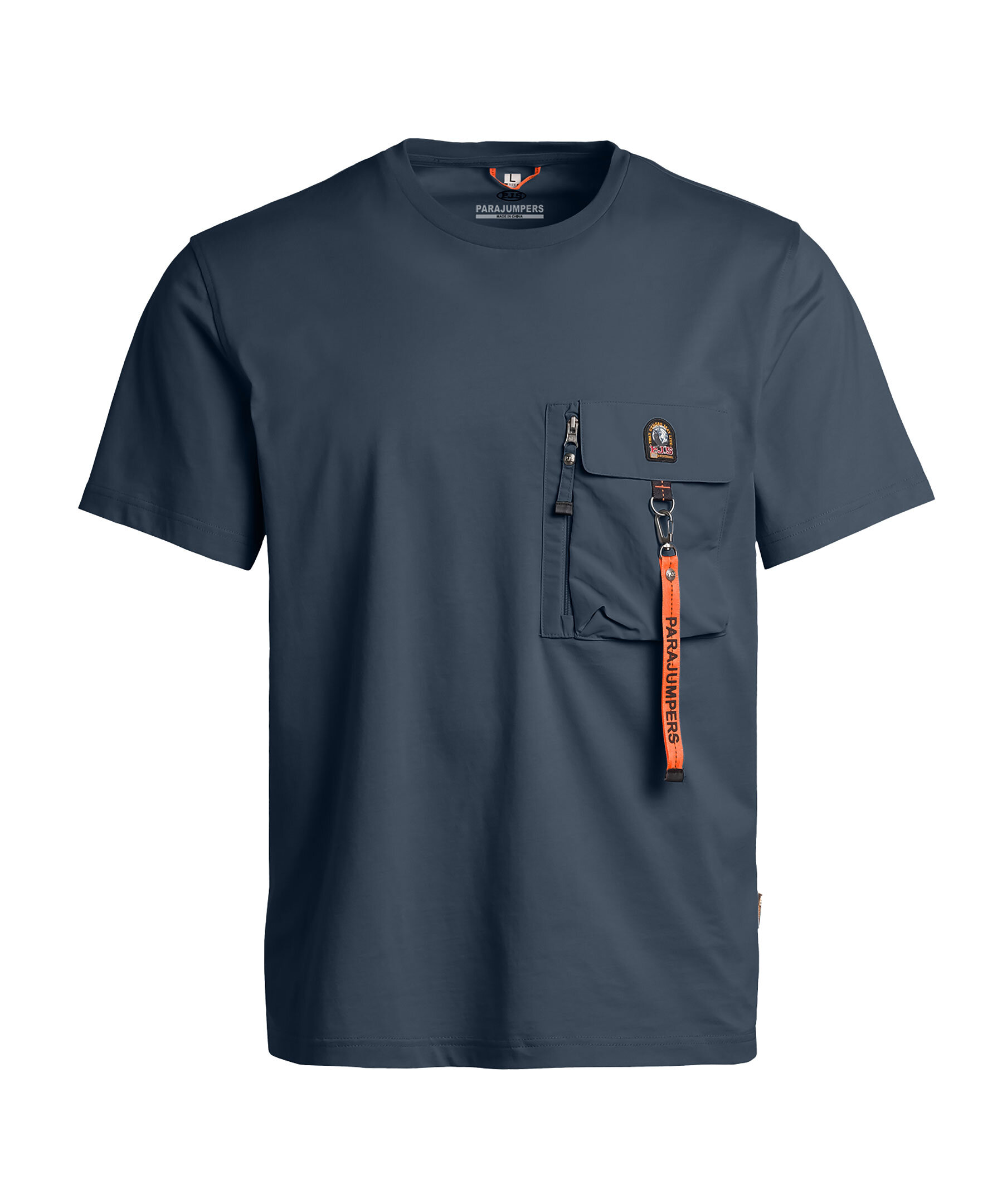 Marinblå t-shirt från Parajumpers. Bröstficka på vänster sida med patch med logotyp och hängande logotyp i oranget med karbinhake, fickan stängs med lock och dragkedja. Rundad halsringning. Tillverkad i 100% Bomull.