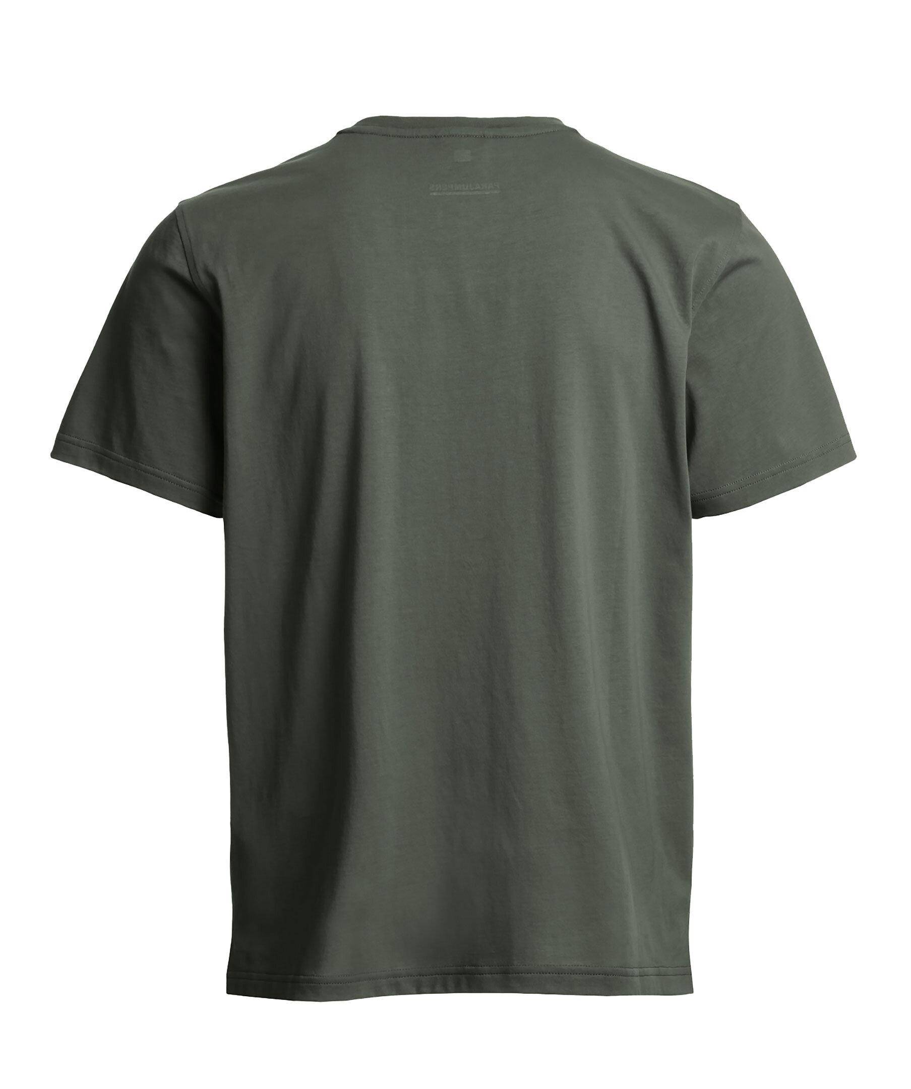 Mörkgrön T-shirt från Parajumpers. Bröstficka på vänster sida med patch med logotyp och hängande logotyp i oranget med karbinhake. Fickan stängs med lock och dragkedja. Rundad halsringning. Tillverkad i 100% bomull.