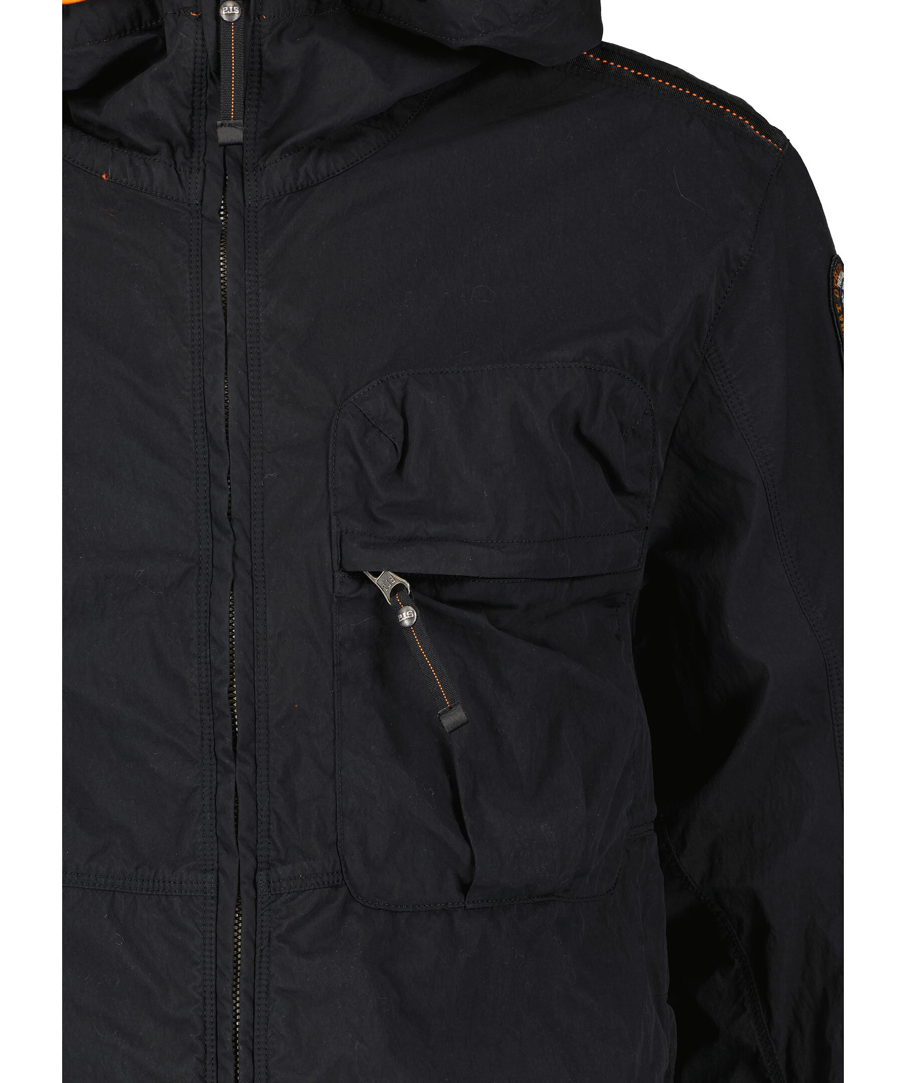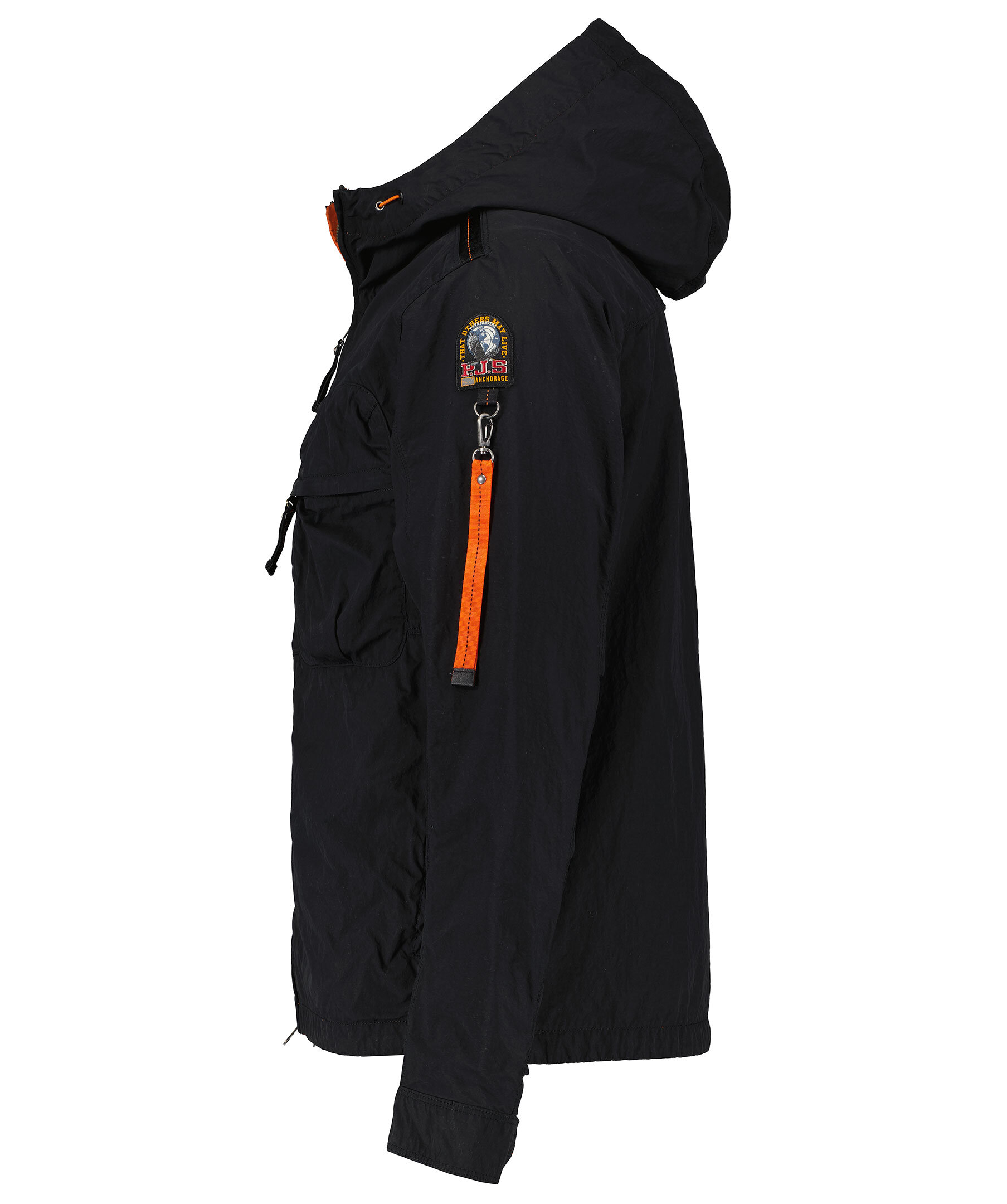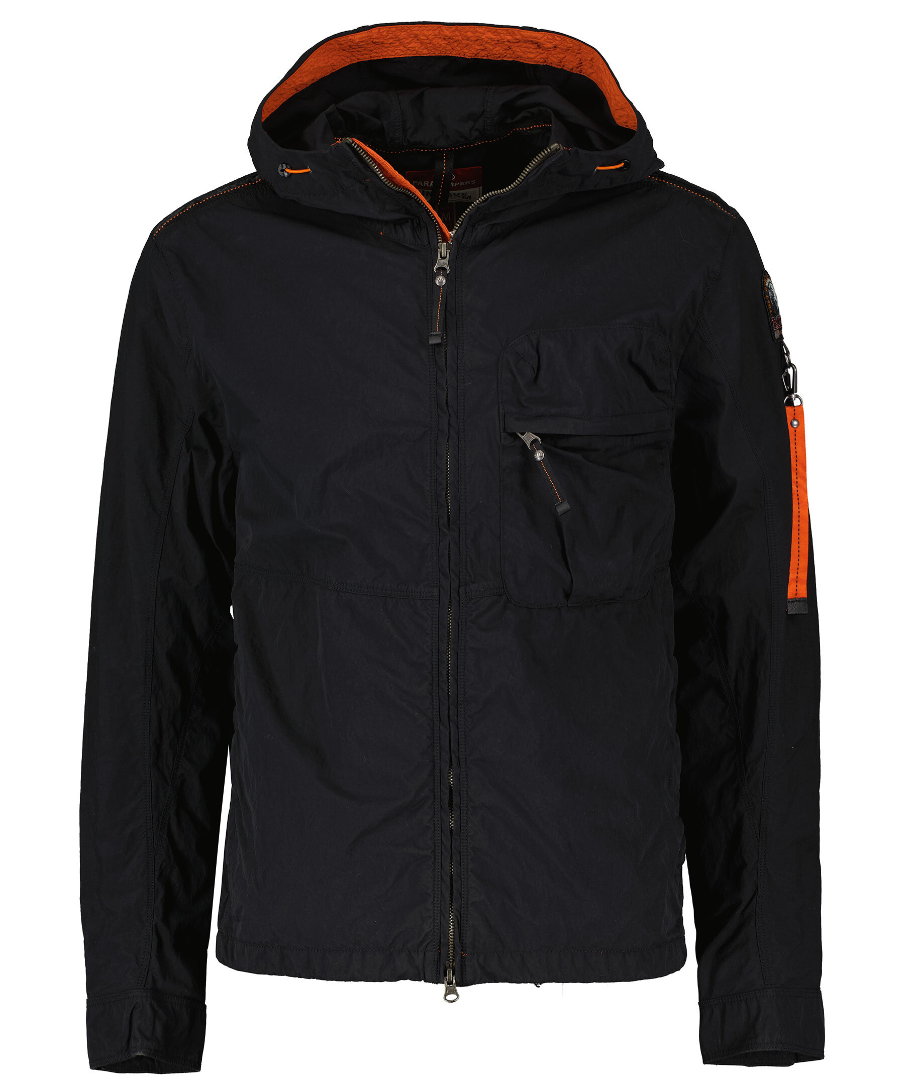Svart, lätt jacka med huva från Parajumpers med sommaräventyr i åtanke. Tillverkad i polyamid och polyester. Stängs med dragkedja. Två sidfickor som stängs med knäppning samt en bröstficka som stängs med dragkedja. Orange detalj inuti huva. Patch-logotyp på vänster ärm samt en hängande logotyp i oranget med karbinhake.