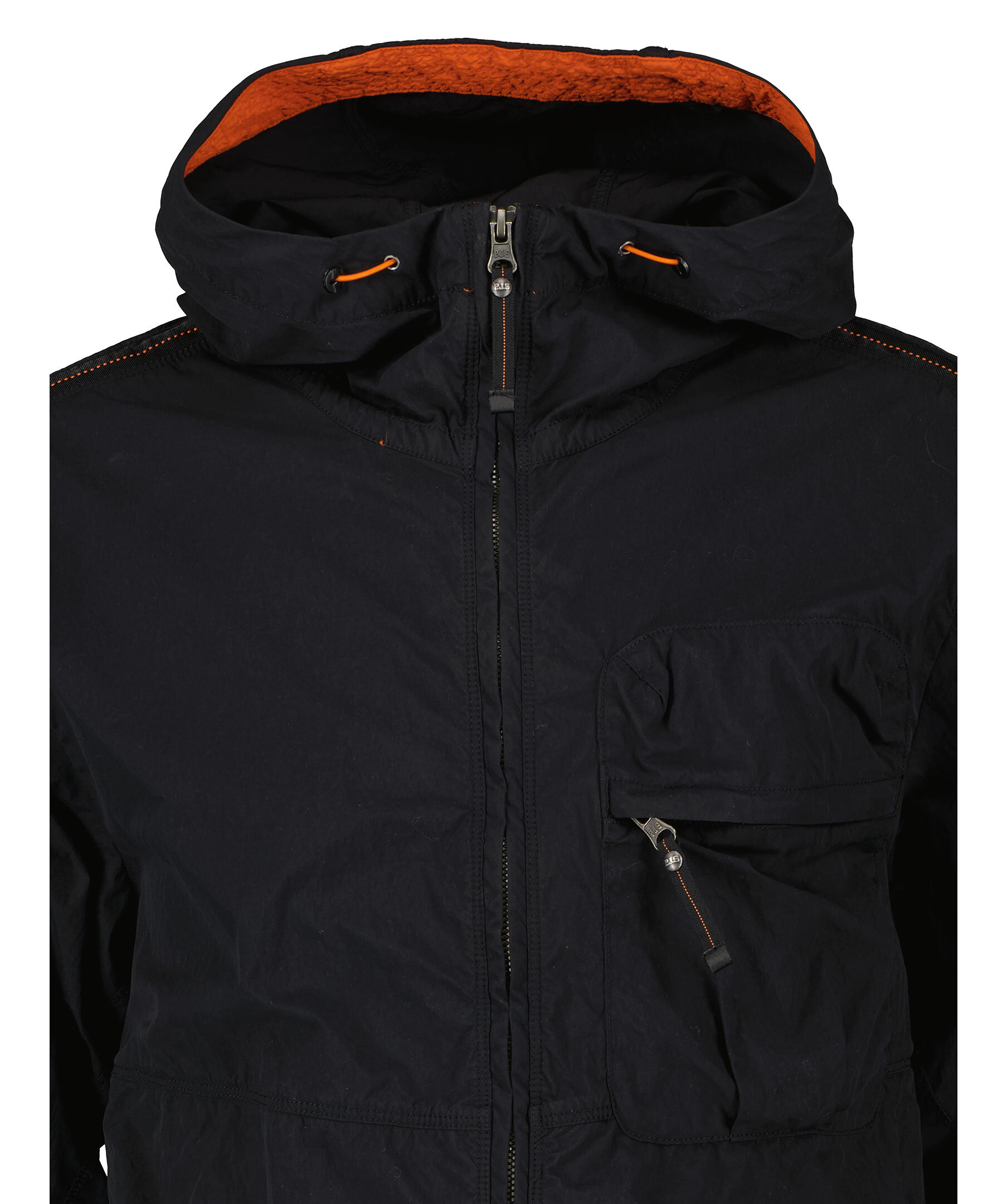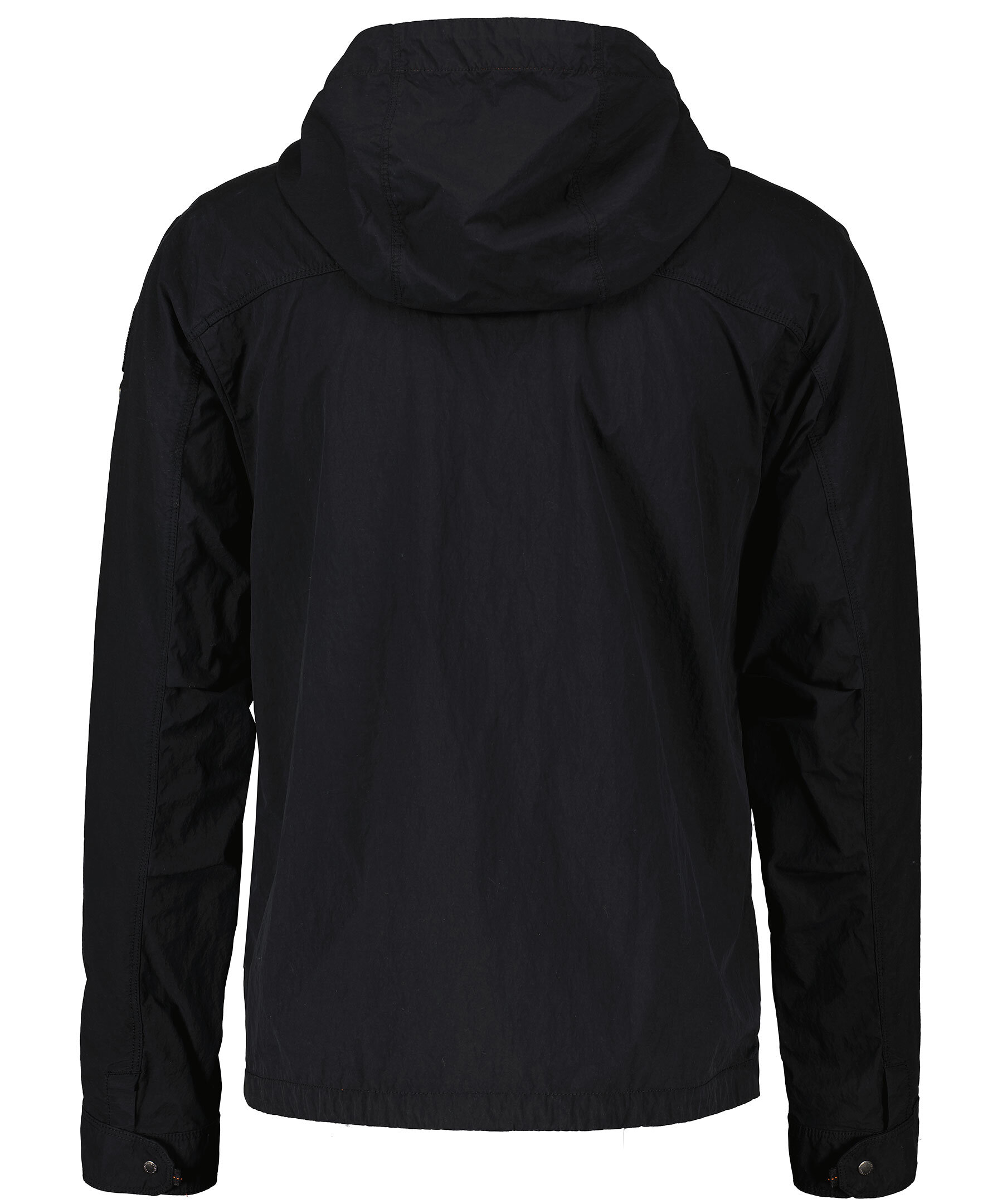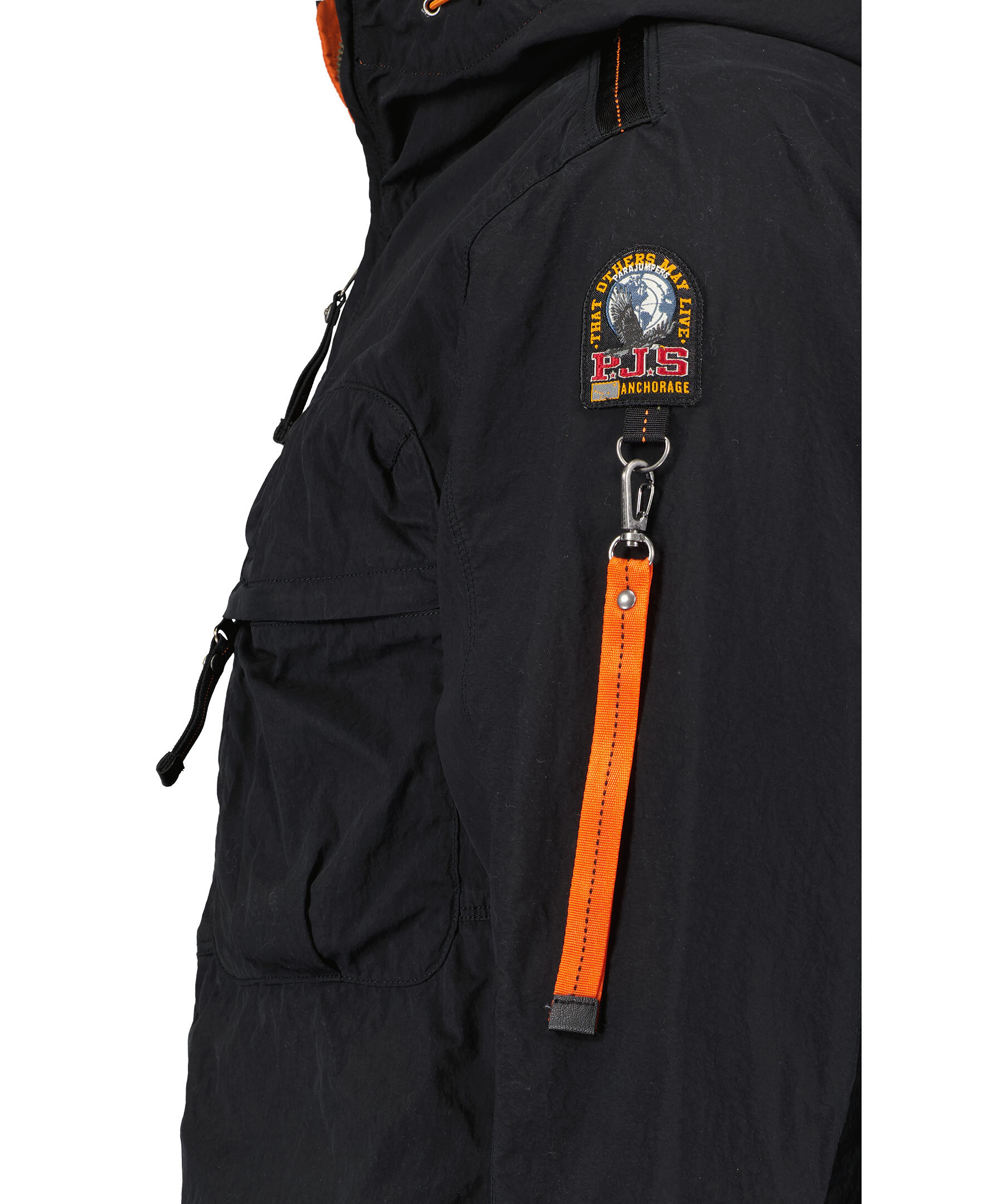 Svart, lätt jacka med huva från Parajumpers med sommaräventyr i åtanke. Tillverkad i polyamid och polyester. Stängs med dragkedja. Två sidfickor som stängs med knäppning samt en bröstficka som stängs med dragkedja. Orange detalj inuti huva. Patch-logotyp på vänster ärm samt en hängande logotyp i oranget med karbinhake.