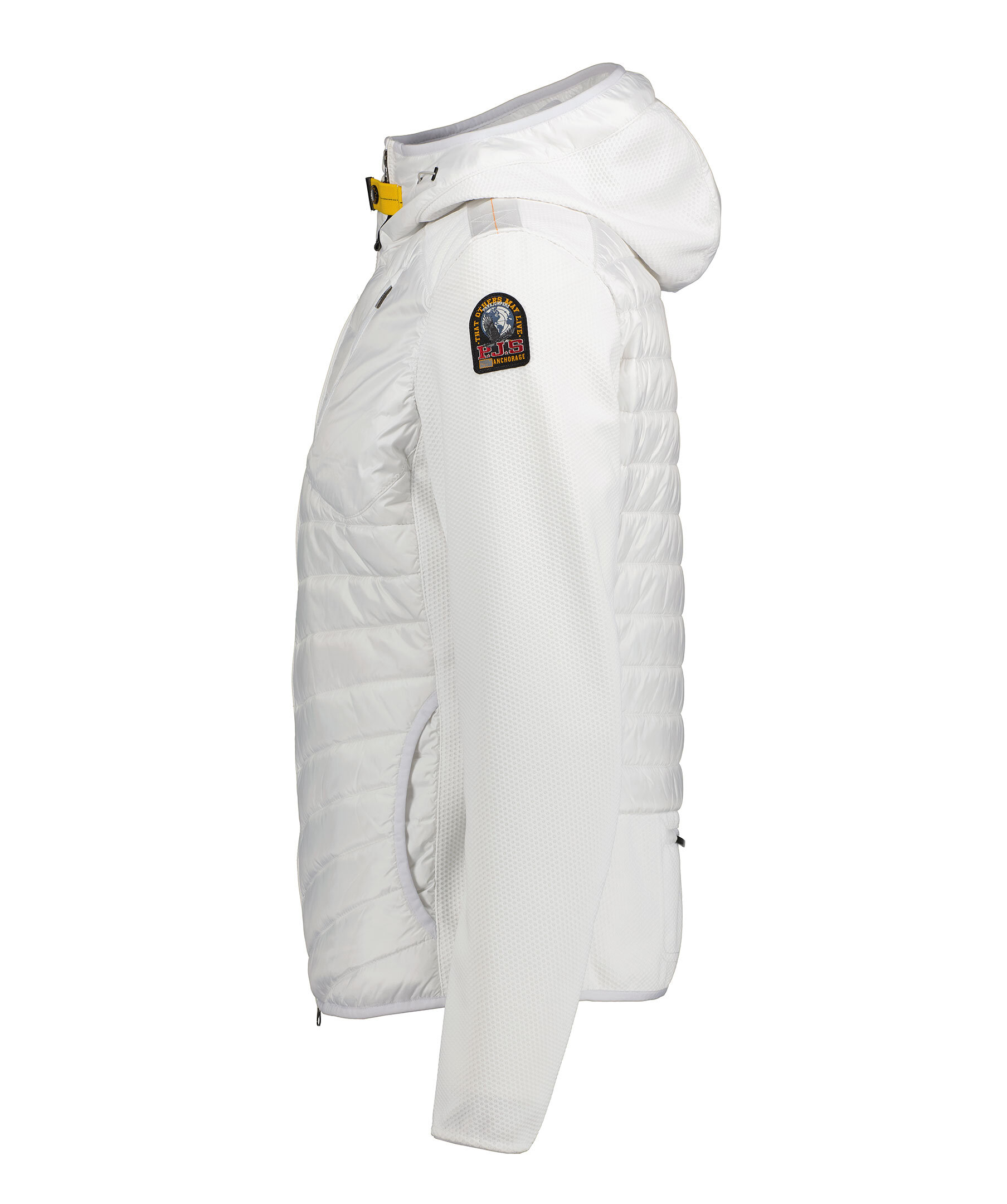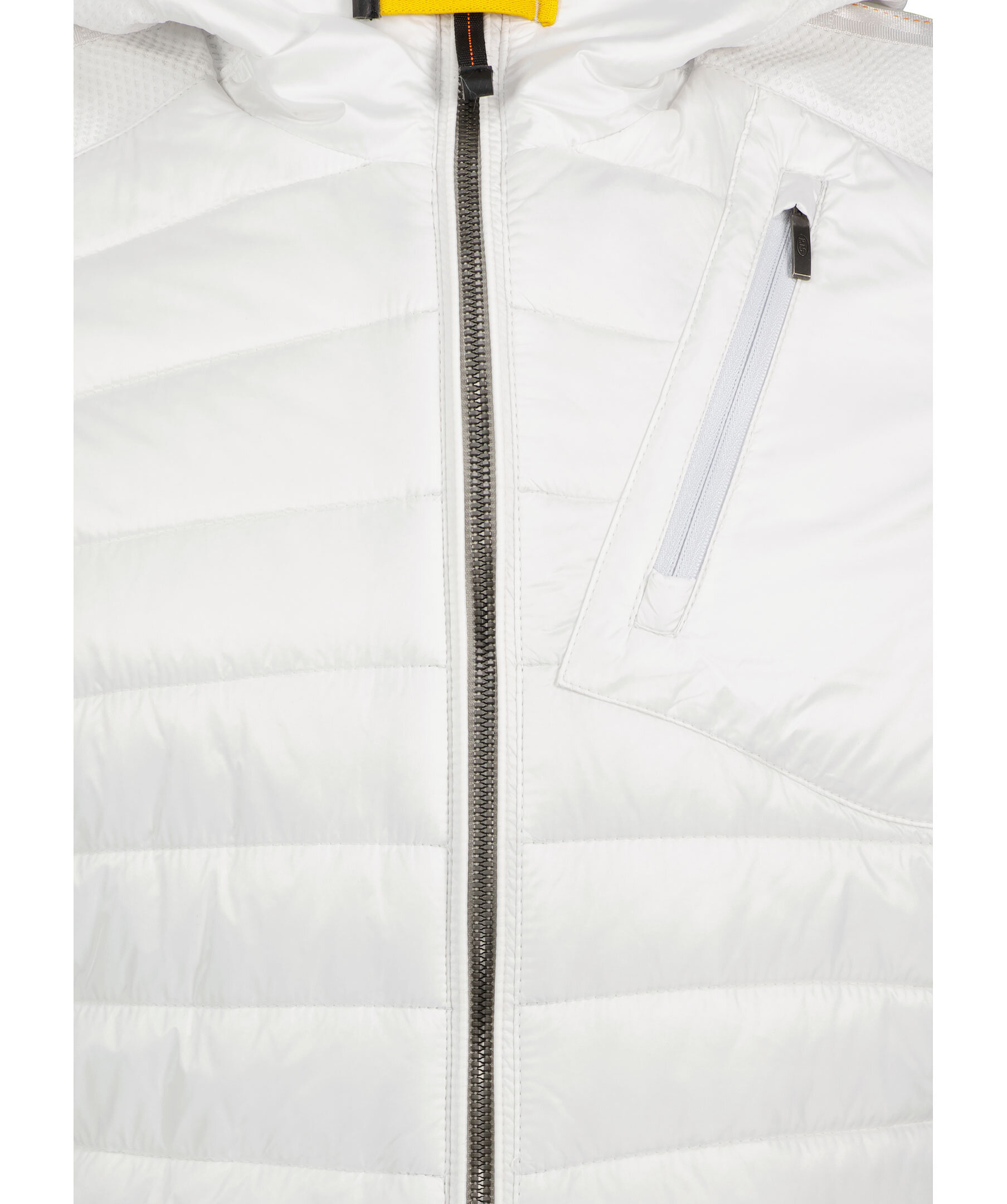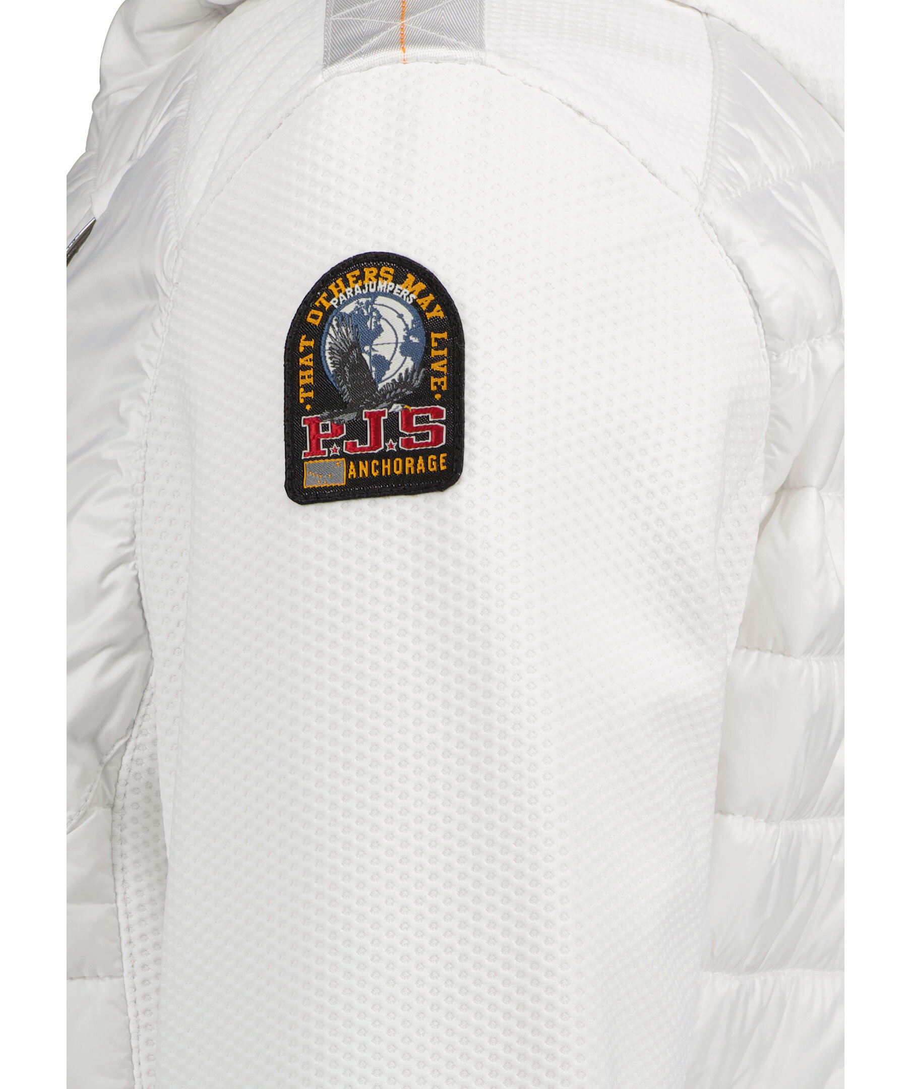 Vit hybrid jacka med huva från Parajumpers. Jackan har två sidfickor samt en snedställd bröstficka med dragkedja. Patch-logotyp på vänster ärm. Ficka med dragkedja i svanken. Dragsko i huvan. Tillverkad i en polyamid- och polyesterblandning. Jackan stängs med tvåvägsdragkedja. Perfekt för mellansäsongsväder, kan enkelt packas ihop för att alltid vara redo när det blir svalare. OBS! Jackan på modellen visar endast på passform och inte varans färg.