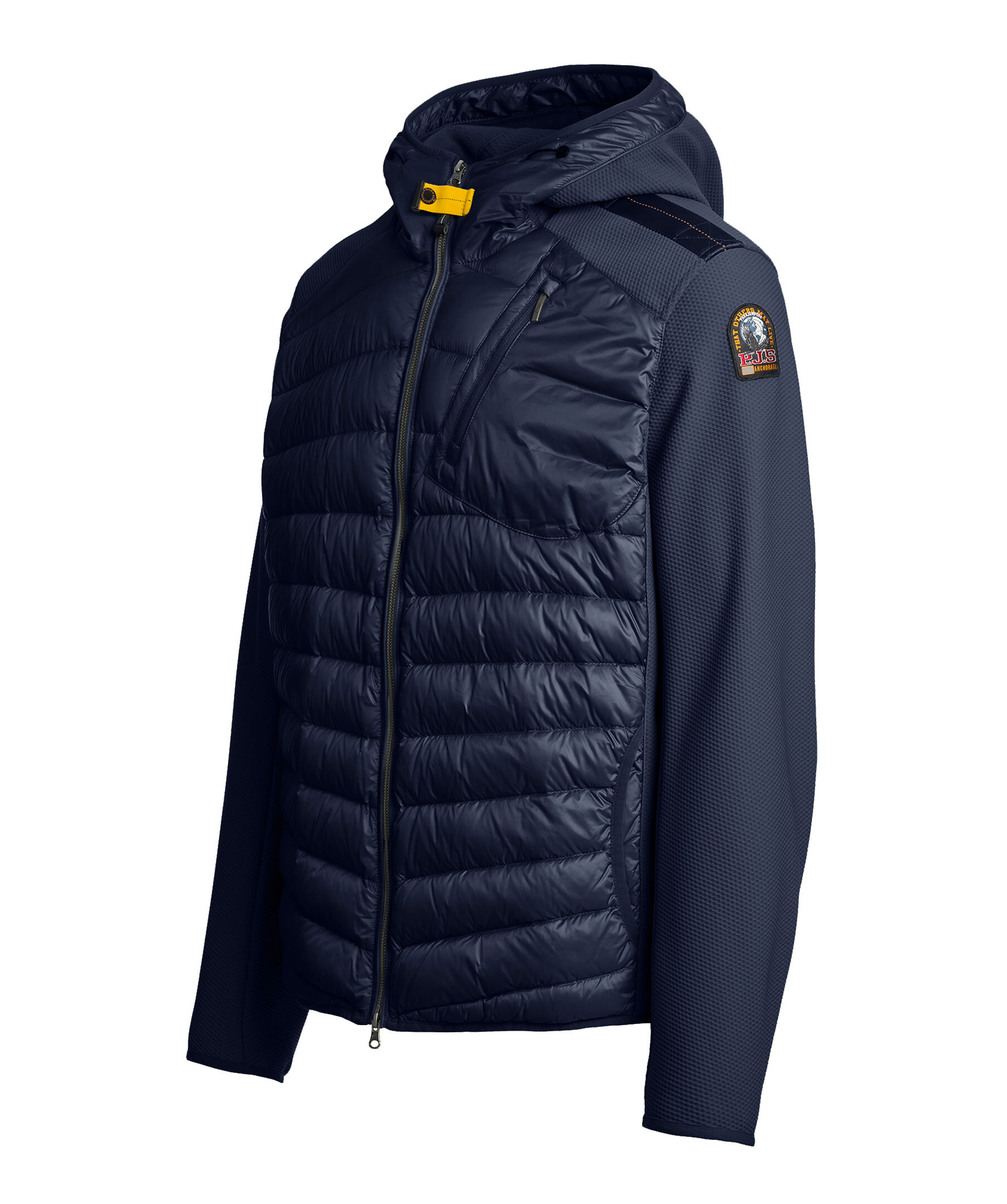 Mörkblå hybrid jacka med huva från Parajumpers. Jackan har två sidfickor samt en snedställd bröstficka med dragkedja. Patch-logotyp på vänster ärm. Ficka med dragkedja i svanken. Dragsko i huvan. Tillverkad i en polyamid- och polyesterblandning. Ventilationshål i armhålorna. Jackan stängs med tvåvägsdragkedja. Perfekt för mellansäsongsväder, kan enkelt packas ihop för att alltid vara redo när det blir svalare.