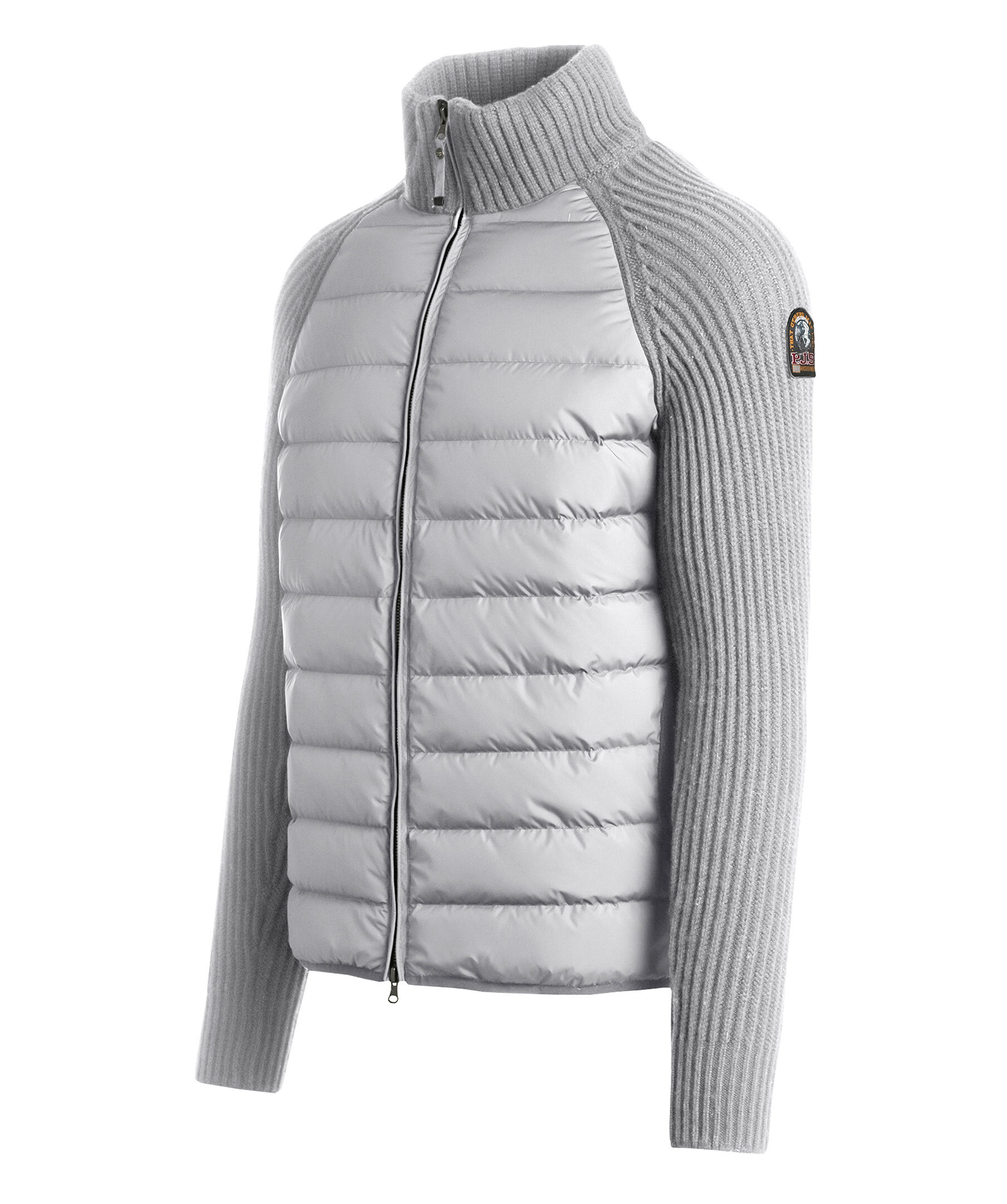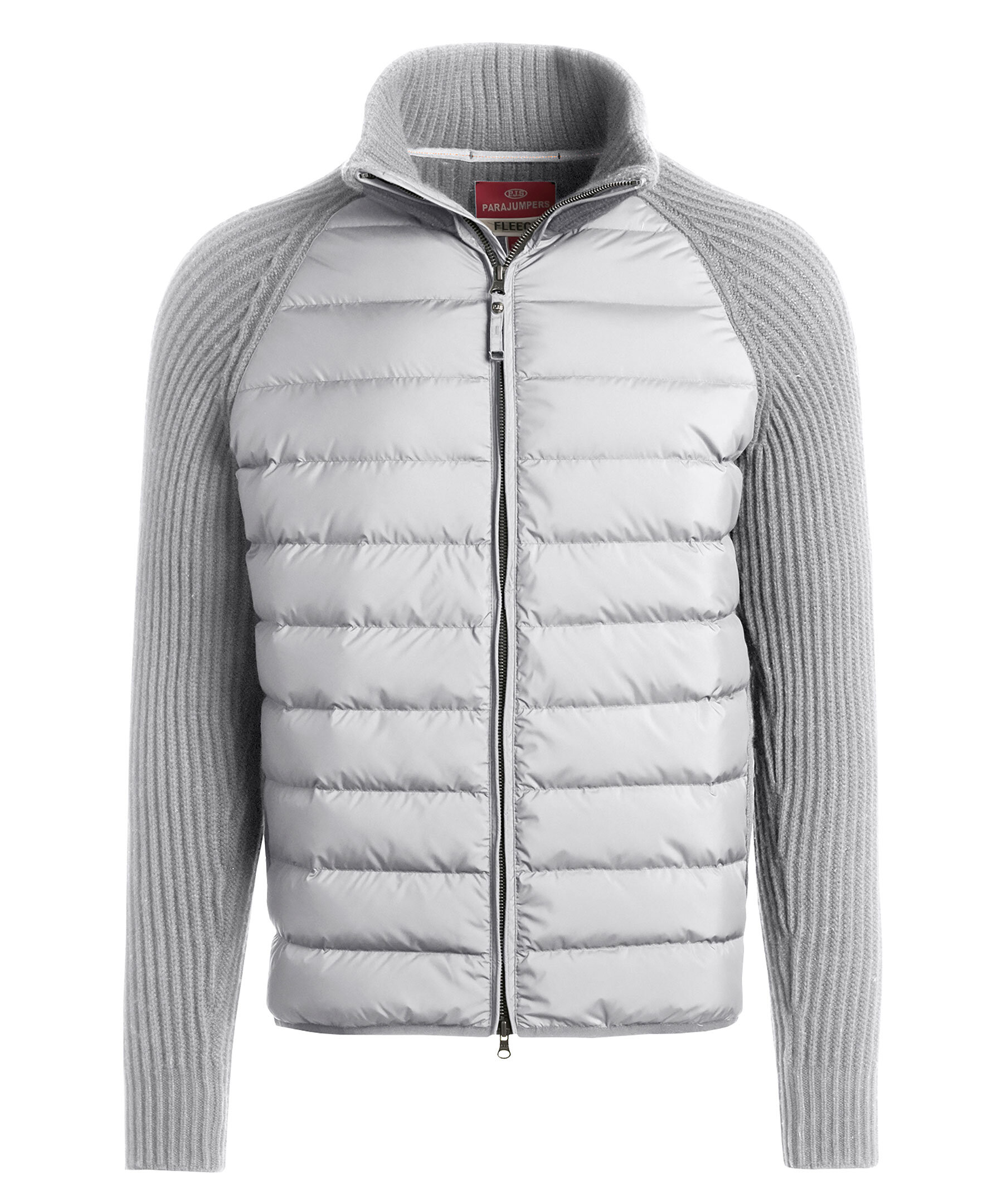 Ljusgrå hybridjacka med dunfyllning och ribbade ärmar i ull från Parajumpers. Kan vara både en jacka och en tröja, vilket gör den extra mångsidig. Tvåvägsdragkedja, två fickor och vadderad framsida med dunfyllning. Ikonisk detalj, patchen på vänster ärm och har en hög krage.