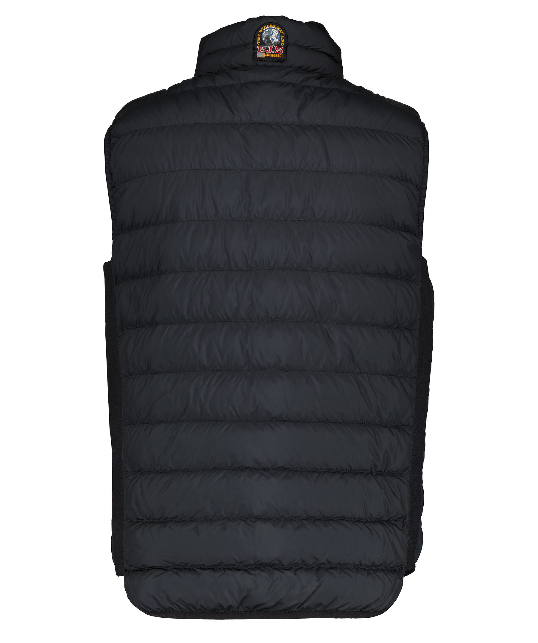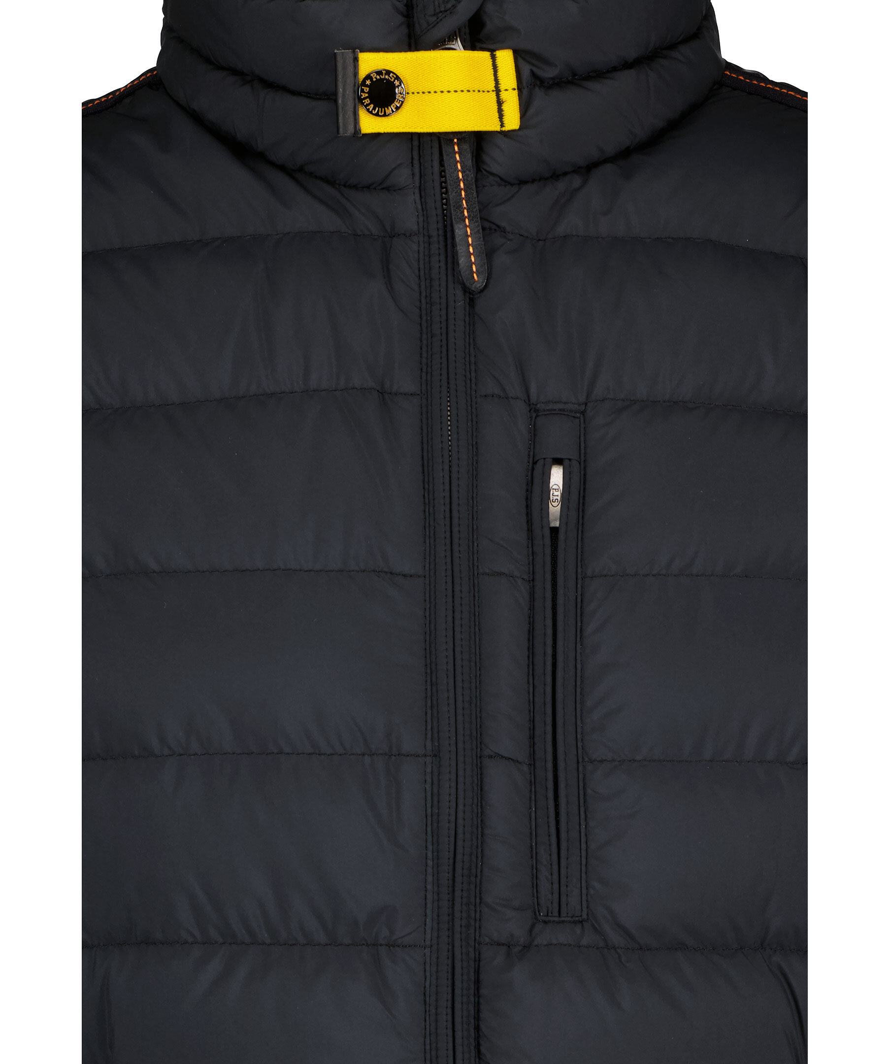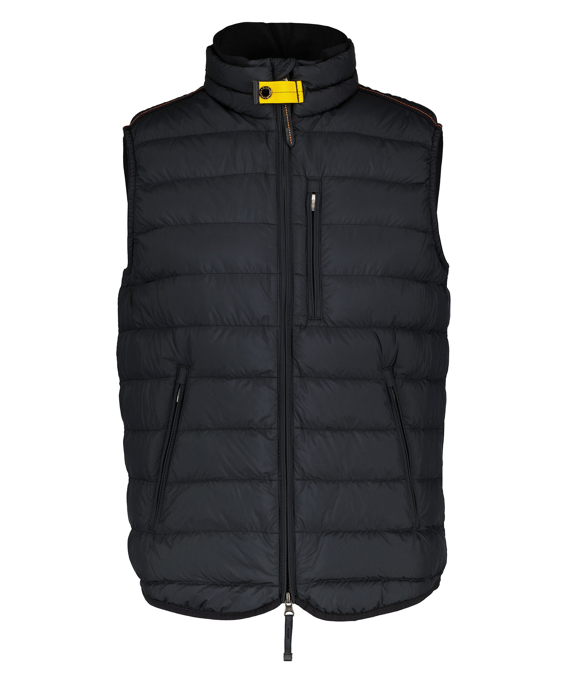 Svart, lättviktsdunväst från Parajumpers. Ribbstickad resår på vardera sida och patch med logotyp i nacken. Stängs med en tvåvägsdragkedja fram och har en krage med en klassisk gul flärp som man kan knäppa med en tryckknapp över kragen. Två framfickor och en bröstficka som alla stängs med dragkedja samt en innerficka som stängs med kardborreband.