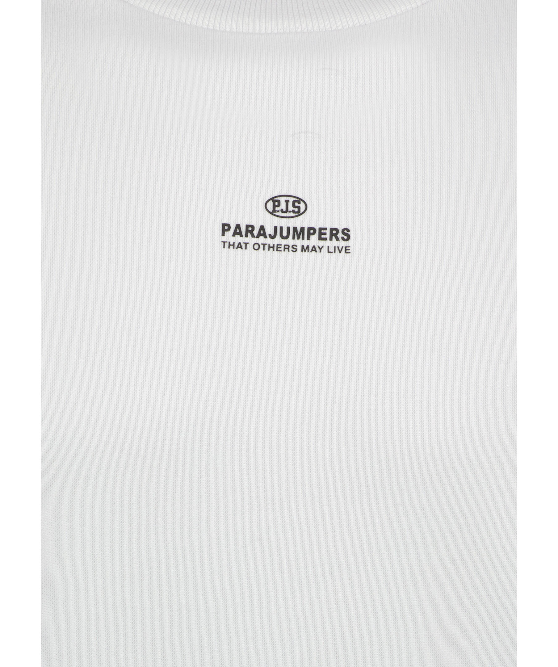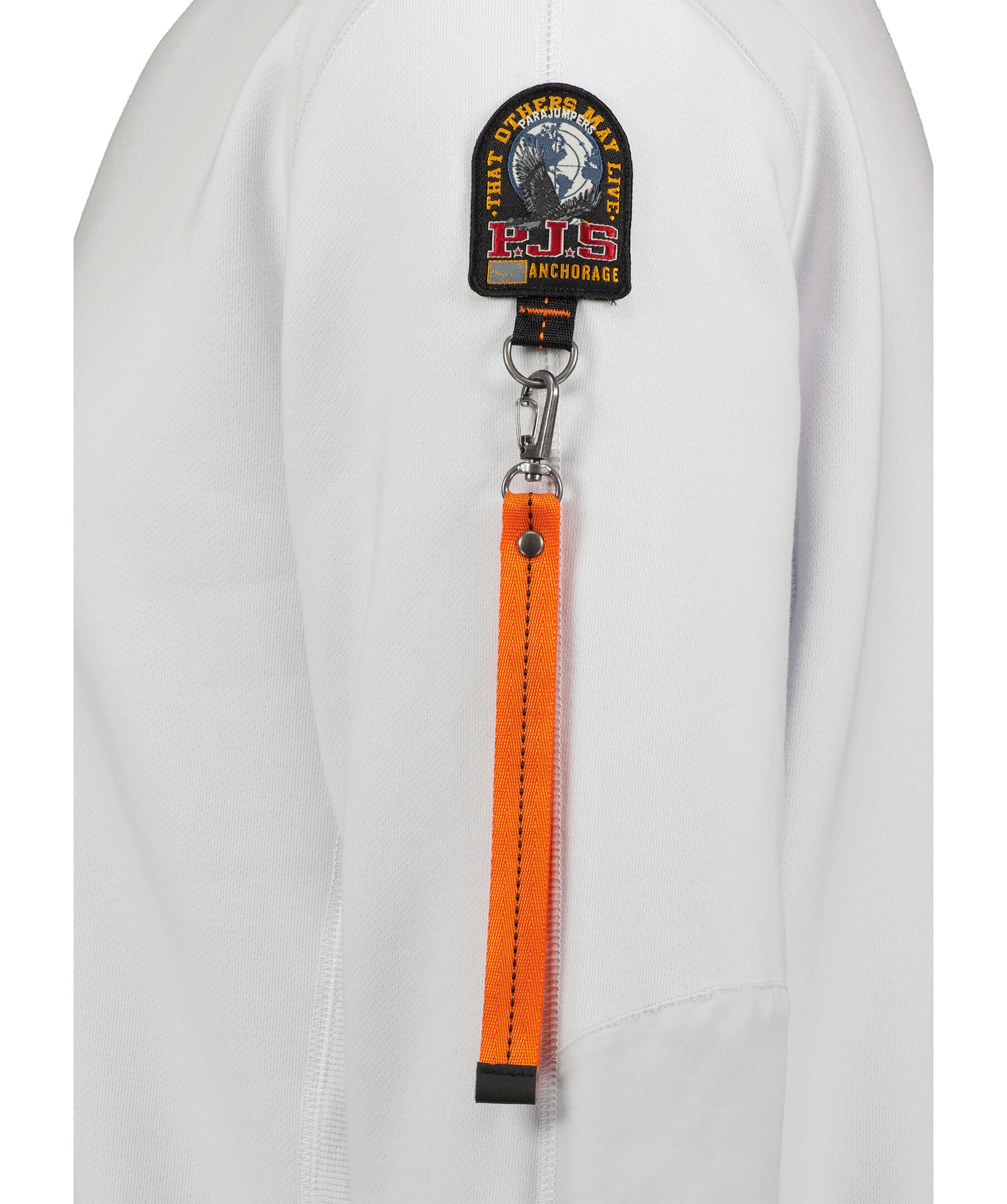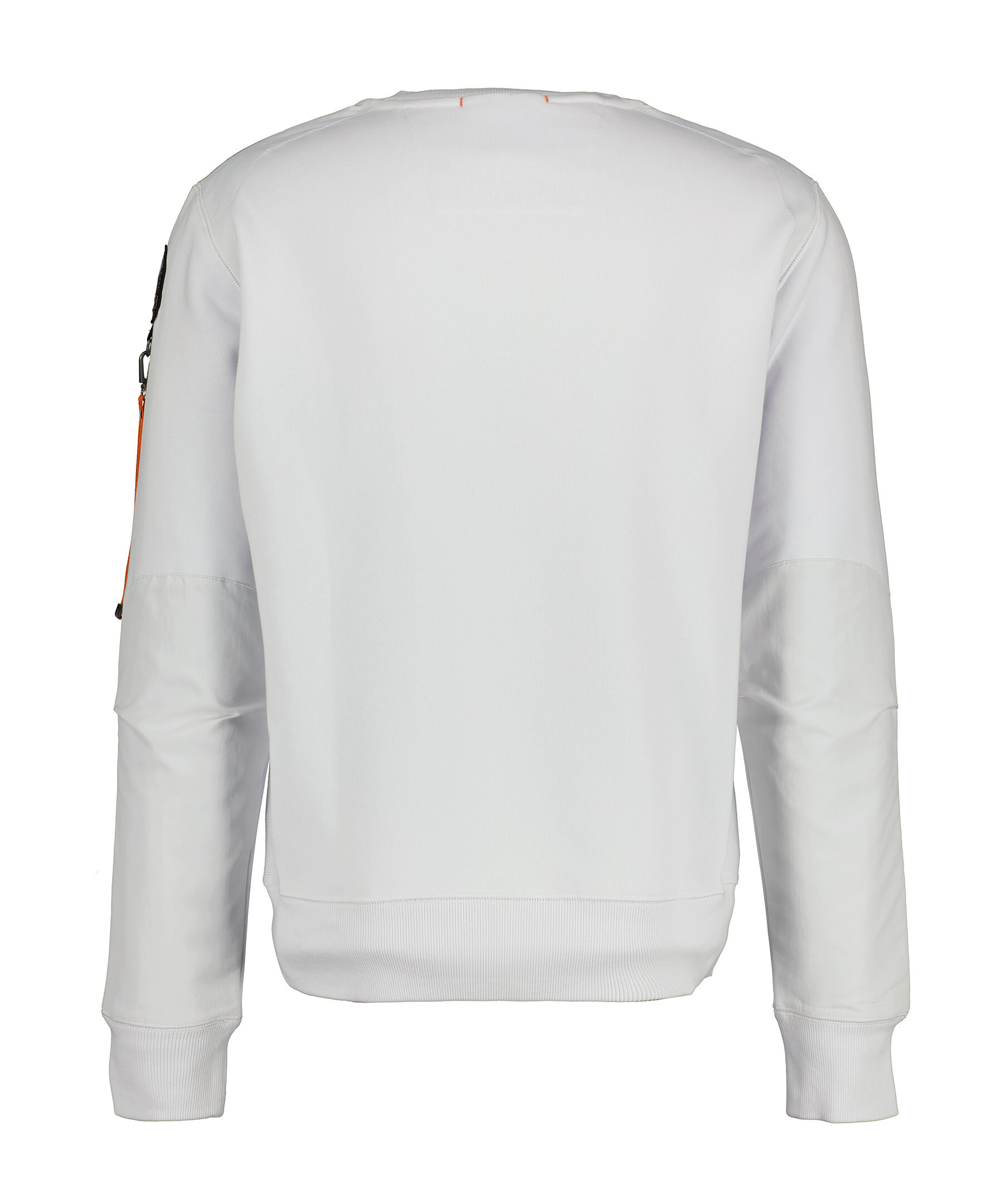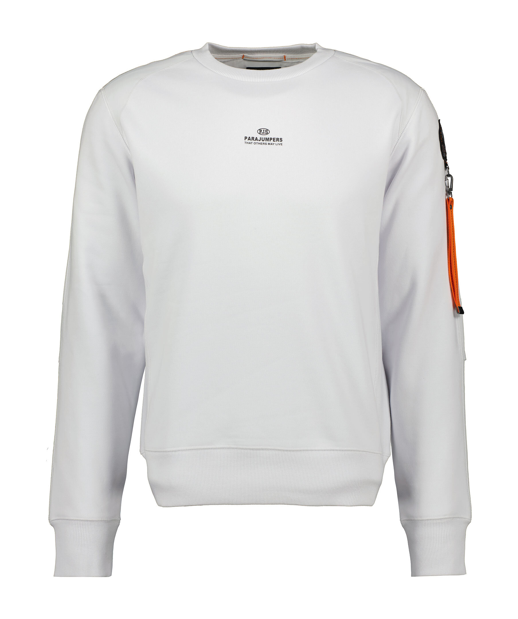 Ljusgrå sweatshirt från Parajumpers. Tröjan har ribbstickad och rund halsringning samt ribbstickade muddar vid ärm- och plaggslut. Svart liten logotyp mitt på bröstet, orangea sömmar på axlarna samt patch-logotyp på vänster ärm med orange karbinhake. Tillverkad i en bomullblandning.