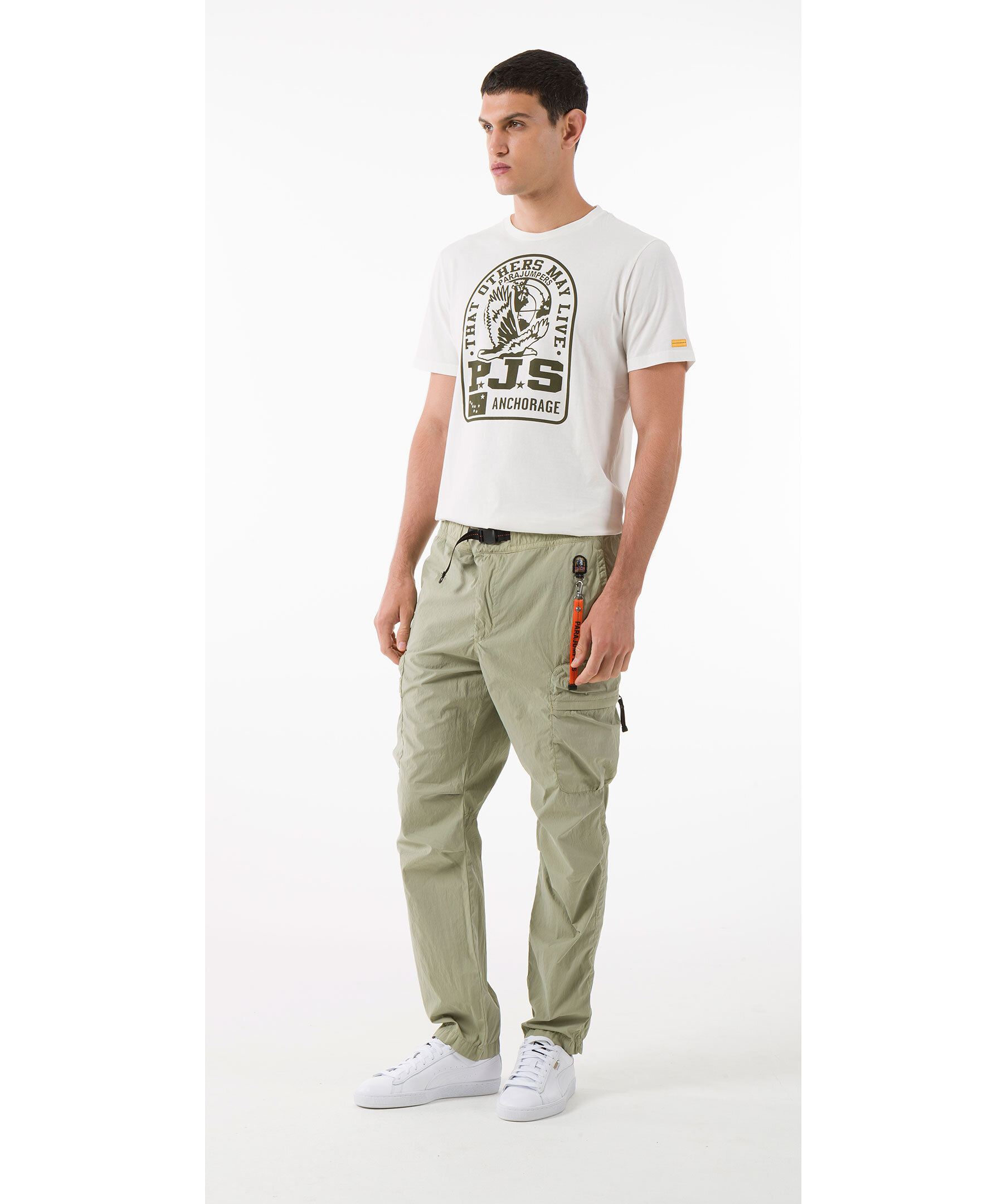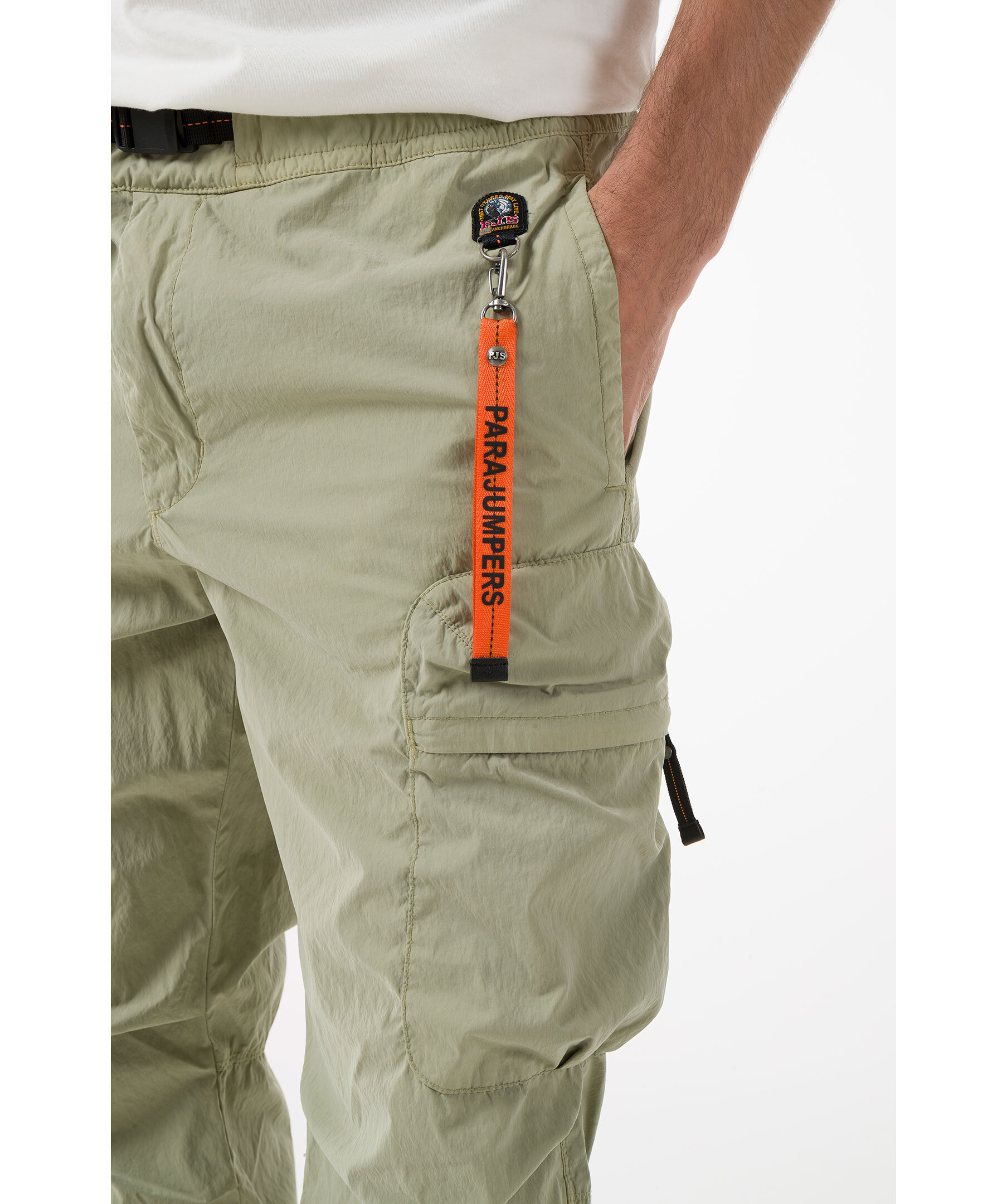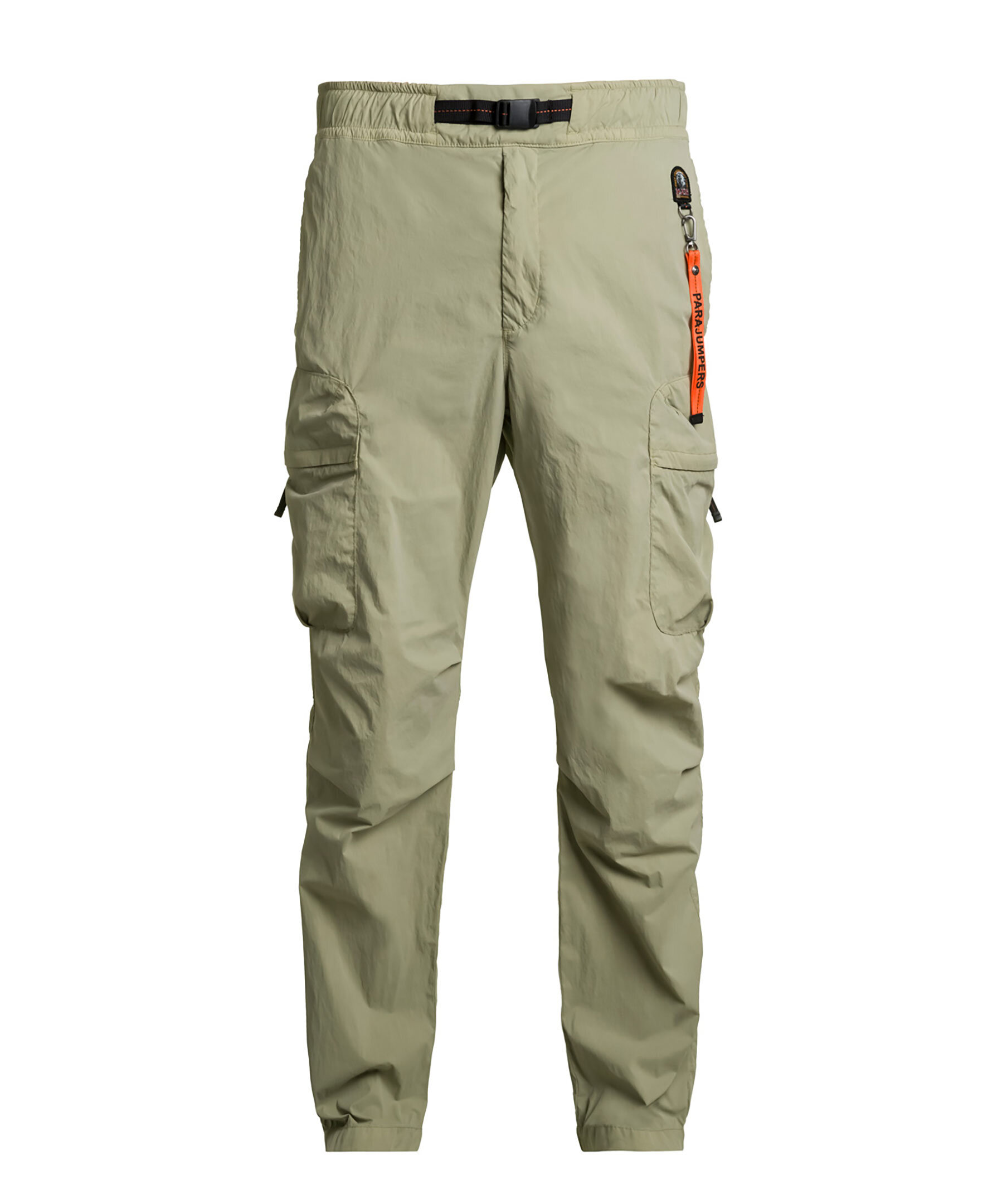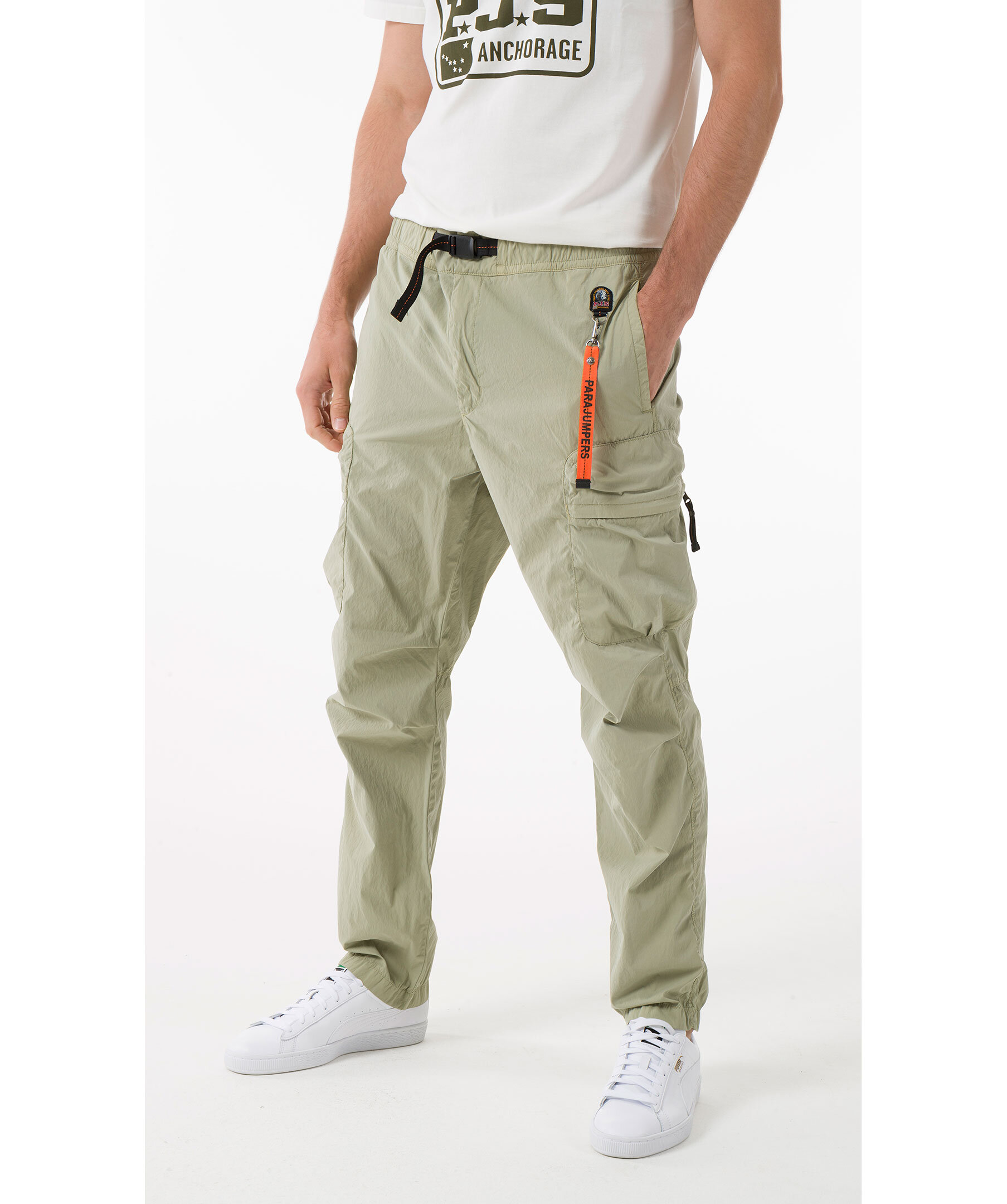 Ljusa gröna cargo byxor från Parajumpers. Resår och justerbart bälte i midjan. Två fickor i sidorna, två fickor som stängs med dragkedja. patch och rem i orange, med hake och logotyp.