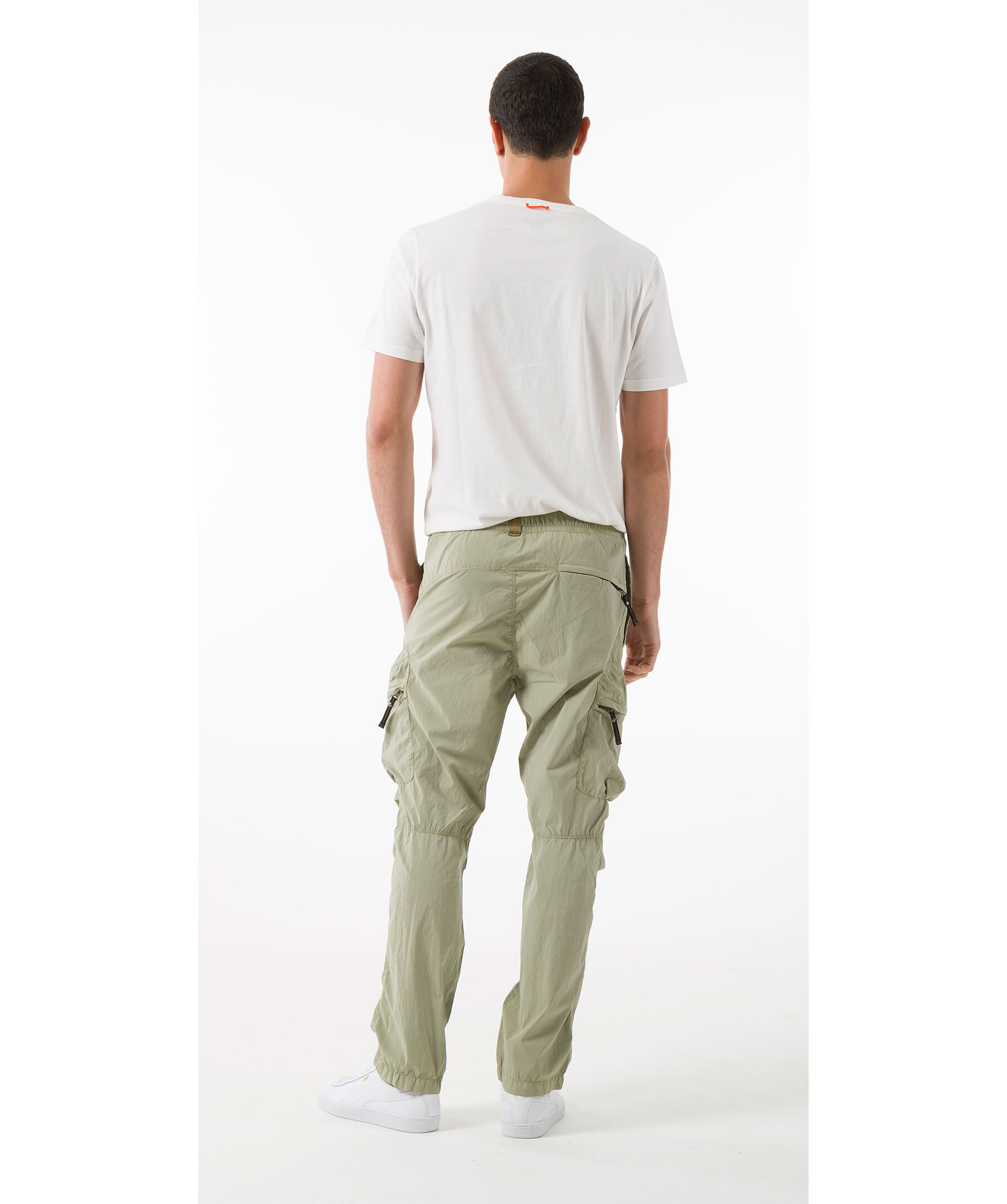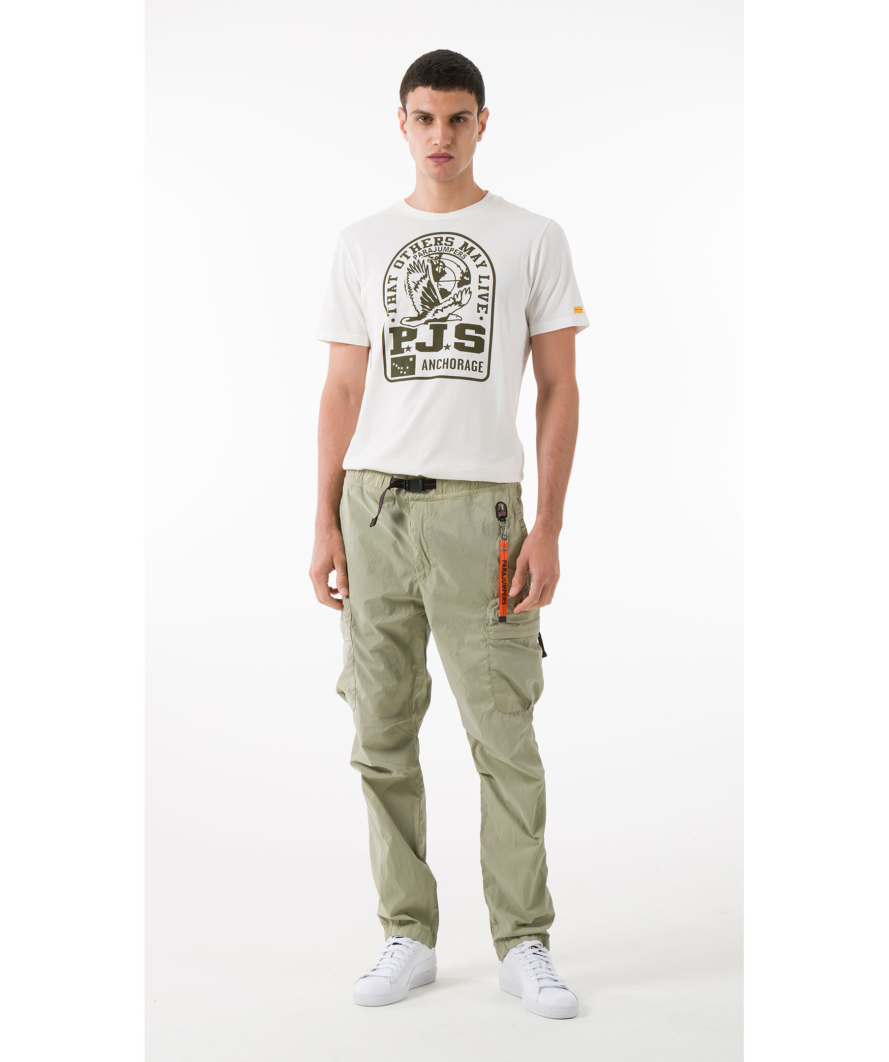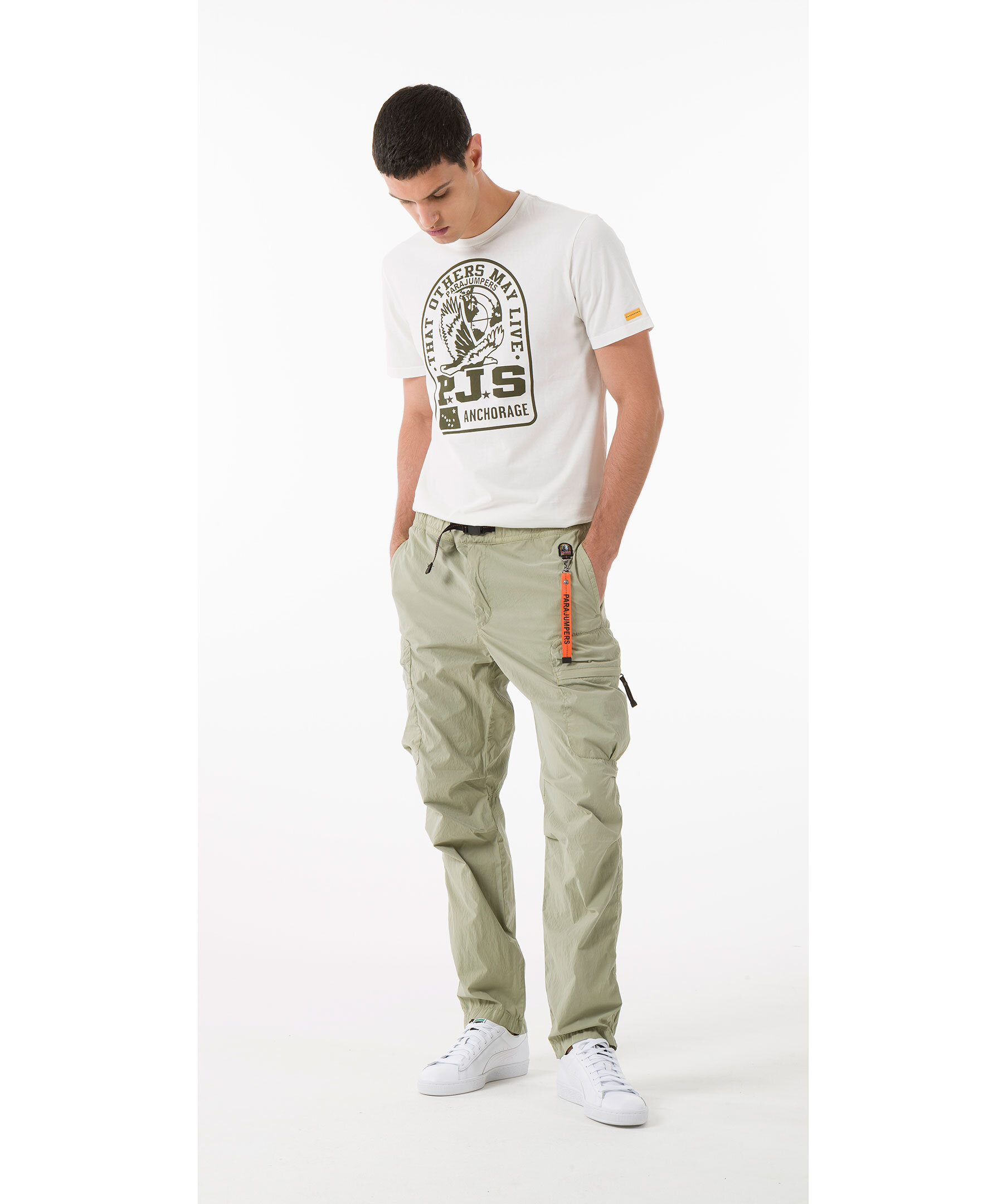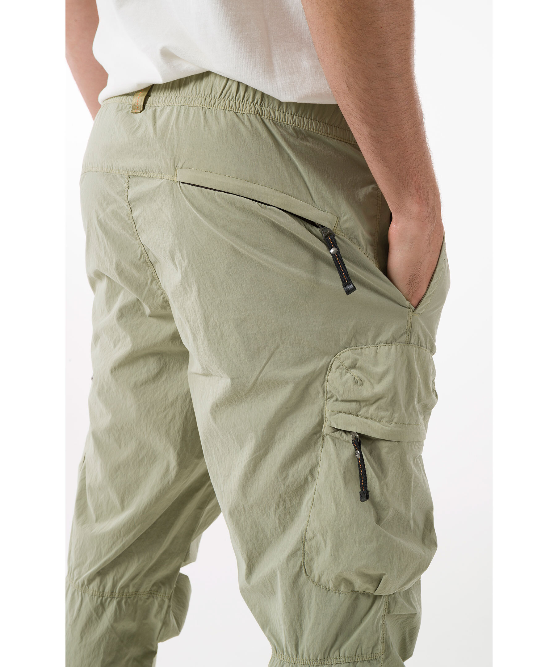 Ljusa gröna cargo byxor från Parajumpers. Resår och justerbart bälte i midjan. Två fickor i sidorna, två fickor som stängs med dragkedja. patch och rem i orange, med hake och logotyp.