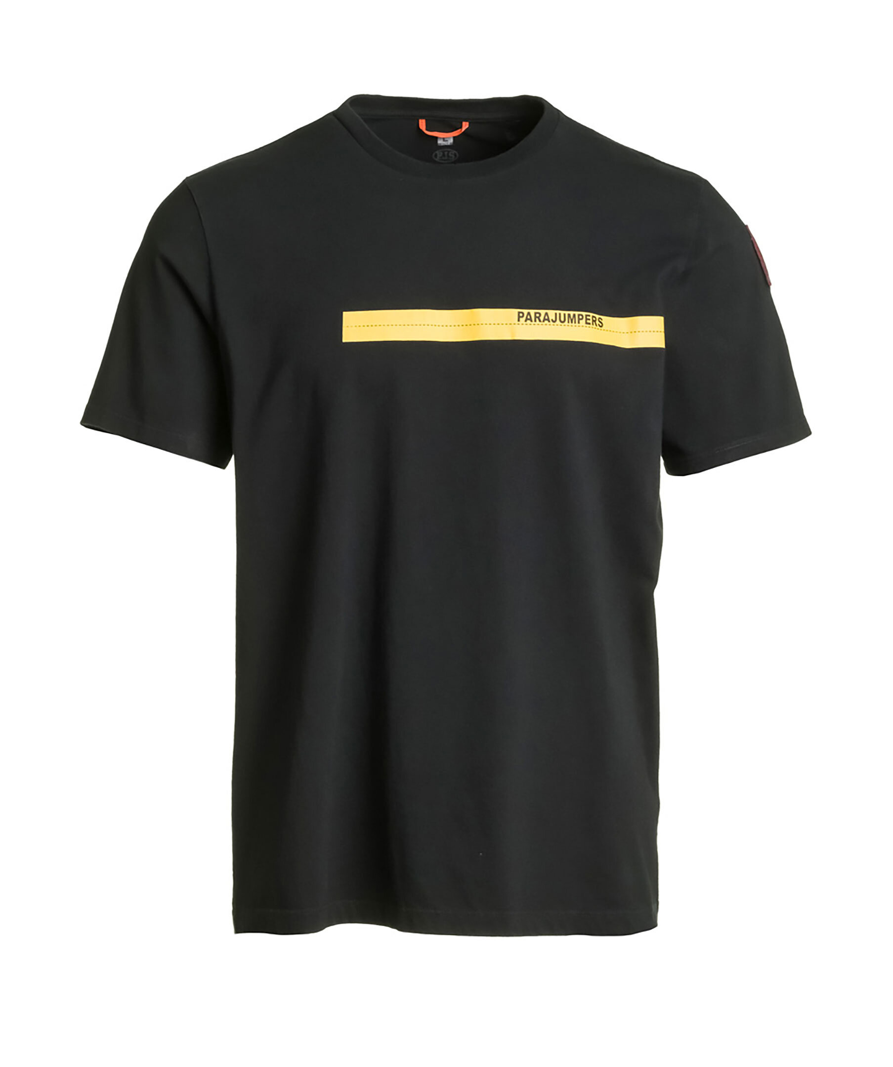 Svart T-shirt från Parajumpers. Rundad halsringning. Tryckt logotyp på vänster bröst i gult. Tillverkad i 100% bomull.