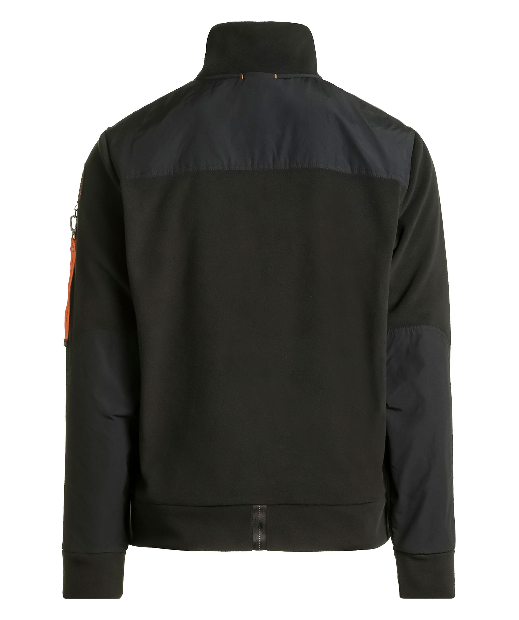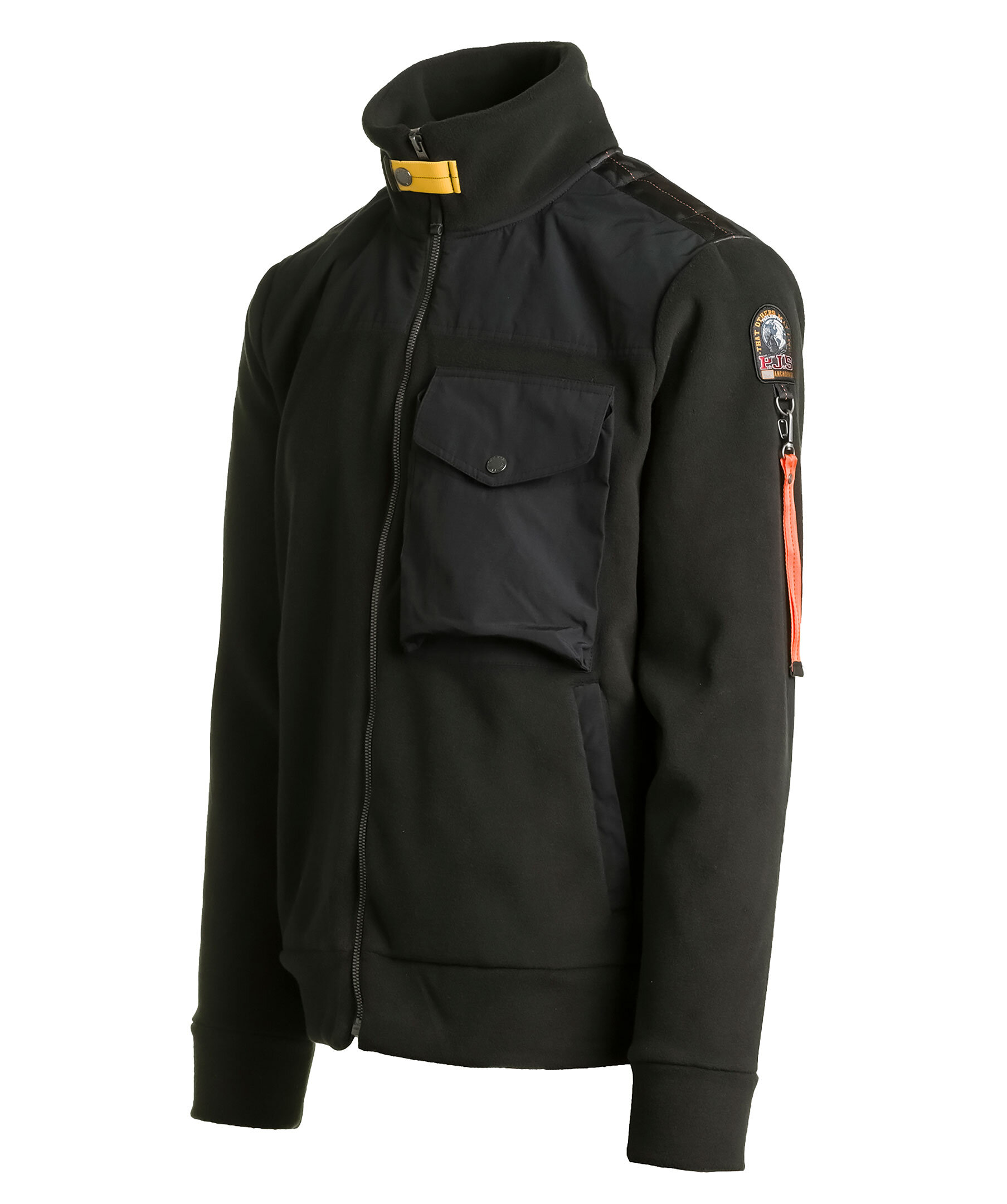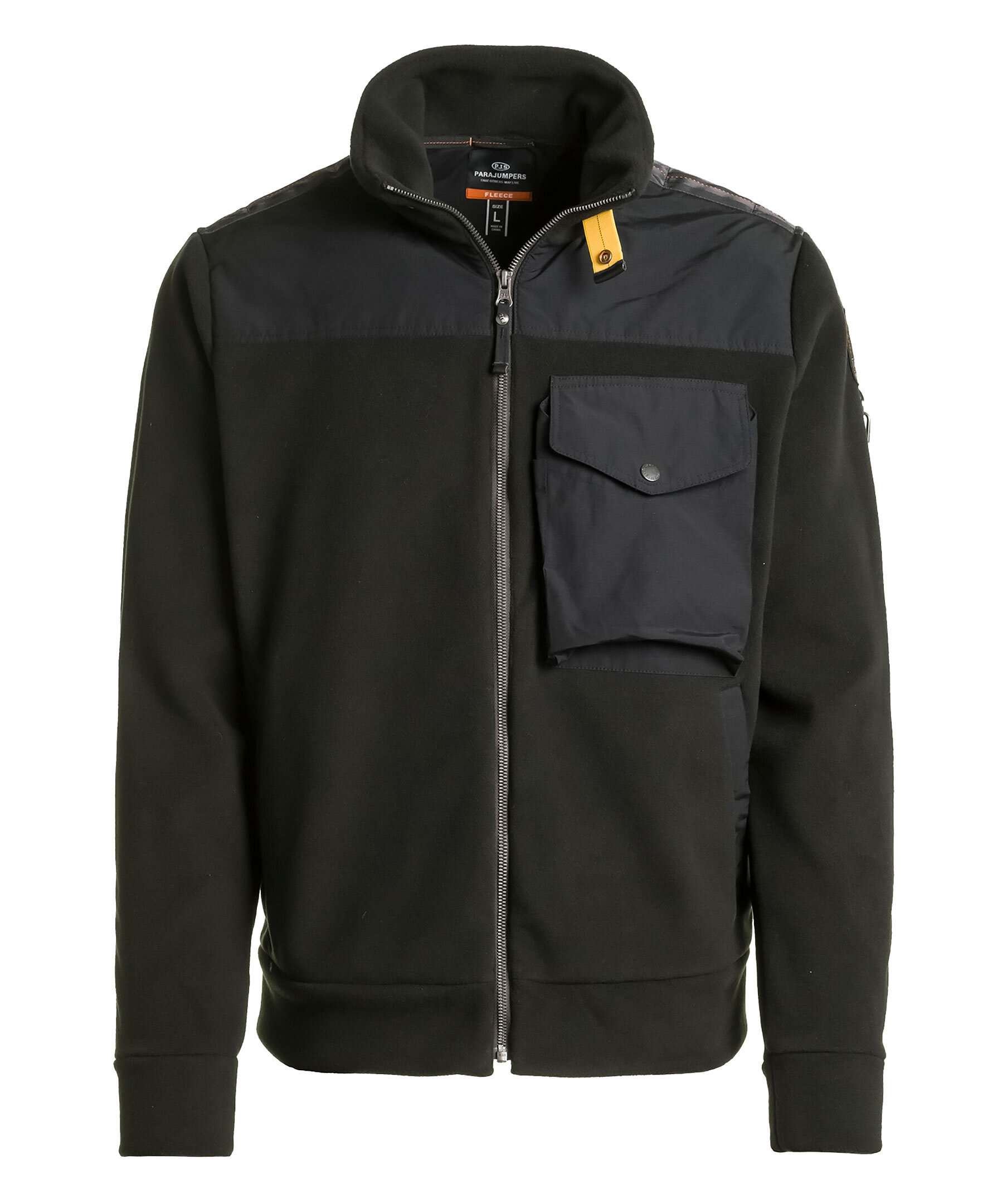 Svart fleecetröja med dragkedja fram från Parajumpers. En bröstficka med ficklock och tryckknapp och två framfickor. Den har de ikoniska detaljerna som den gula lappen vid kragen och den orange avtagbara nyckelringen på ärmen. Kontrasttyg på axlar, ärmpatchar och bröstficka.