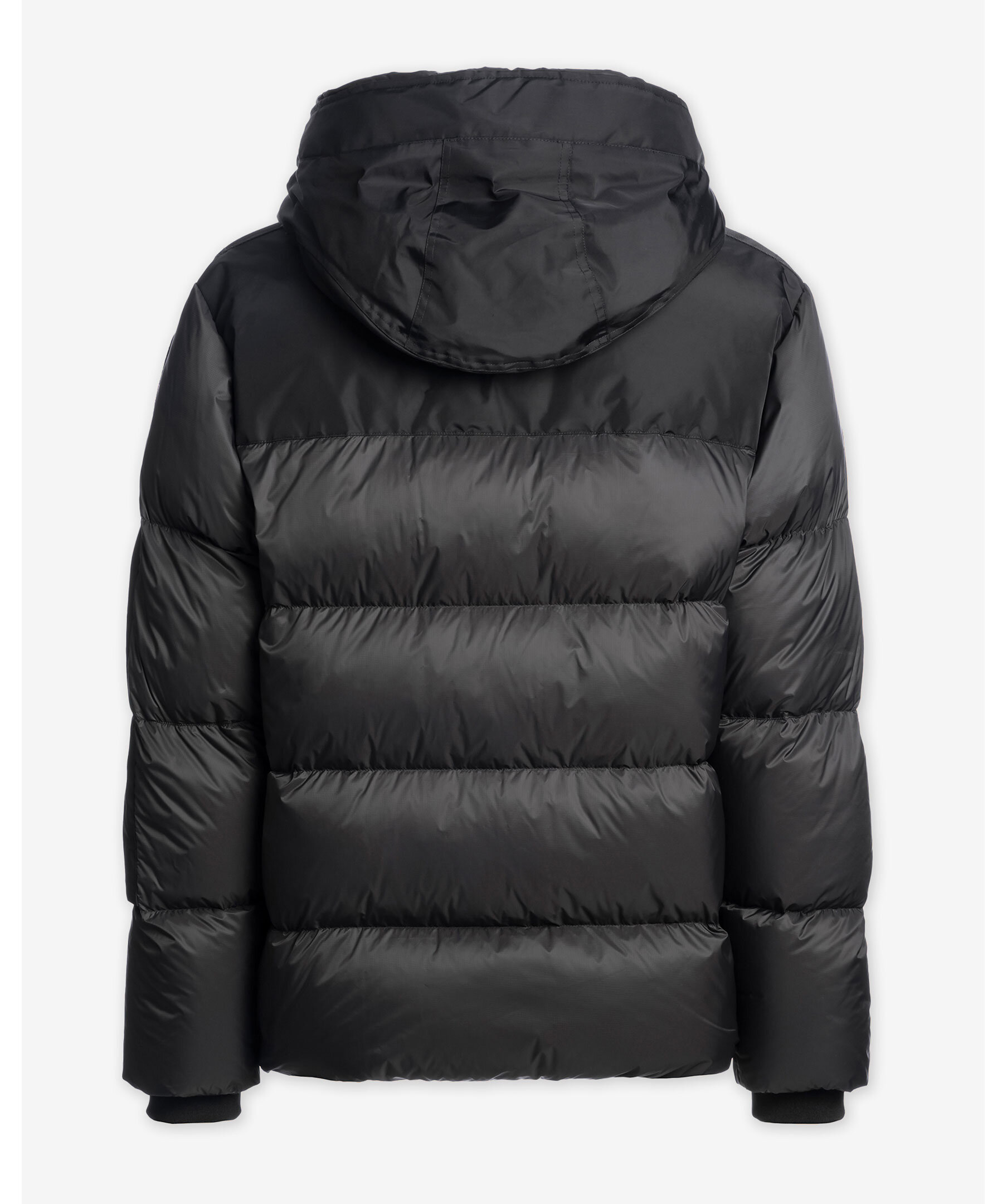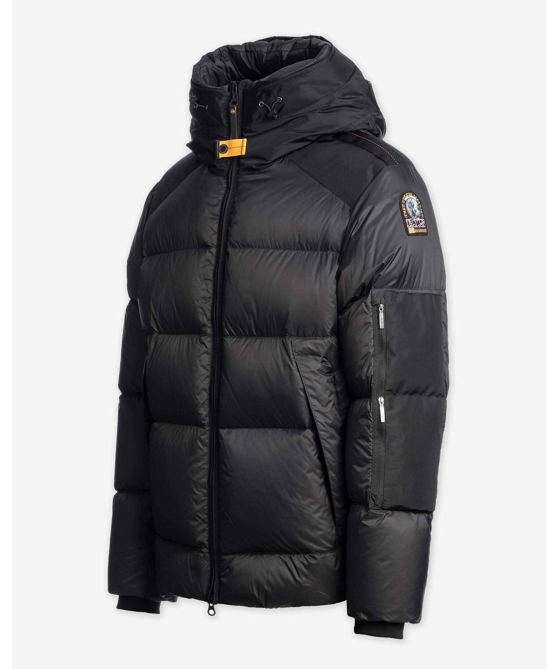 Svart pufferjacka från Parajumpers. Jackan stängs med tvåvägsdragkedja och har huva med dragsko, två sidfickor med dold dragkedja samt två fickor med dragkedja på vänster ärm och patch-logotyp på vänster ärm. Tillverkad i polyamid med dunfyllning. Vind- och vattentät med 10 000 mm vattenpelare samt andas med en MVP på 10 000 – perfekt för skydd i måttligt regn.