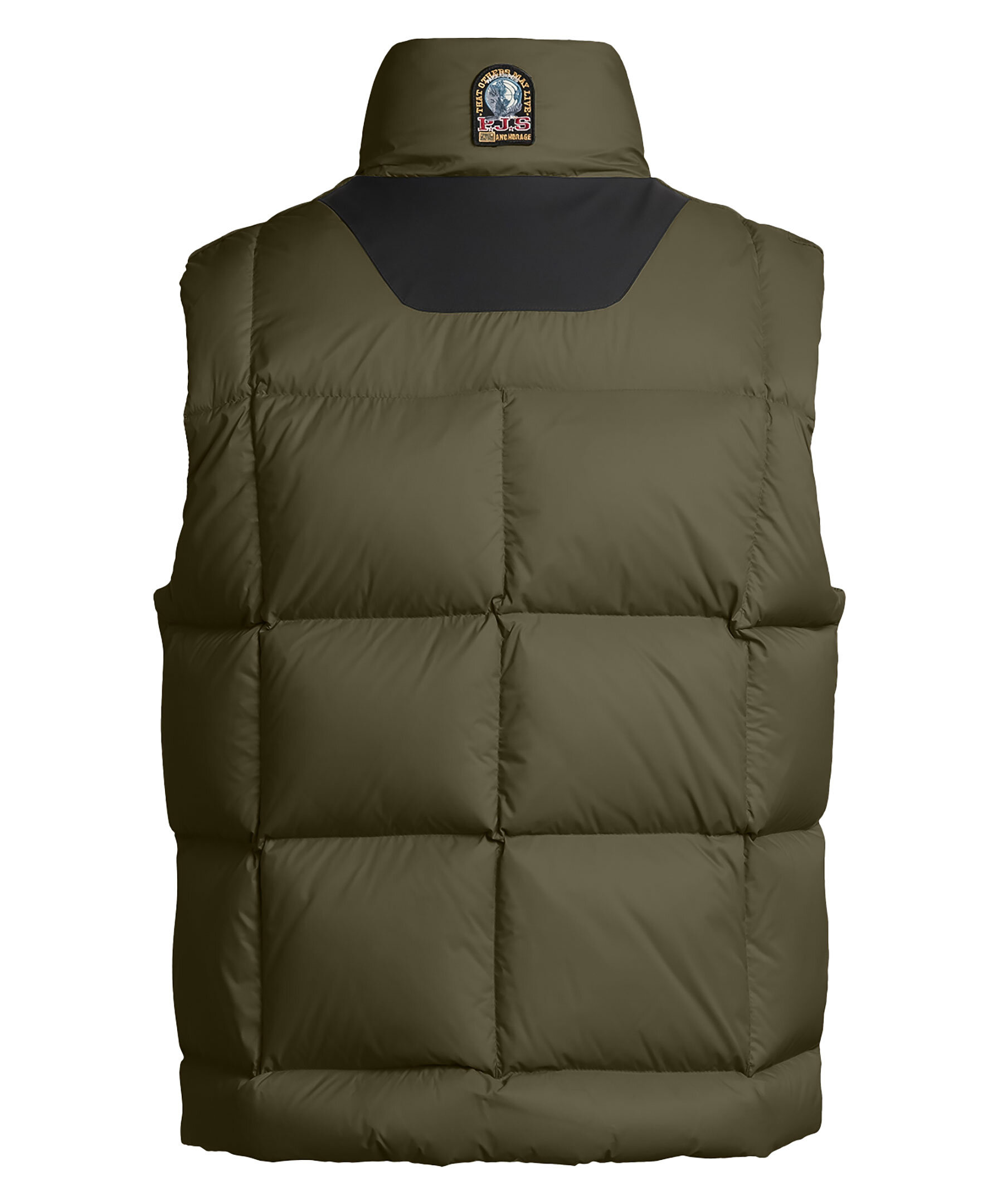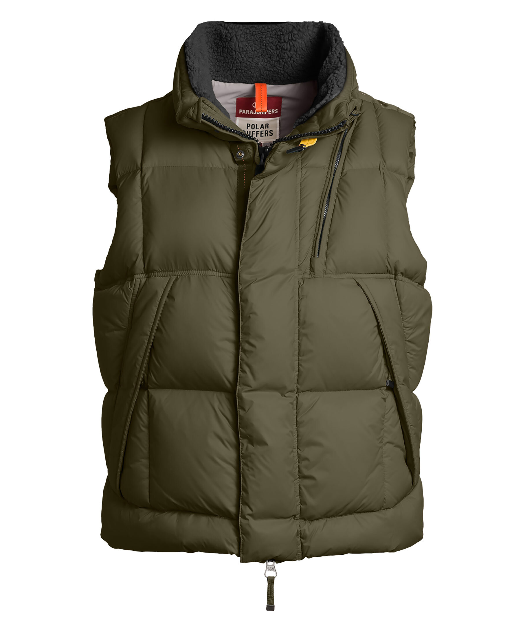 Olivgrön dunväst i puffermodell från Parajumpers. Gjord i nylon med vattenavvisande behandling. Västen har en sherpa fodrad krage och en tvåvägsdragkedja med en gul stormklaff som knäpps upp med tryckknapp. Tre fickor fram, samt två innerfickor; en nätficka och en med dragkedja. PJS-logotyptryck mitt i nacken. Dragsko vid västens ena sida nertill. Med ett vattenavvisande Cordura-skal är denna väst den varmaste men lättaste i sitt slag. Wilbur är en oversize pufferväst för extrema väderförhållanden.