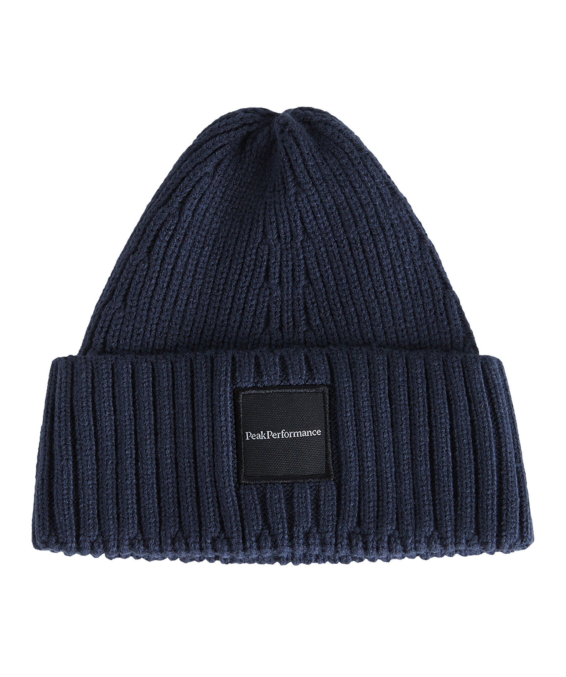 Marinblå, ribbstickad mössa med vikt kant från Peak Performance. Ribbstickad med vikt fåll och Peak Performance-etikett mitt fram.