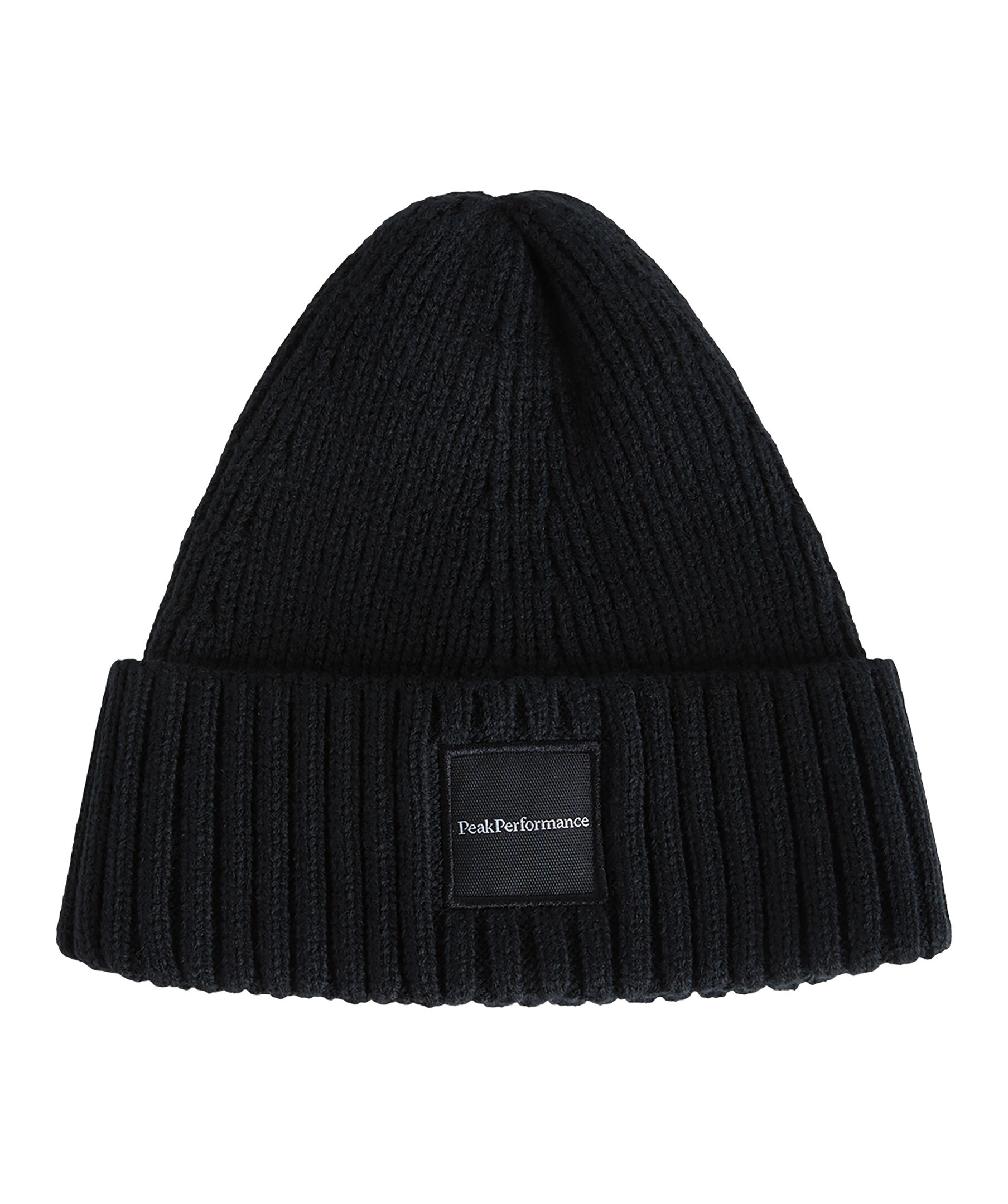 Svart, ribbstickad mössa med vikt kant från Peak Performance. Ribbstickad med vikt fåll och Peak Performance-etikett mitt fram.