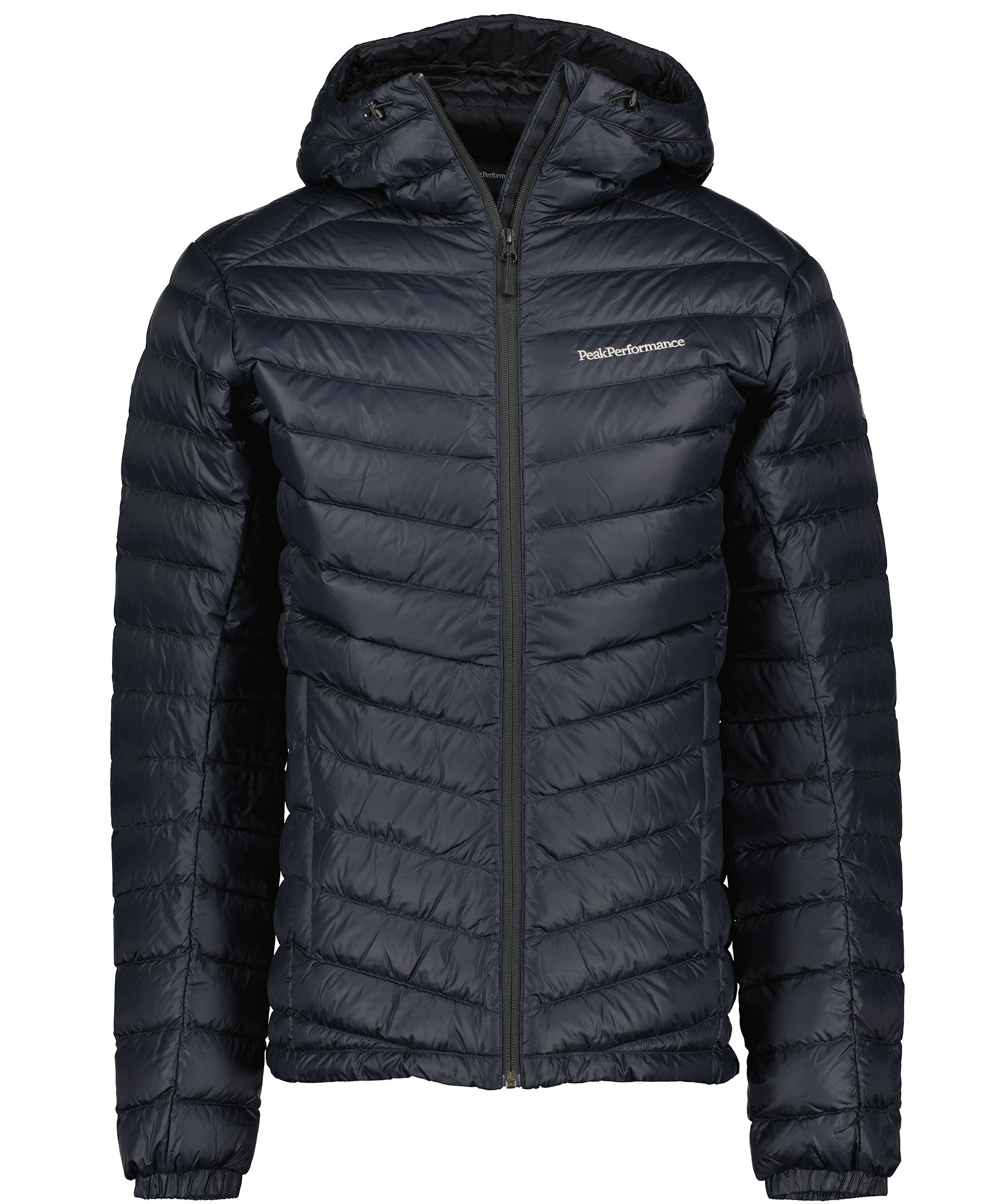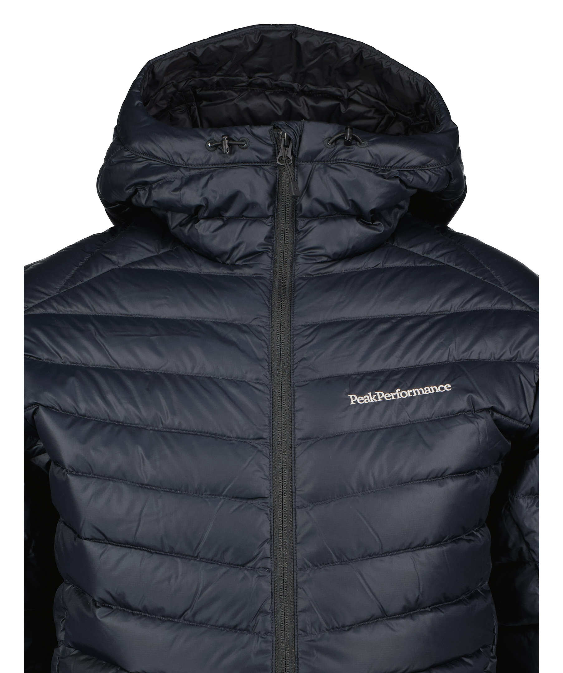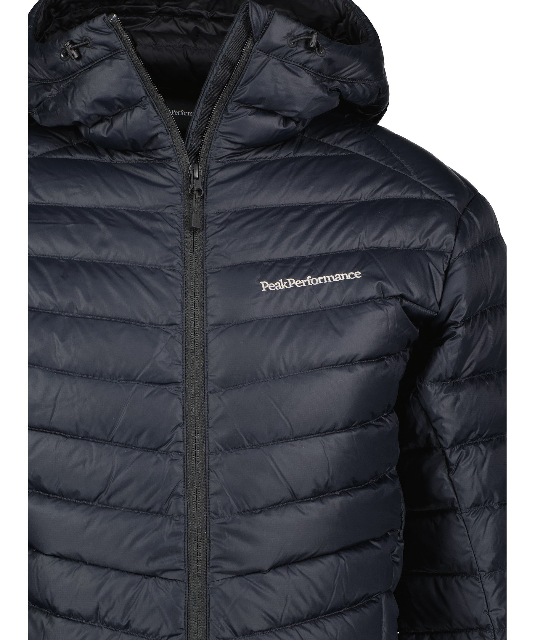 Svart lättviktsdunjacka från Peak Performance. Flourocarbon-fri DWR impregnering. Stängs framtill med dragkedja. Två framfickor och innerficka med dragkedja. Dragsko i luvan och vid plaggslut. Elastiska muddar i ärmslut. Logotyp på bröstet och vänster ärm.