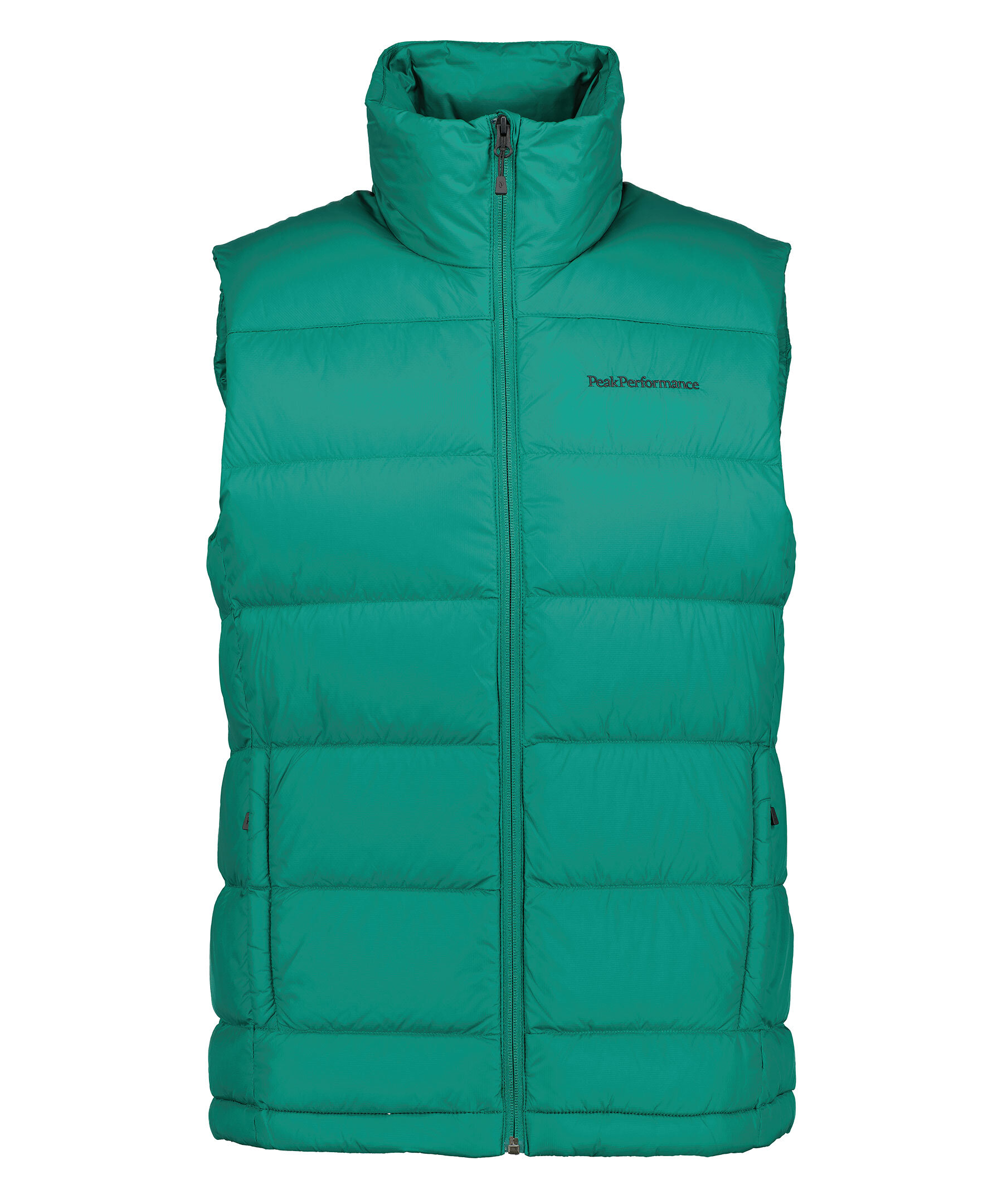 Grön quiltad dunväst från Peak Performance. Stängs framtill med dragkedja. Två fickor framtill som stängs med dragkedja. Innerficka som stängs med dragkedja. Broderad logotyp på vänster bröst. Broderad logotyp i nacken.