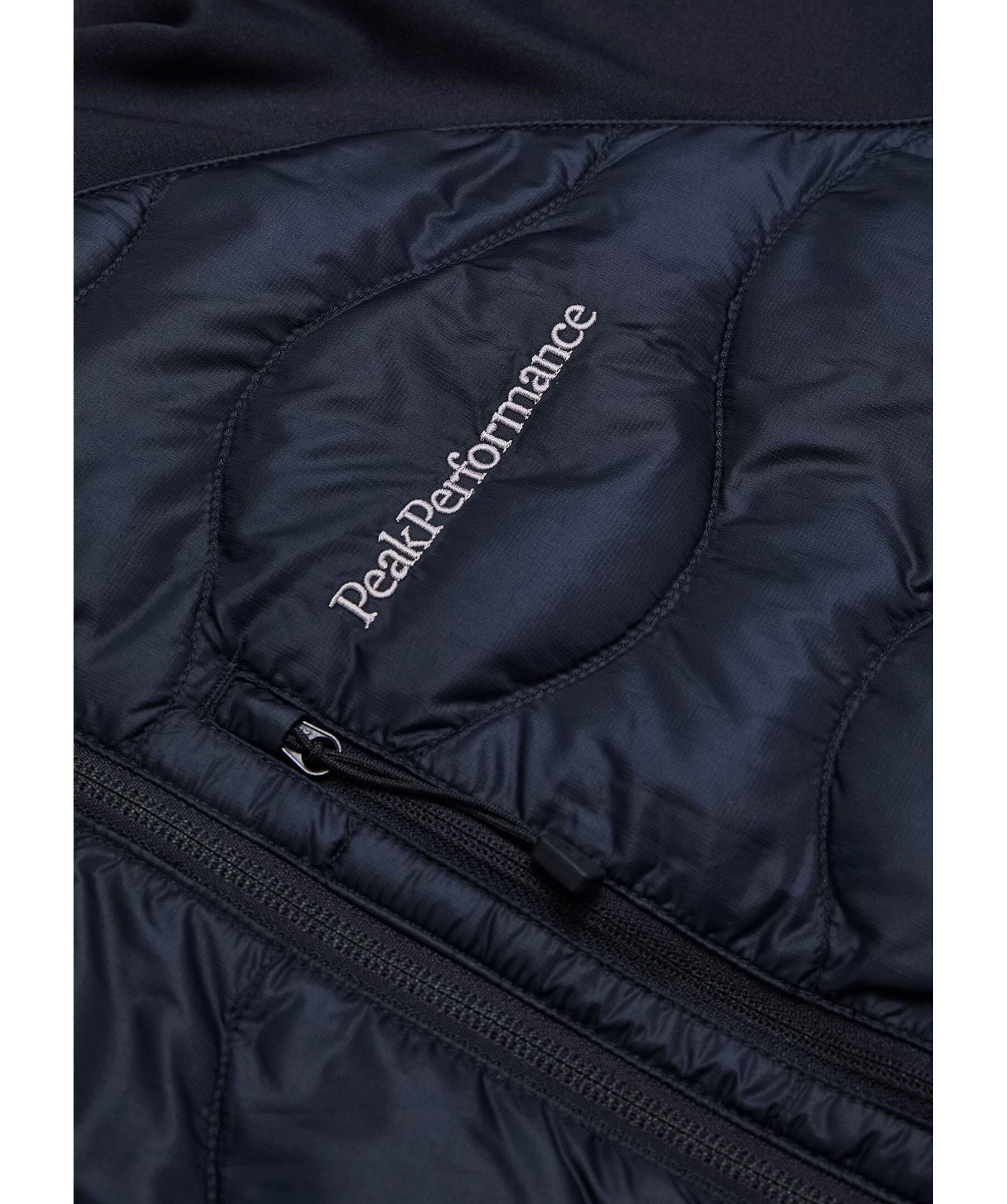 Svart hybridjacka från Peak Performance. Jackan stängs med dragkedja och har de ikoniska, quiltade mönstret, två öppna sidfickor, en bröstficka med dragkedja samt logotyp på bröstet och vänster ärm. Denna hybridjacka är extremt lätt och packbar med sidopaneler och ärmar i stretchjersey för rörelsefrihet. Huvudtyget är vind- och vattenavvisande i kombination med premium 90/10 dunisolering, och ger en jacka som trivs under utomhusaktiviteter.