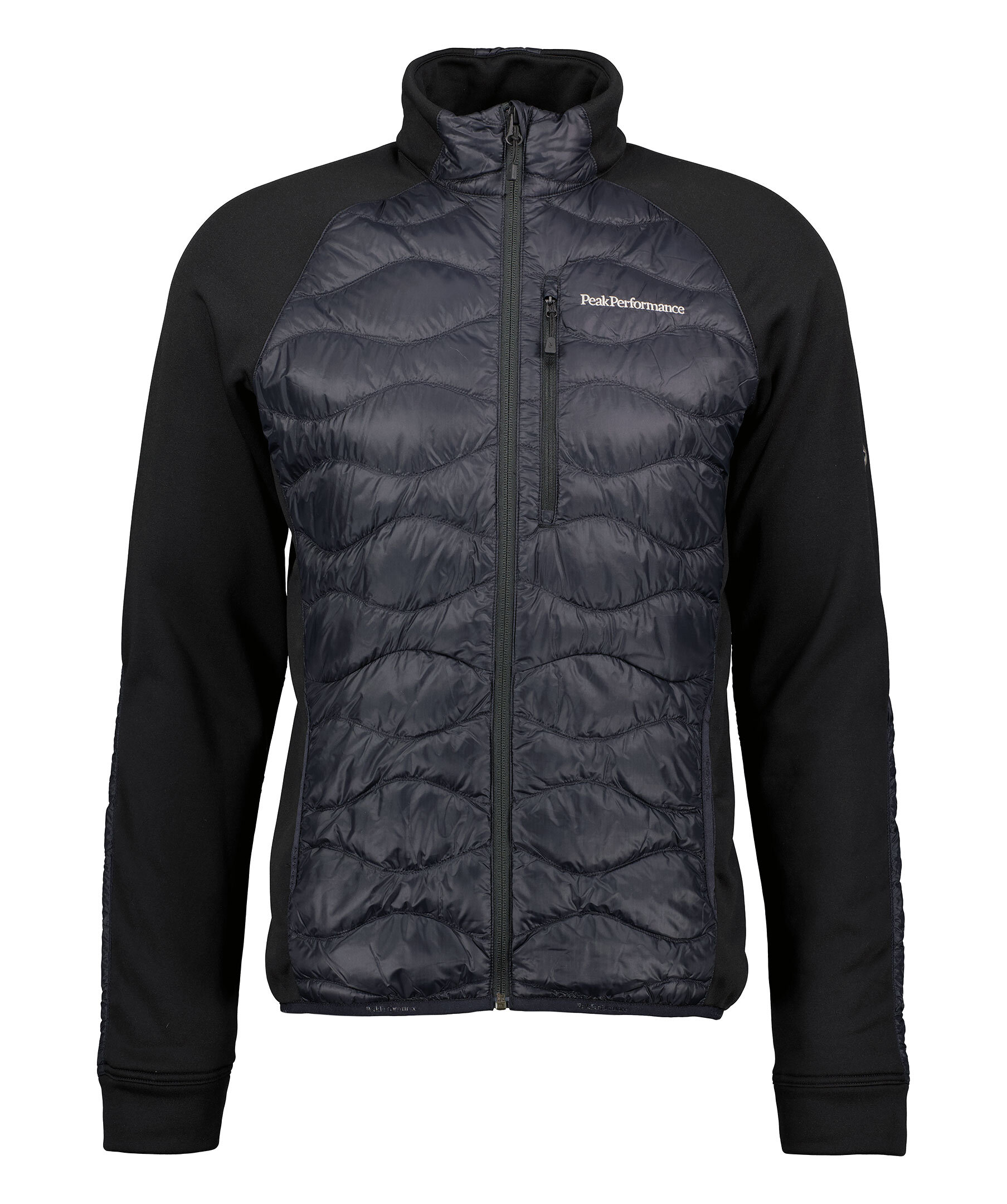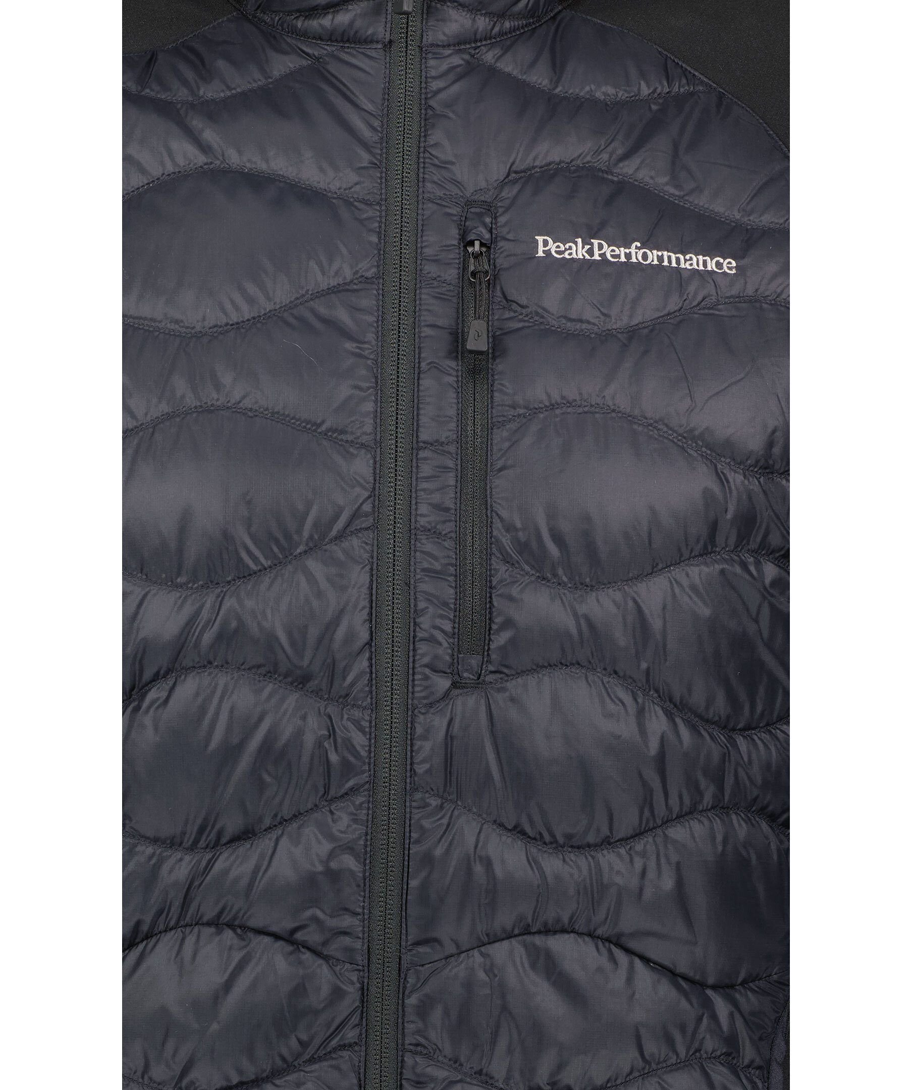 Svart hybridjacka med singtretchpaneler och luva från Peak Performance. Extremt lätt och packbar samt har vind- och vattenavvisande jersey paneler tillsammans med högkvalitativ 90/10-dunvaddering gör den perfekt för alla friluftsaktiviteter. Yttre upphängningsögla i nacken, elastisk bindning i nederkant och elastiska muddar i ärmslut. Hellång YKK reversed coil dragkedja fram, hakskydd, bröstficka med dragkedja, öppna handfickor, Peak Performance-brodyr på bröstet och P-logotyp brodyr på ärmen.