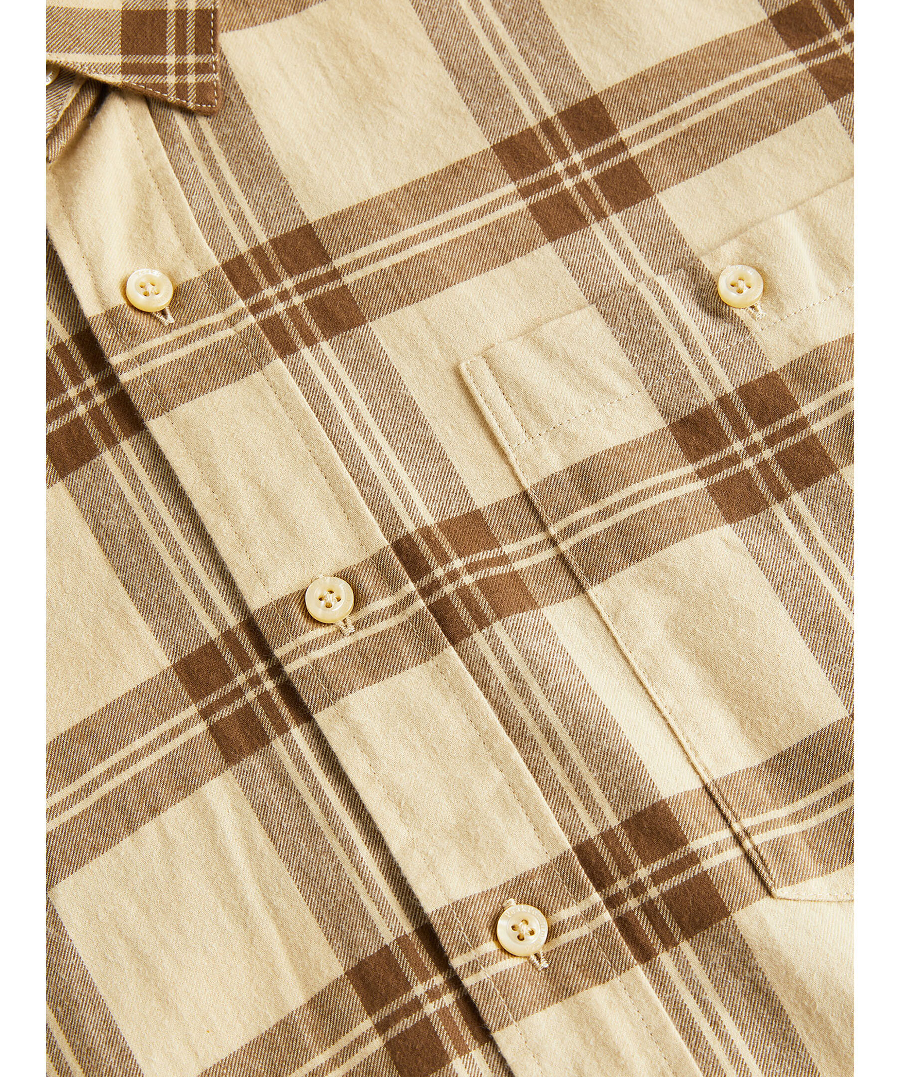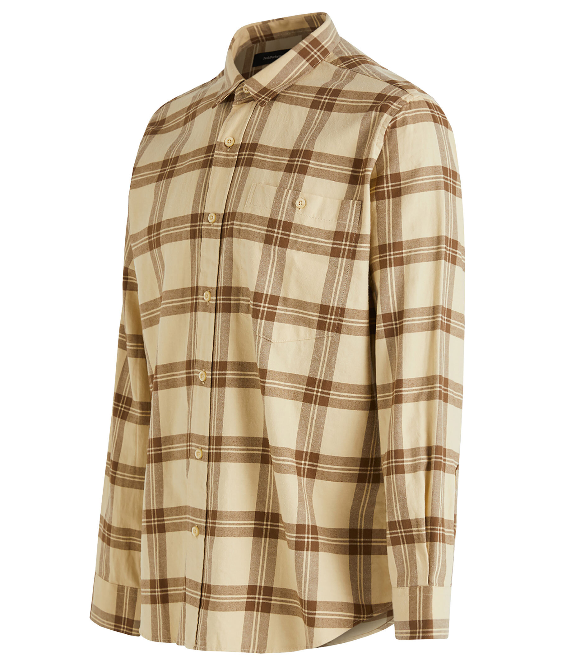 Beige och brun rutig skjorta från Peak Performance. Spetsig krage, Bröstficka på vänster sida som stängs med knapp. Enkla manschetter. Tillverkad i 100% Bomull.