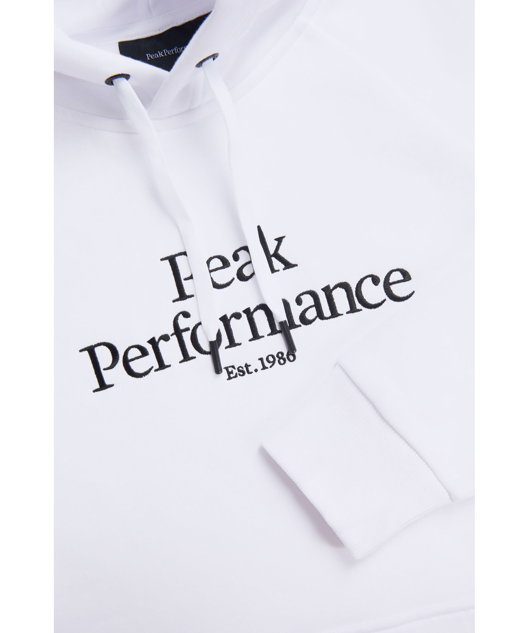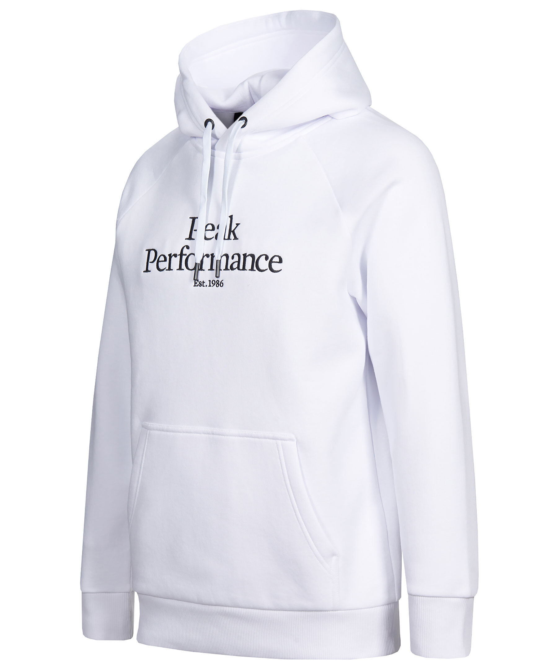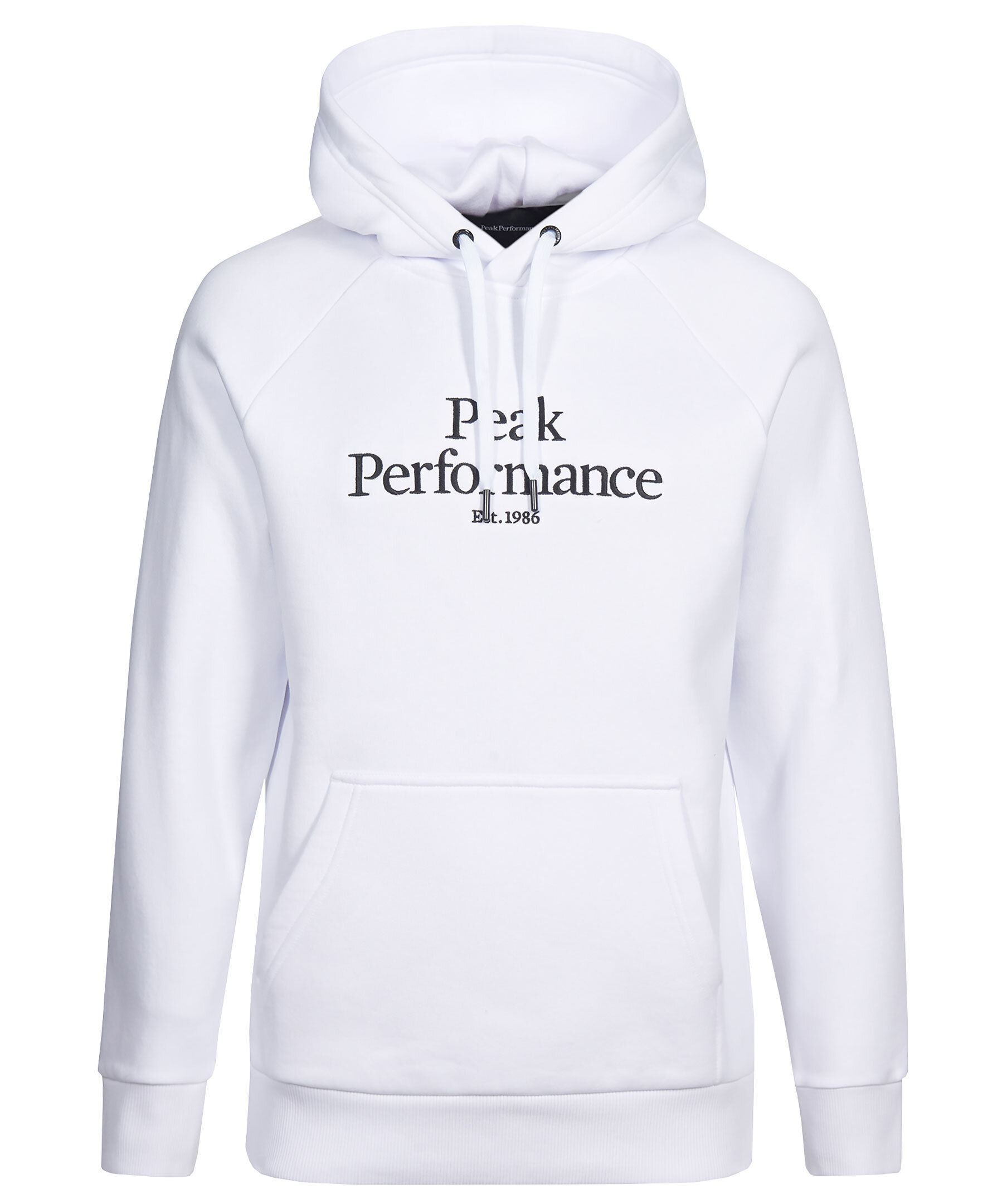 Vit hoodie med snörning i luvan från Peak Performance. Tillverkad i bomullsmix, har en broderad logga på bröstet, känguruficka och ribbade muddar.