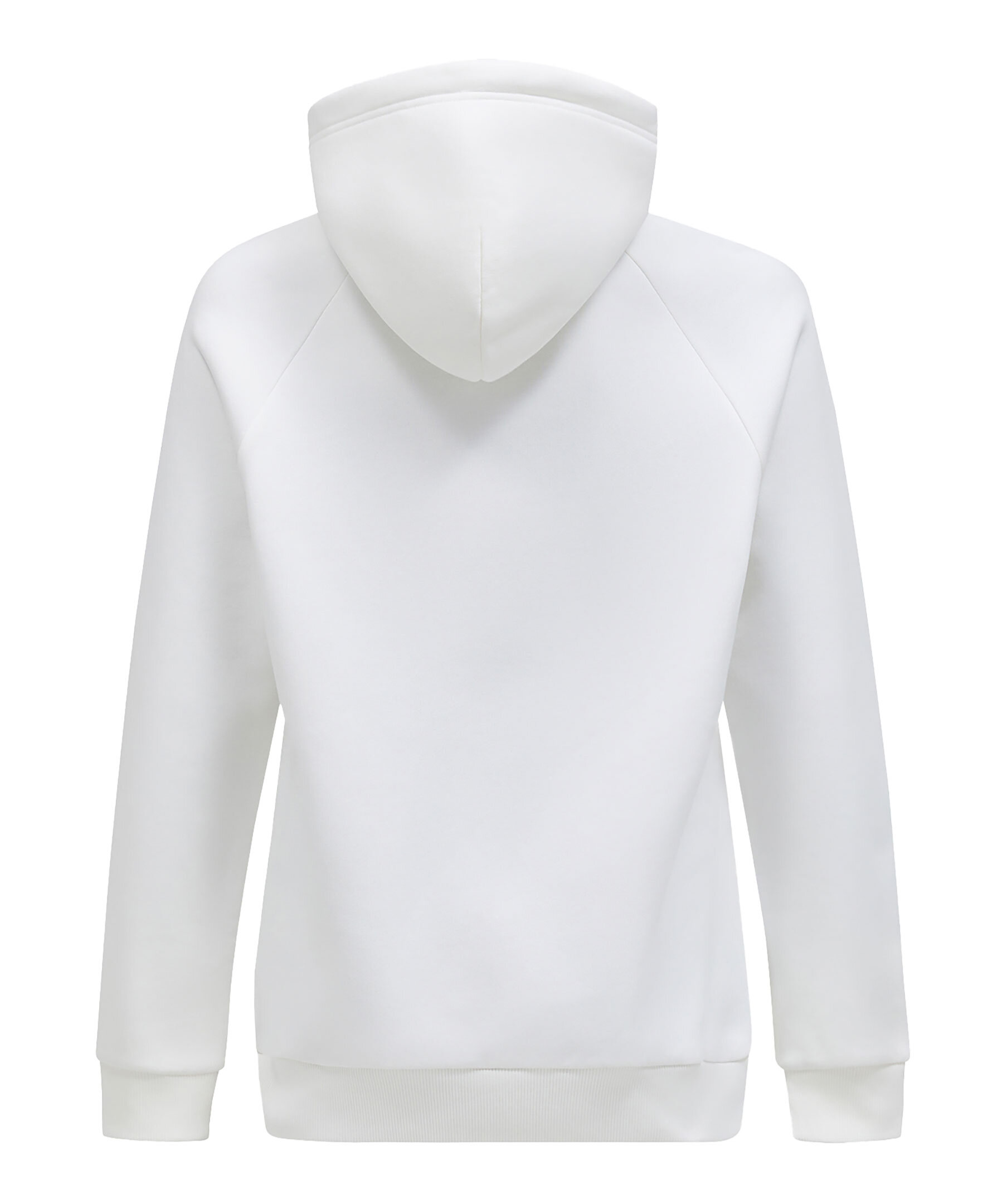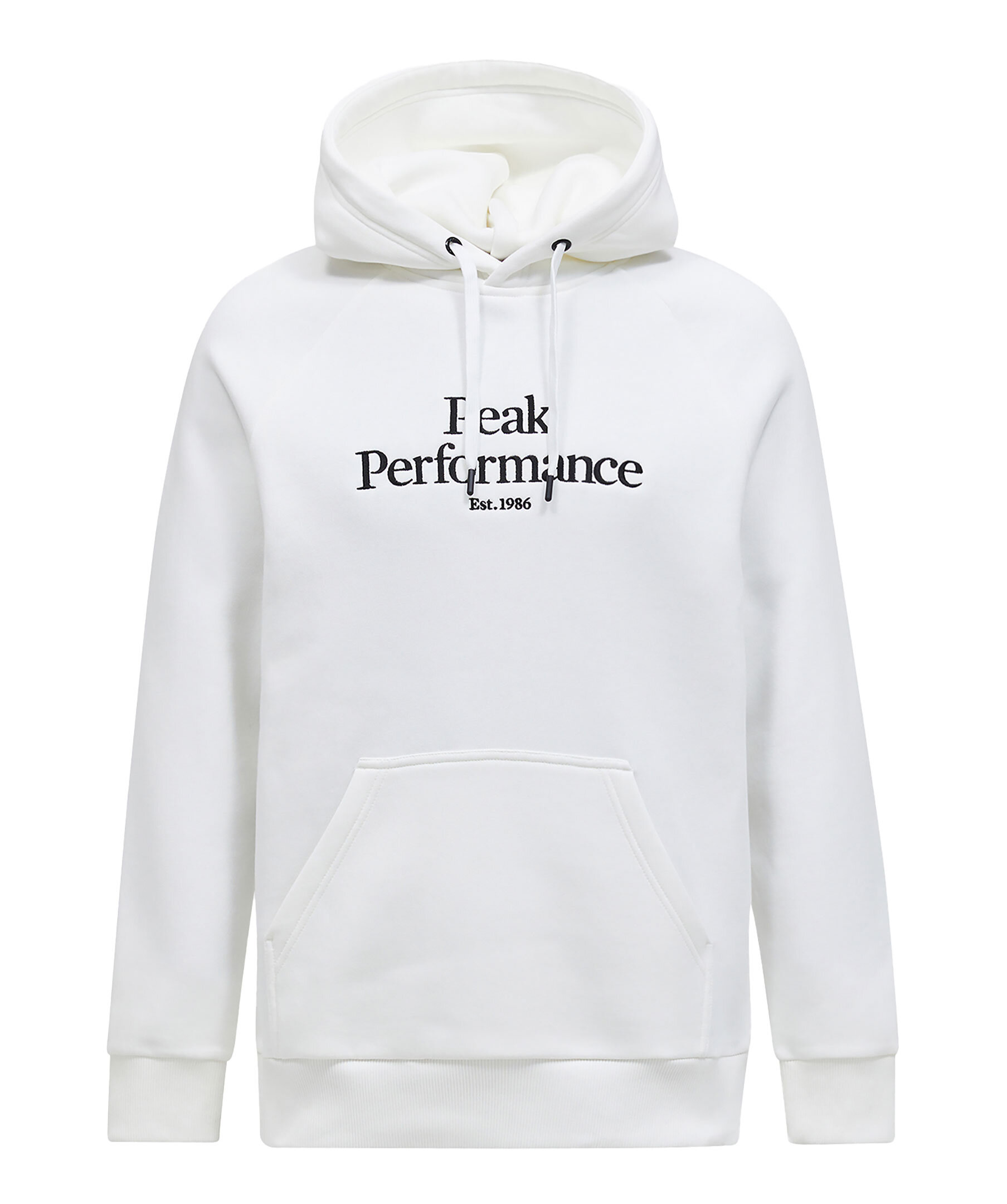Vit hoodie med huva från Peak Performance. Svart broderad logotyp på bröstet. Känguruficka på magen. Snörning i huvan. Ribbade muddar vid ärm- och plaggslut. Tilvlerkad i en bomull- och polyesterblandning. Normal passform.
