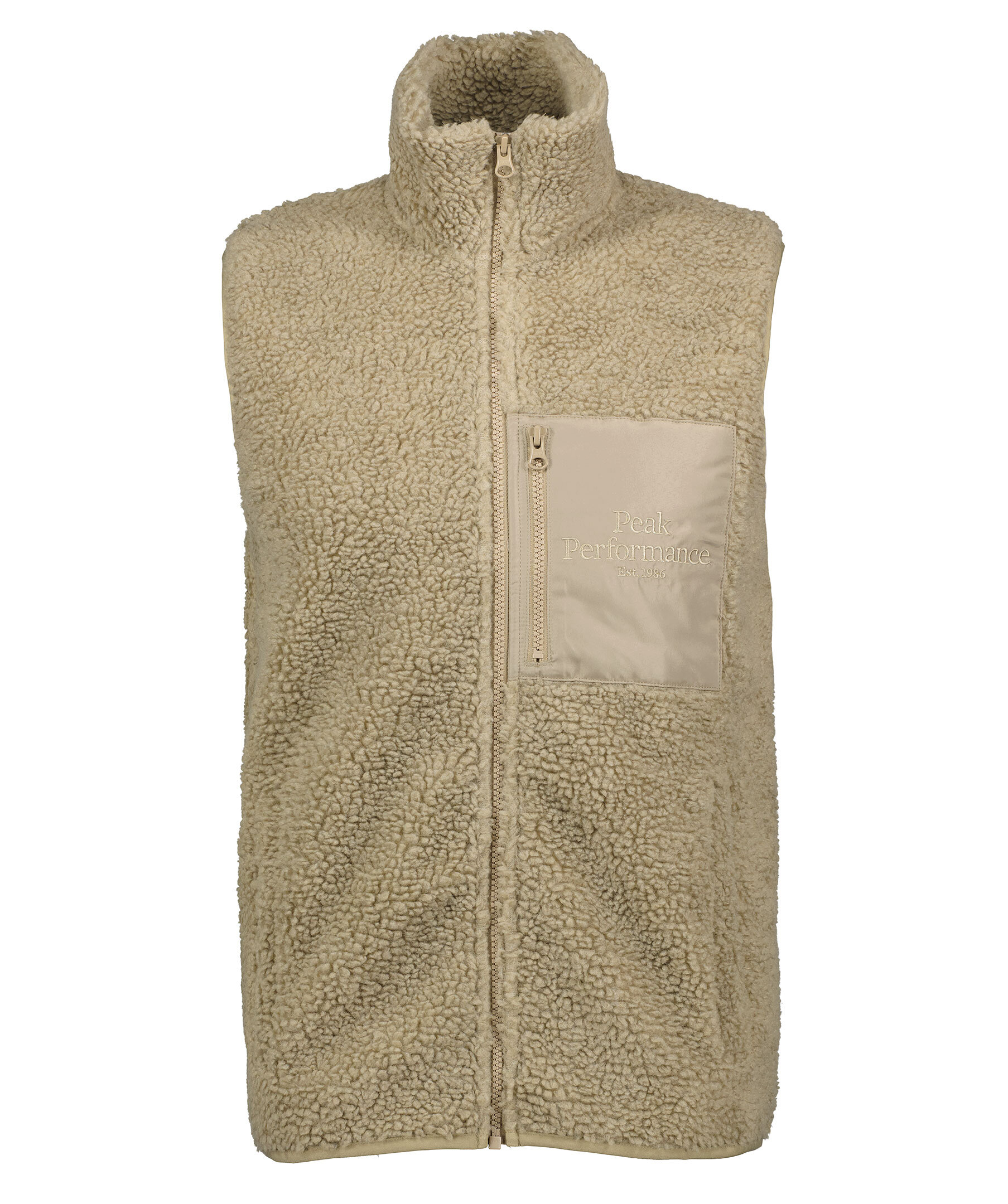 Beige pileväst från Peak Performance. Stängs framtill med dragkedja. Bröstficka i vävt material med broderad logotyp, stängs med dragkedja. Två fickor framtill. Smal elastisk mudd i ärm- och plaggslut.