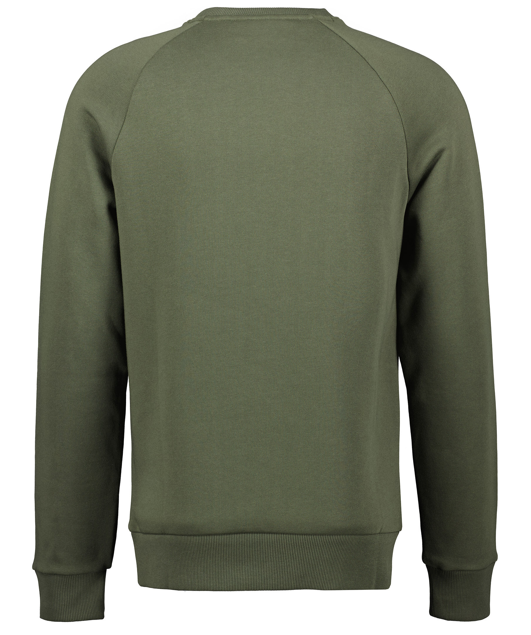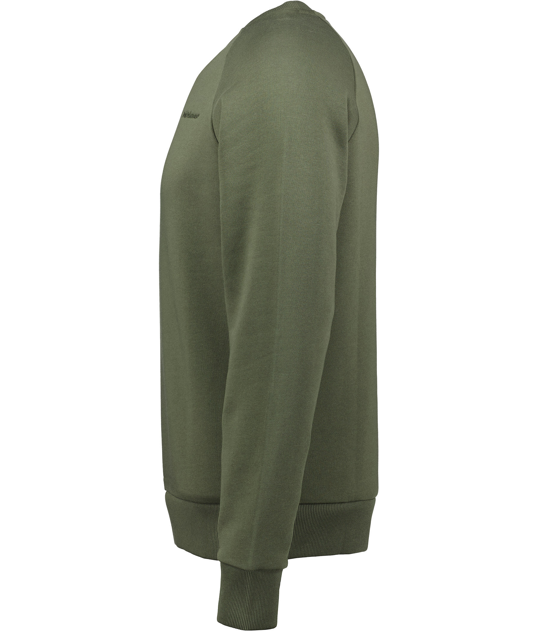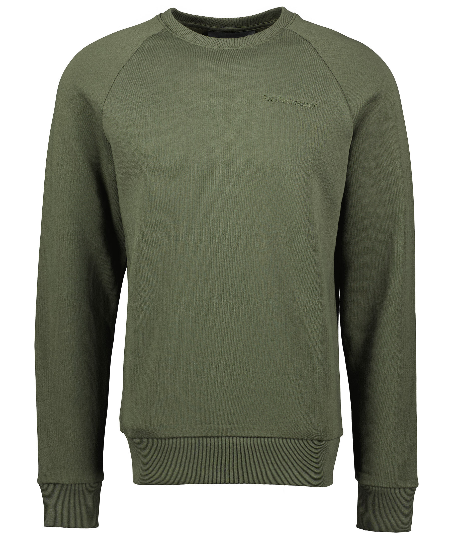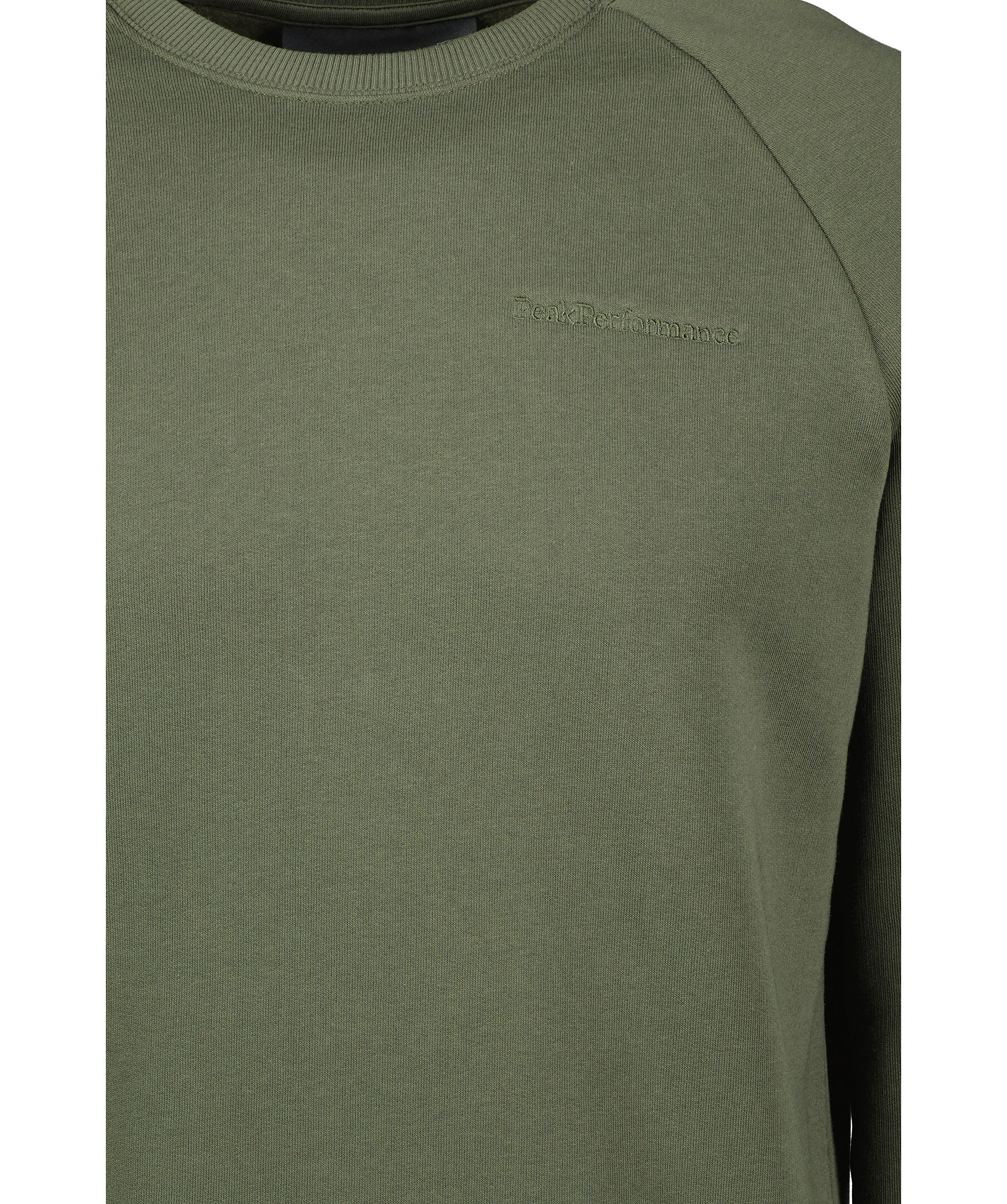 Skogsgrön college tröja från Peak Performance. Broderad logotyp på vänster bröst. Ribbstickade muddar i ärm-, plaggslut och halsringning. Borstad insida. Tillverkad i bomullsblandning.
