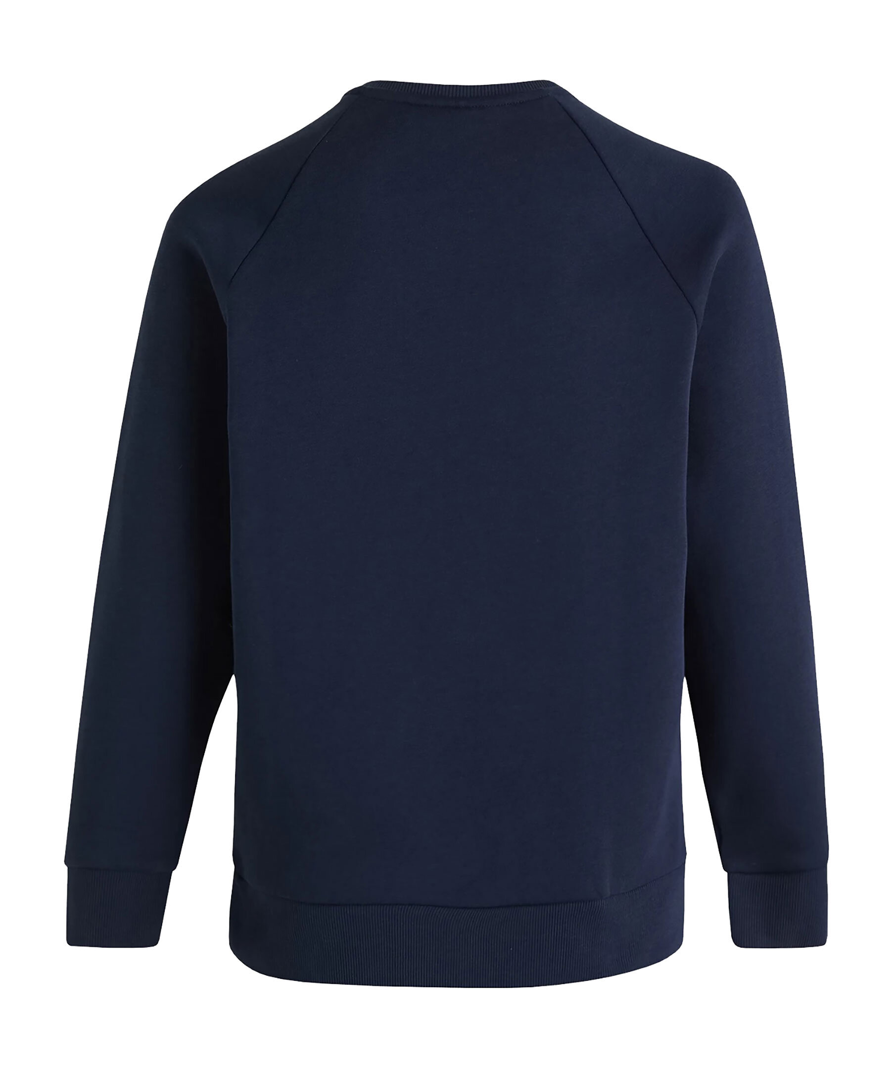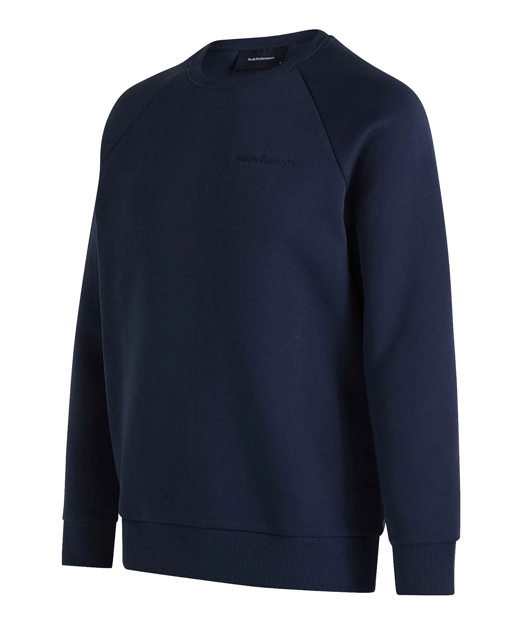 Marinblå sweatshirt från Peak Performance. Tyget är tillverkad av en jerseyblandning av ekologisk bomull och återvunnen polyester med en borstad insida vilket gör att den känns otroligt mjuk och skön. Rundad halsringning med tunn ribbad kant samt ribbade muddar i ärmslut och plaggslut. Diskret, broderad logtoyp i ton-i-ton på vänster sida av bröstet.