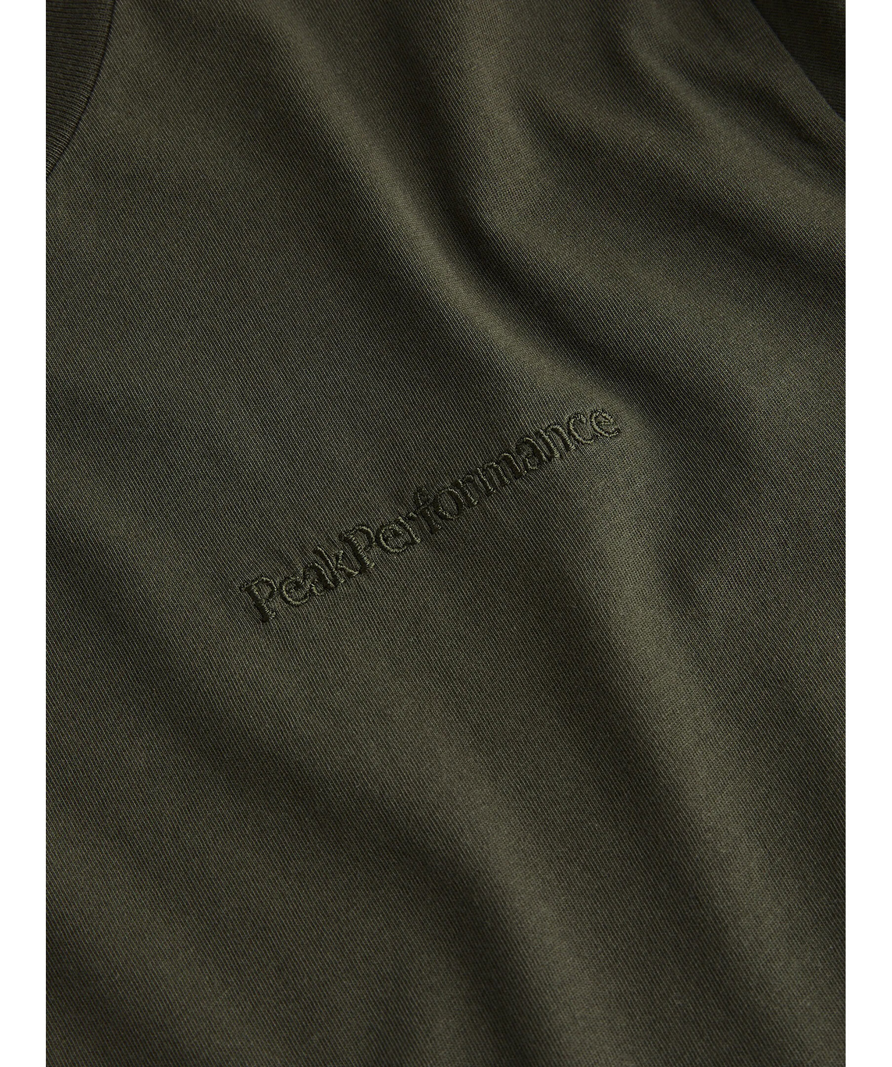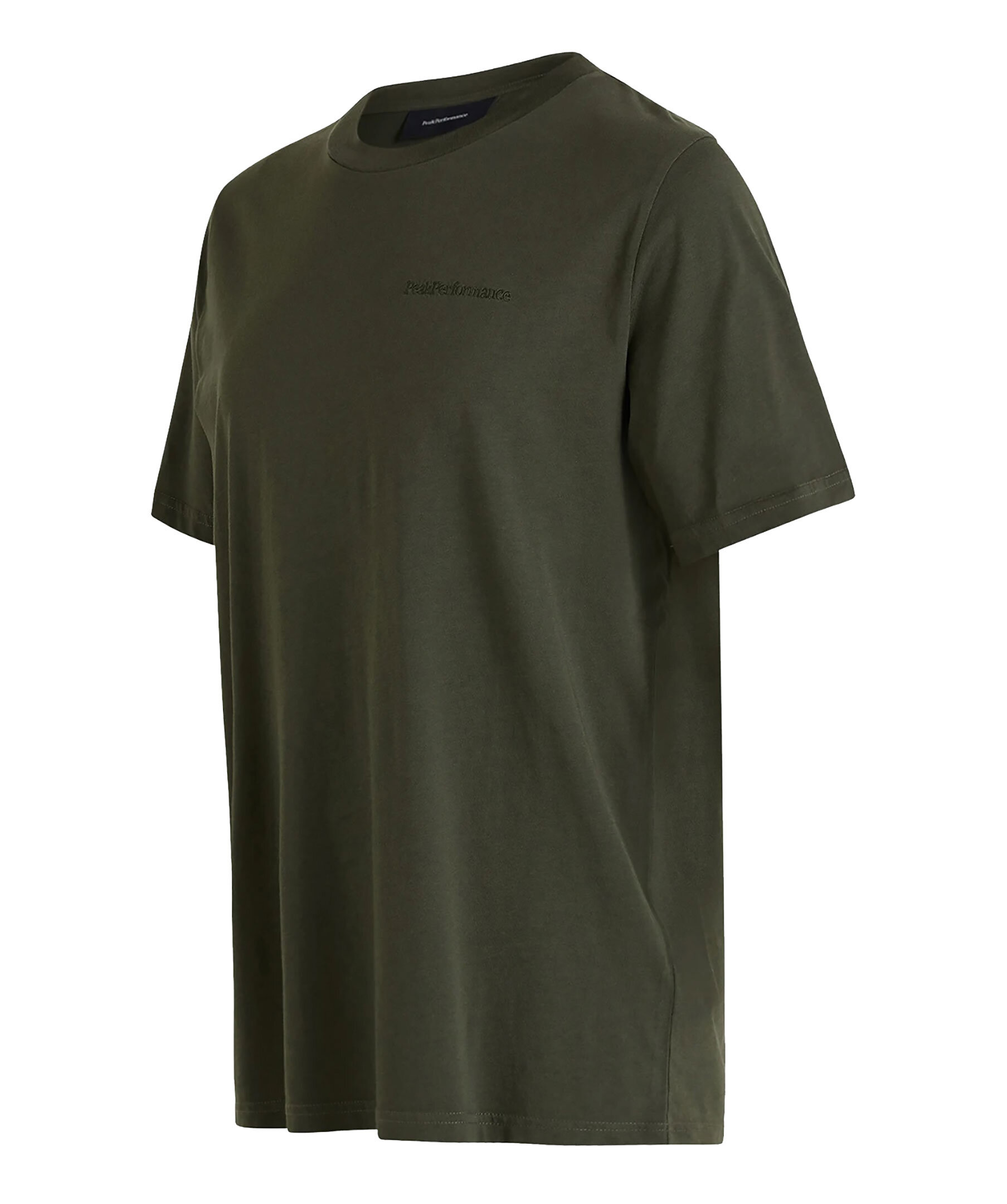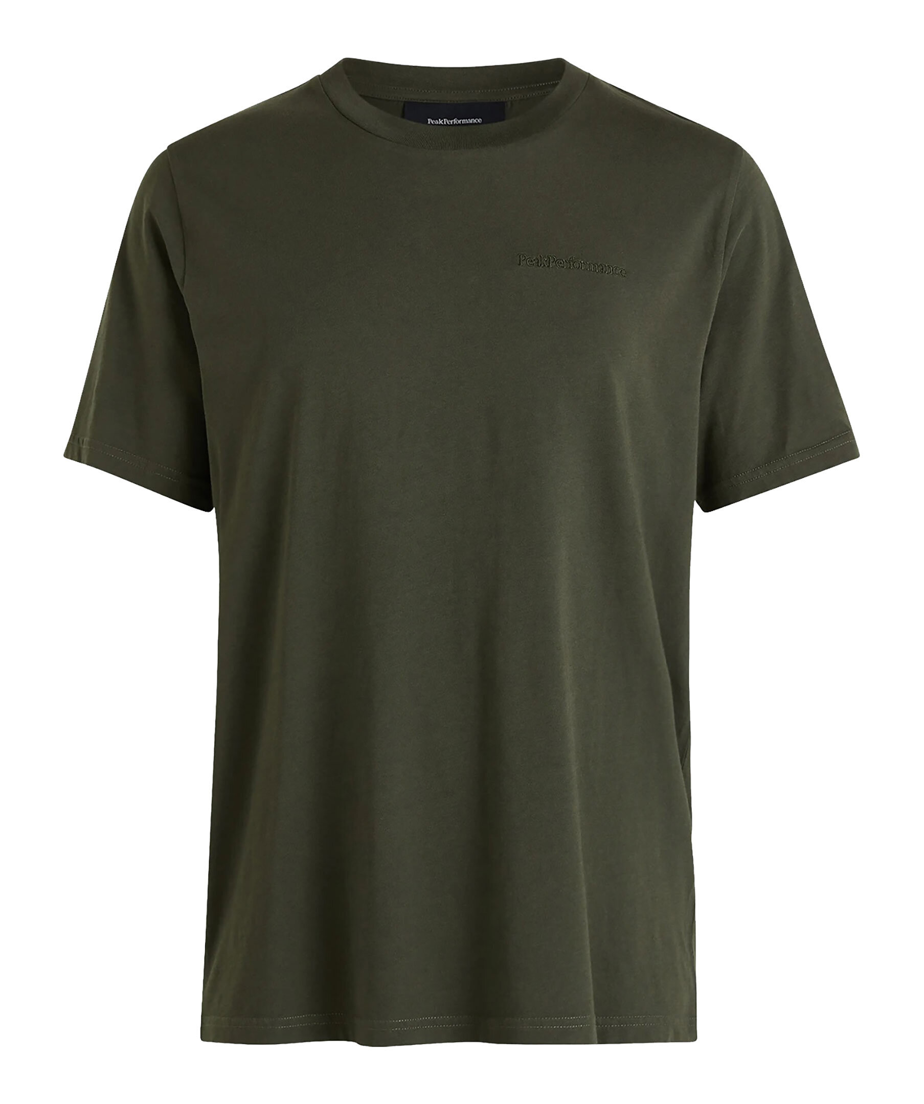 Mossgrön t-shirt från Peak Performance. 100% ekologisk med tyg av högkvalitativ bomullsjersey som gör att den känns otroligt mjuk och skön. Rundad halsringning med tunn ribbning och ton-i-ton broderad logotyp på vänster sida på bröstet.