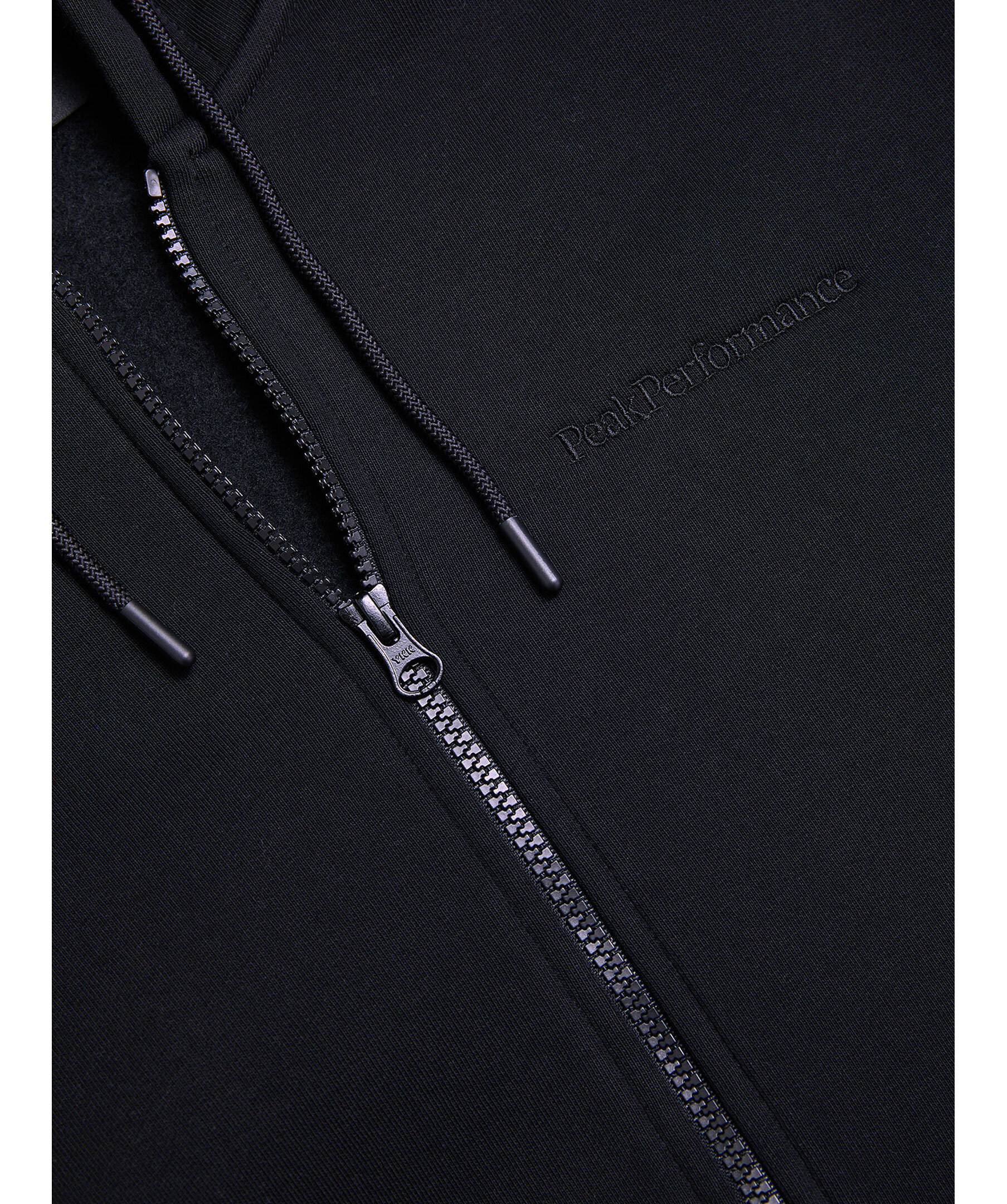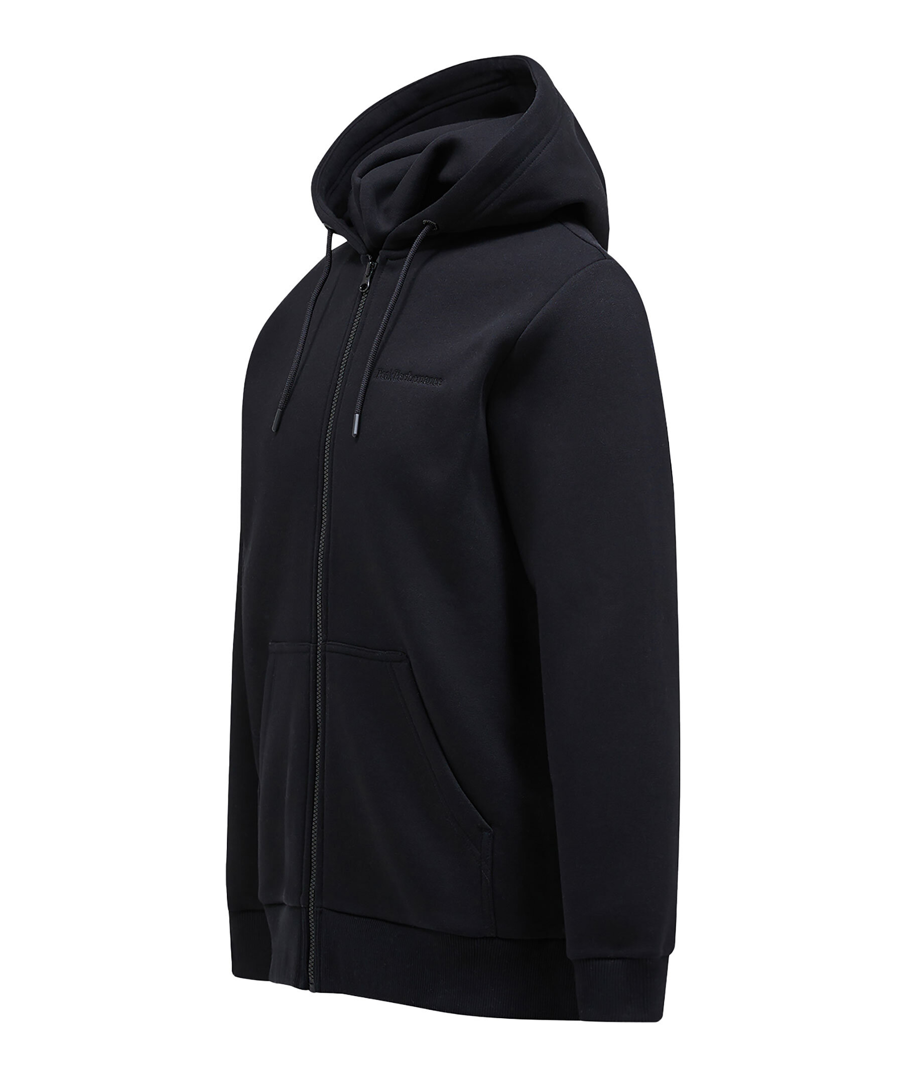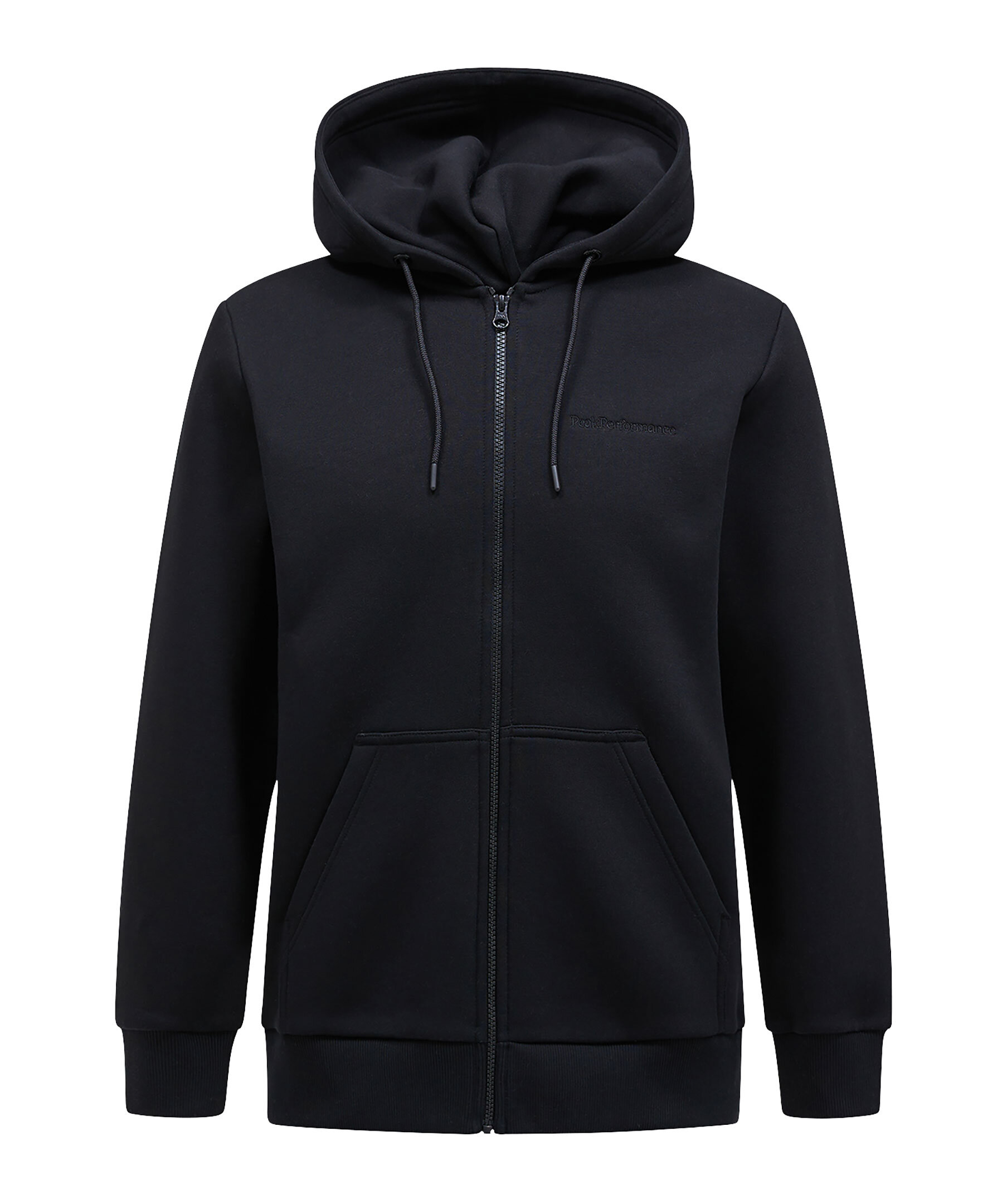 Svart zip-up hoodie från Peak Performance. Den här klassiska hoodien med dragkedja är tillverkad från deras egen ikoniska bomullsjerseyblandning, som numera är 100 % ekologisk! Den mjuka borstade insidan känns fantastisk för vardagsanvändning. Liten ton-i-ton logotyp på bröstet. Hoodien har sidfickor. Normal passform.