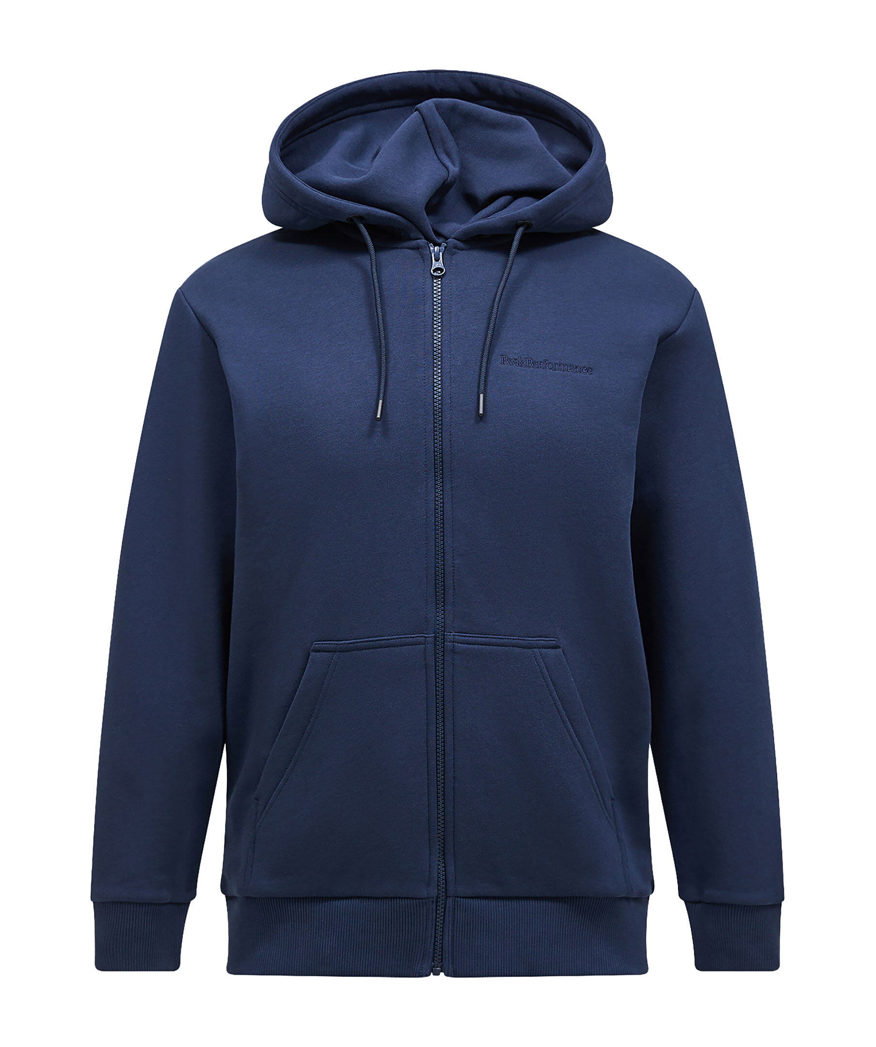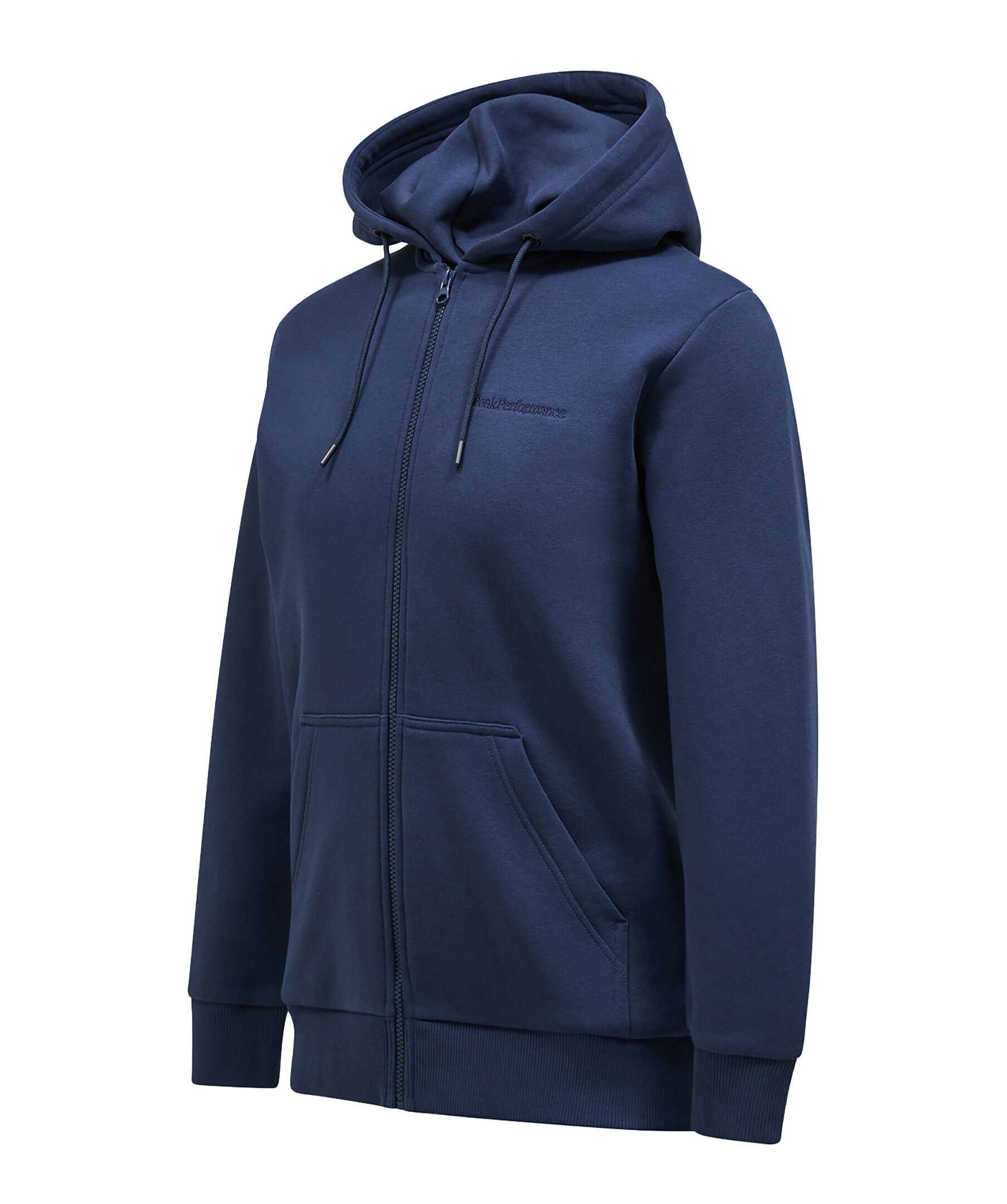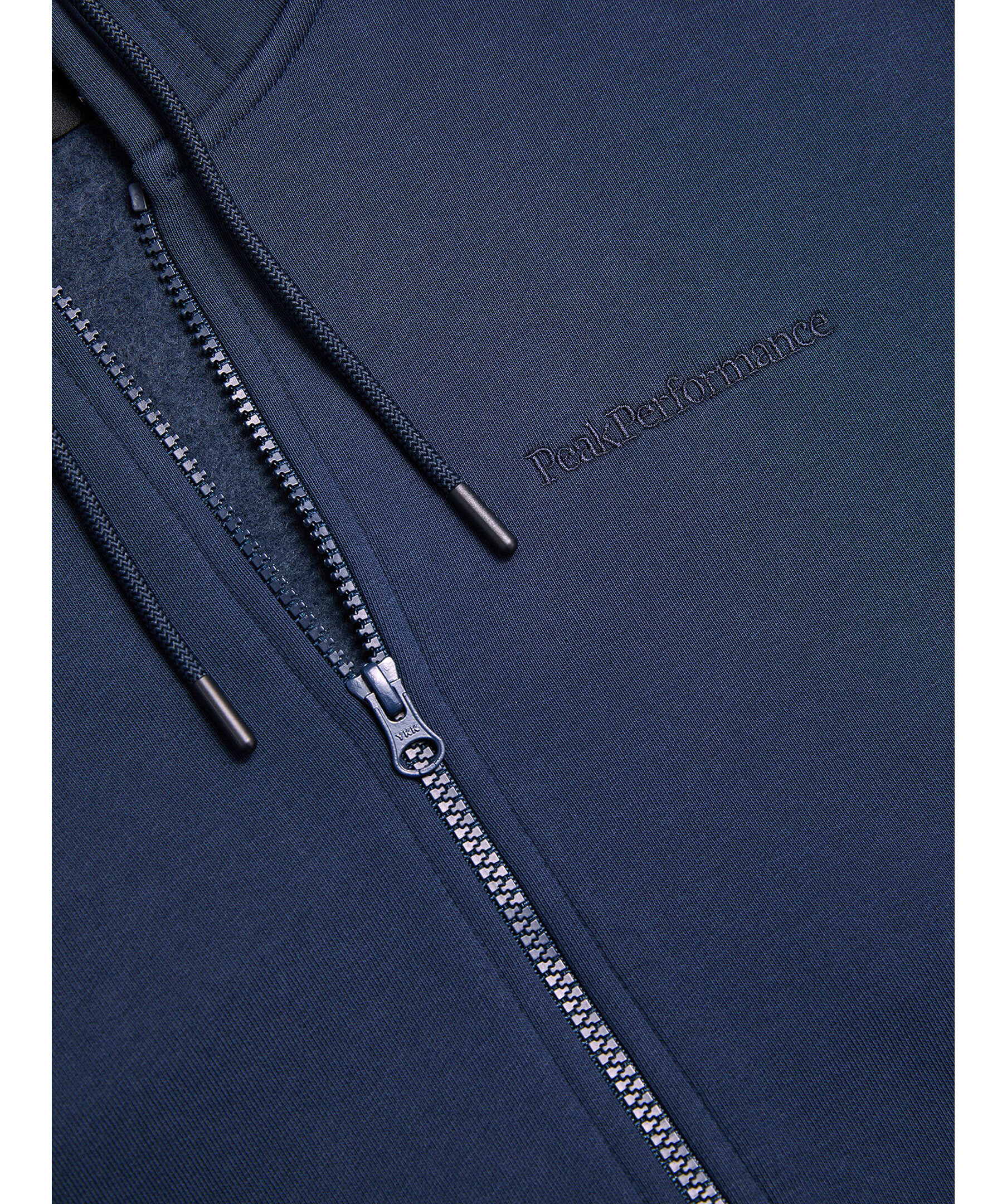 Mörkblå zip-up hoodie från Peak Performance. Den här klassiska hoodien med dragkedja är tillverkad från deras egen ikoniska bomullsjerseyblandning, som numera är 100 % ekologisk! Den mjuka borstade insidan känns fantastisk för vardagsanvändning. Liten ton-i-ton logotyp på bröstet. Hoodien har sidfickor. Normal passform.