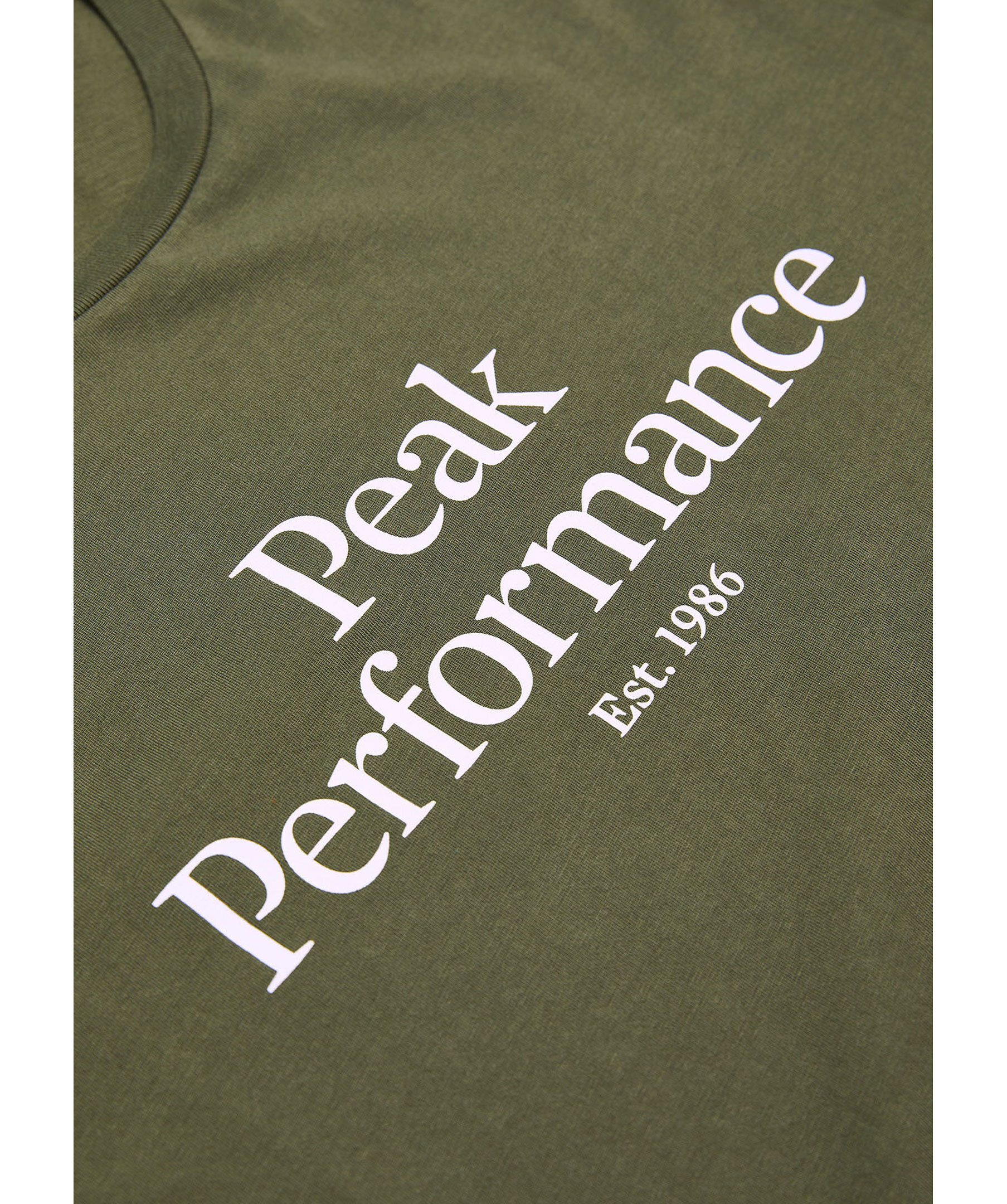 Mörkgrön T-shirt med tryck från Peak Performance. T-shirten har ribbstickad rundad halsringning. Tryck på bröstet med logotyp. Tillverkad av bomull.